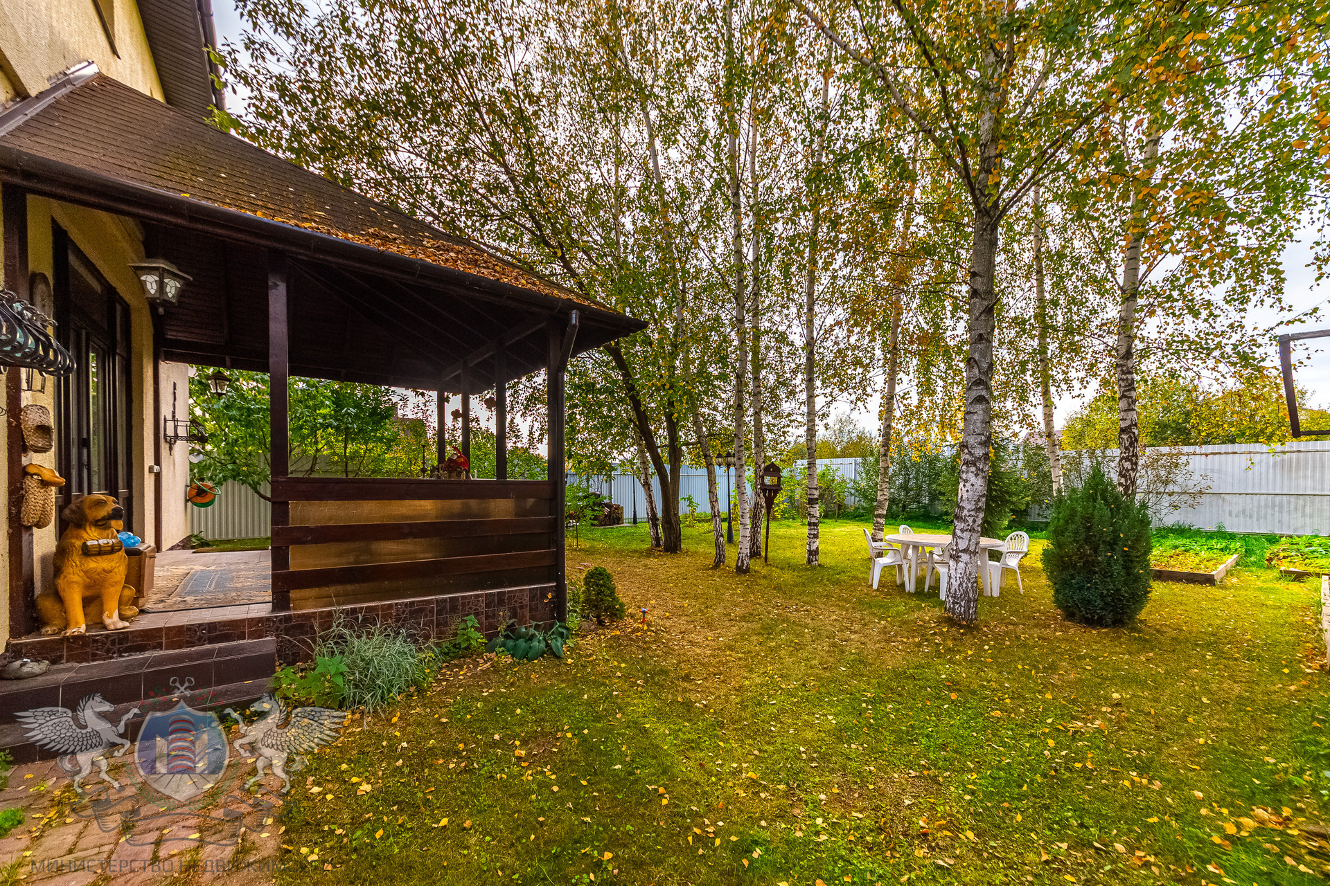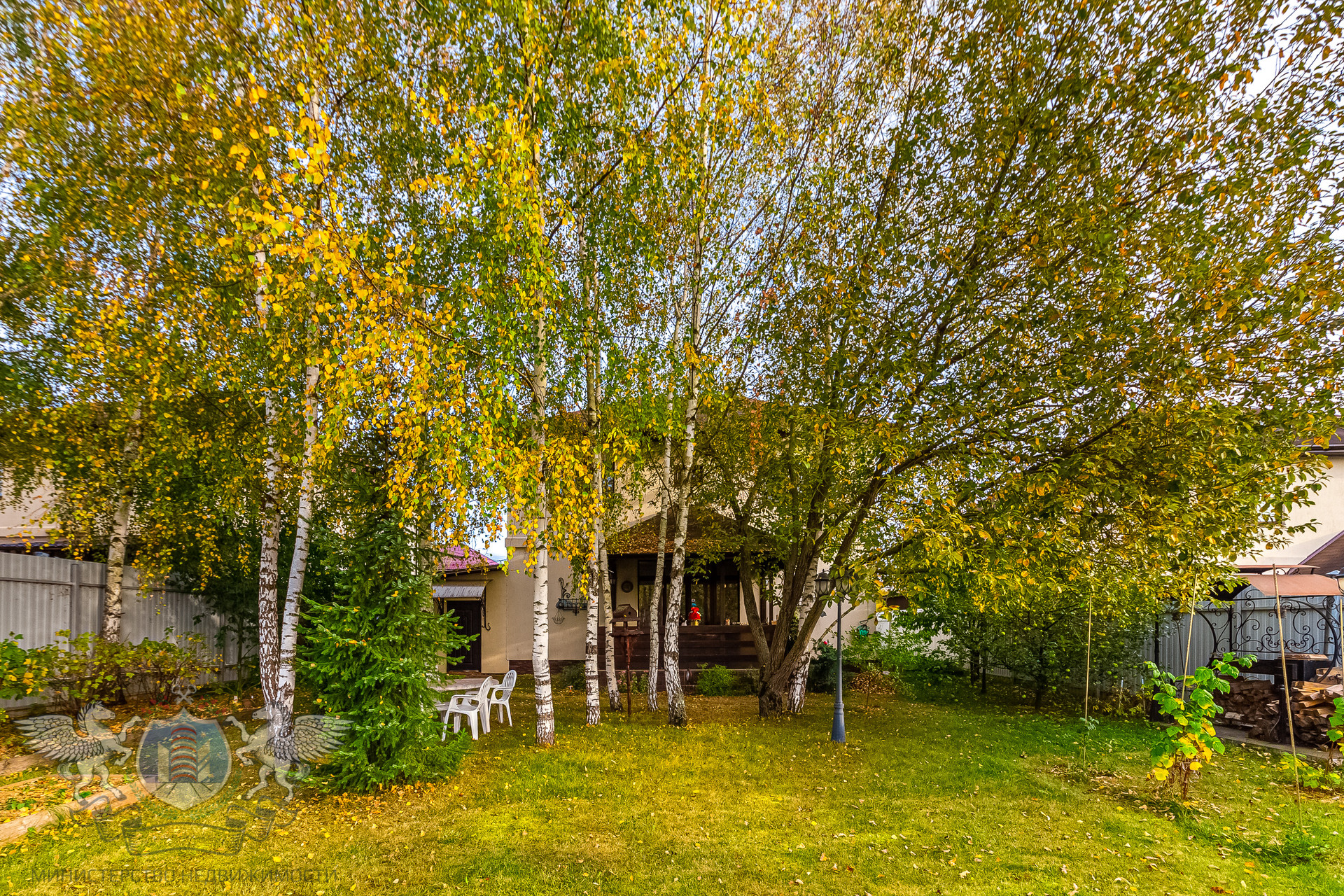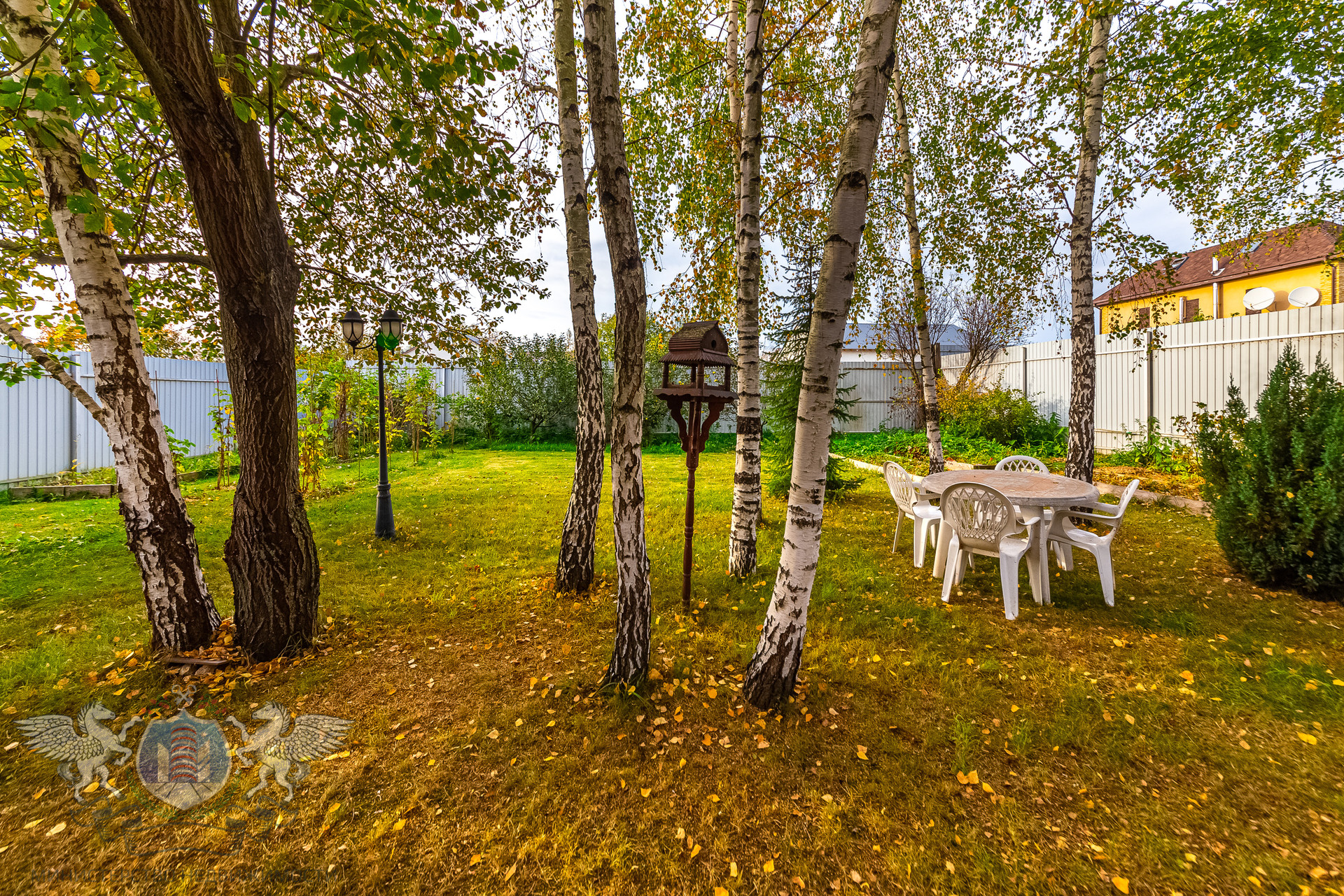 Участок правильной геометрии, ровный, сухой, огорожен забором. На участке посажены плодовые деревья, кустарники, березы и туи.
