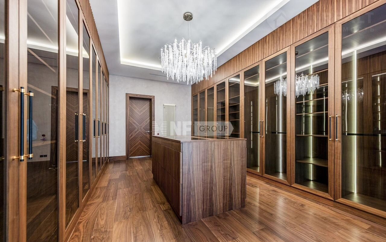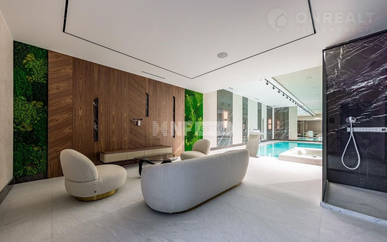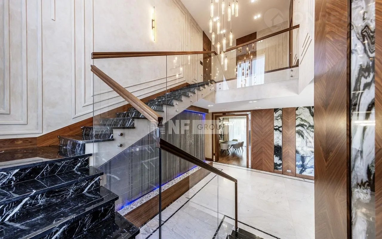 На первом этаже вас встречает светлая прихожая с гардеробной, просторная гостиная, объединённая с кухней и столовой. Здесь же расположены уютный кабинет, приватная спальня с собственным санузлом и гардеробной, а также полноценная зона отдыха с бассейном, сауной и хаммамом, постирочной и удобным санузлом. Второй этаж — это приватная зона, включающая три спальни, каждая со своим санузлом и гардеробной.