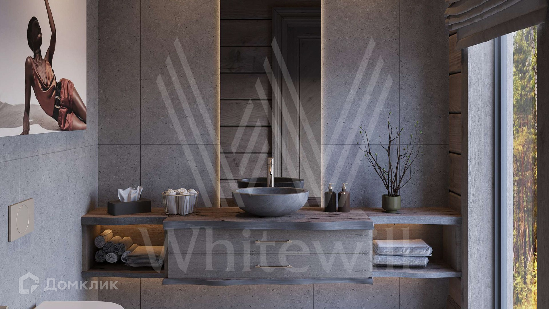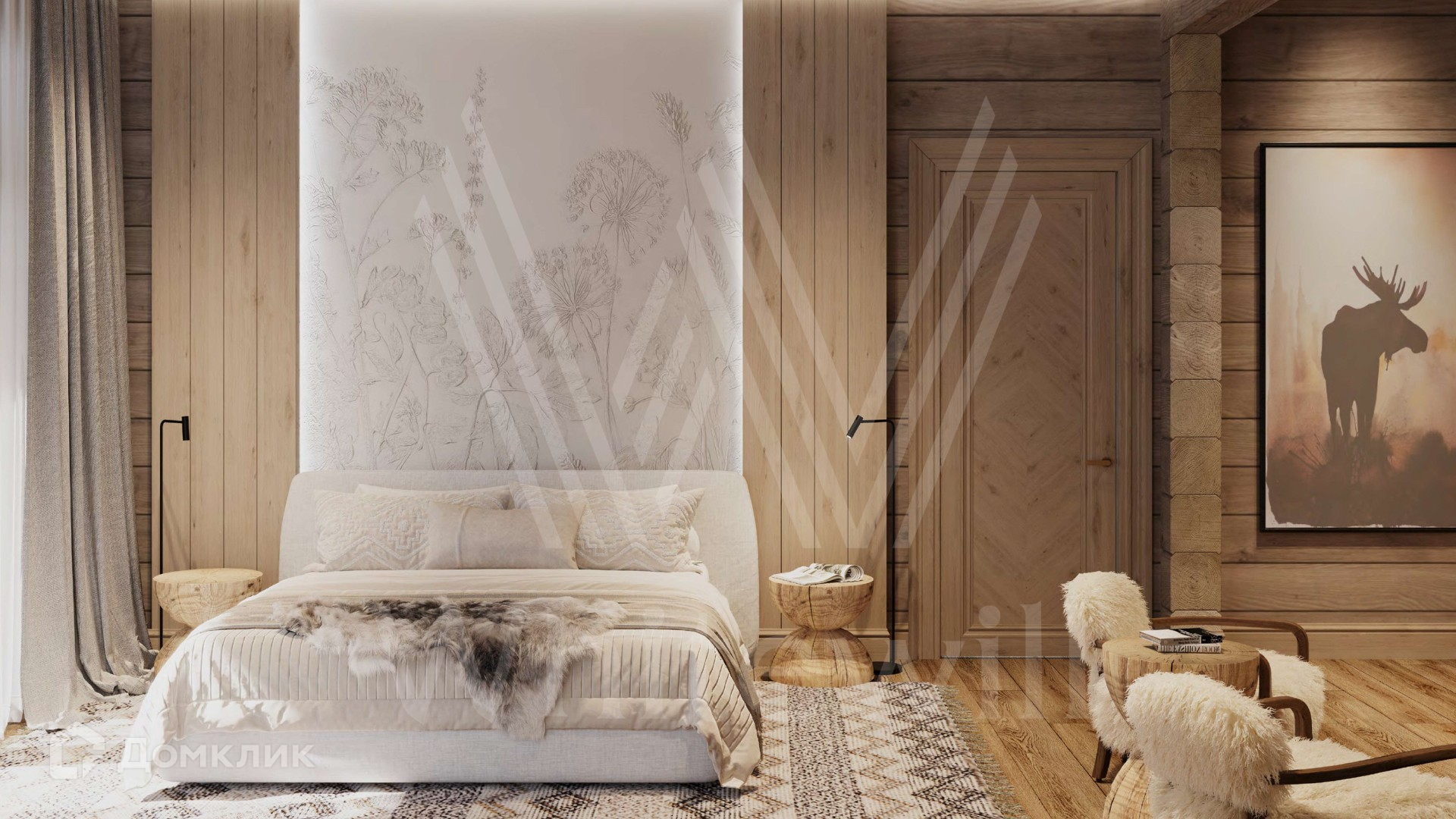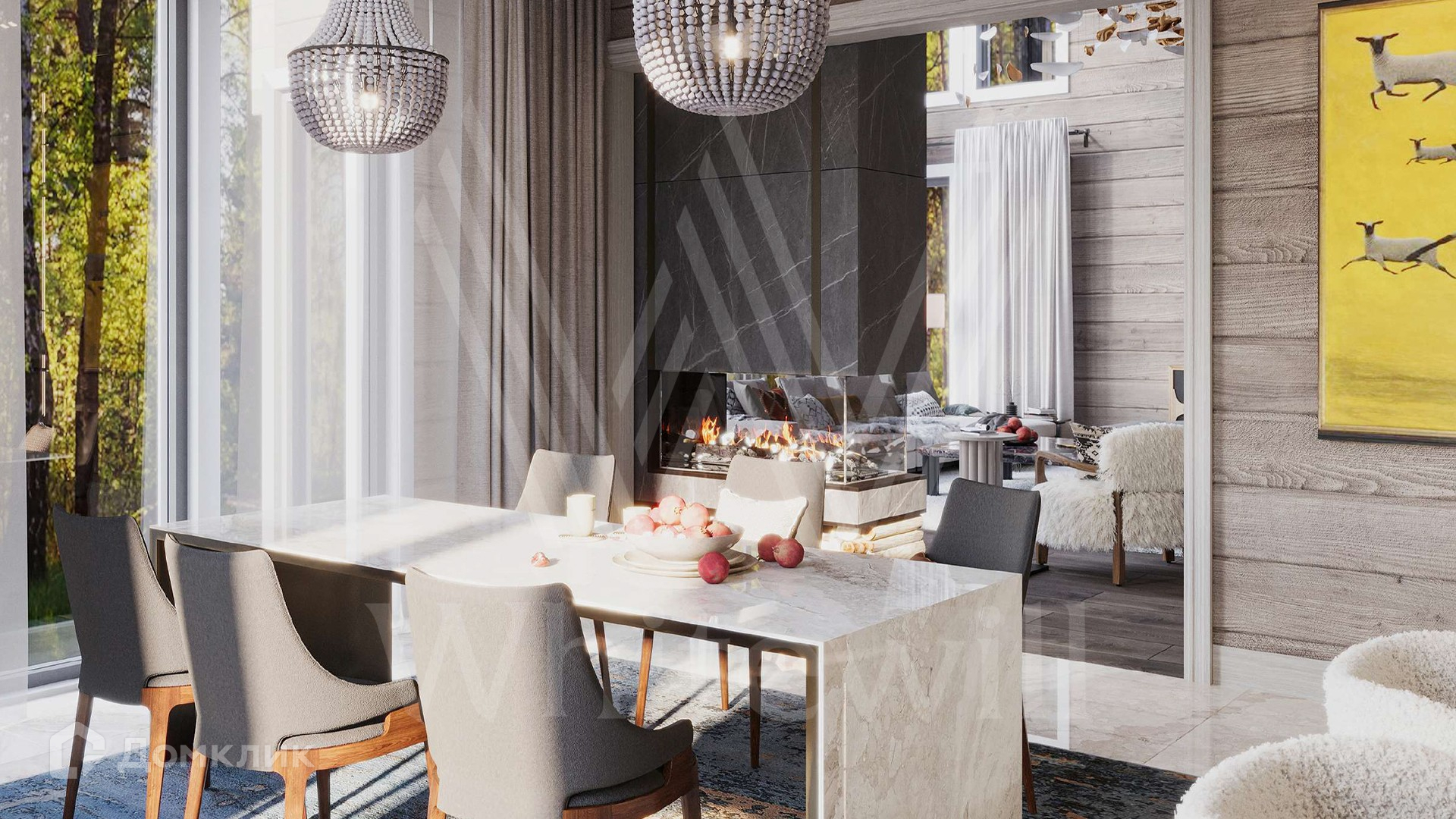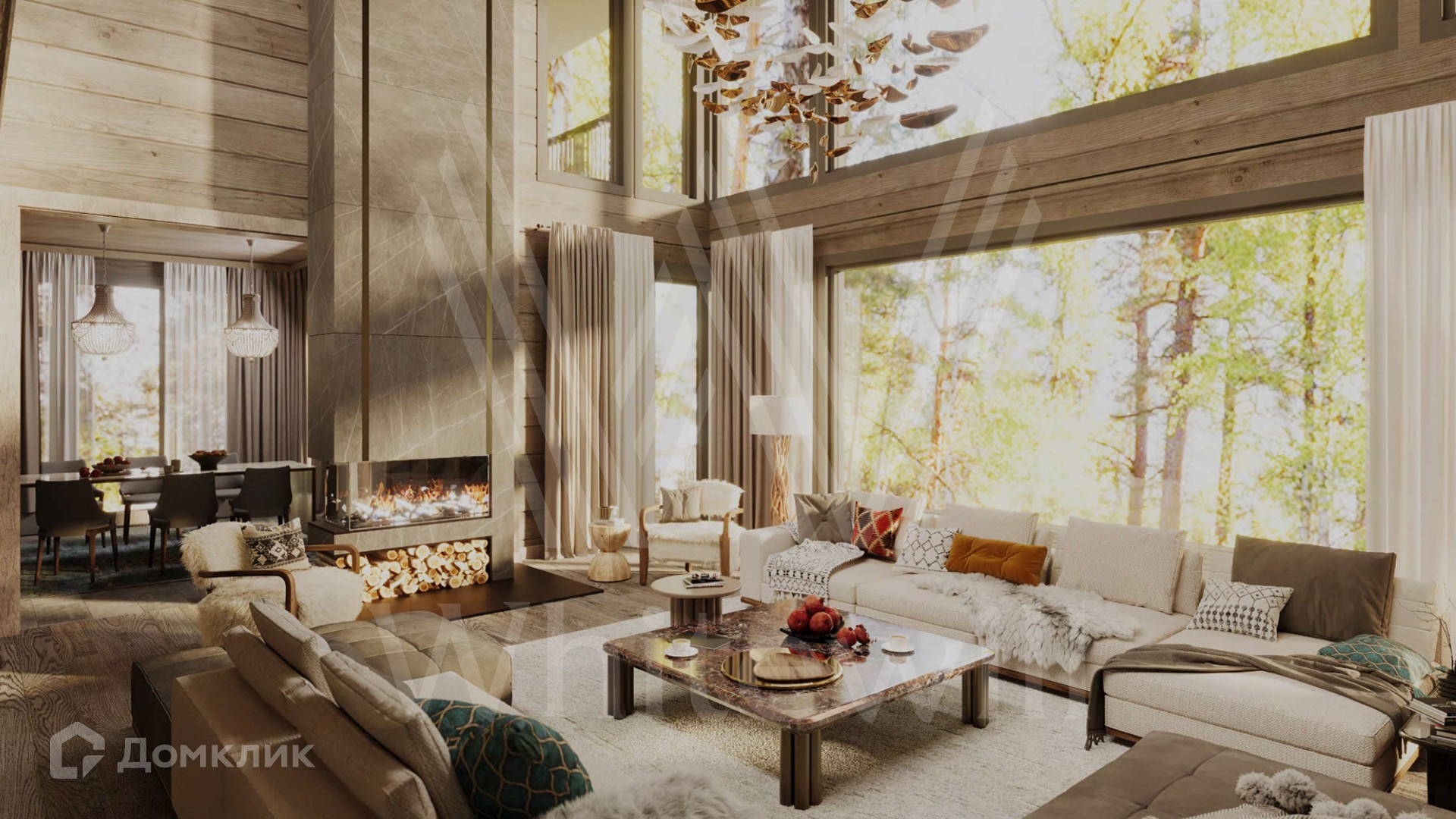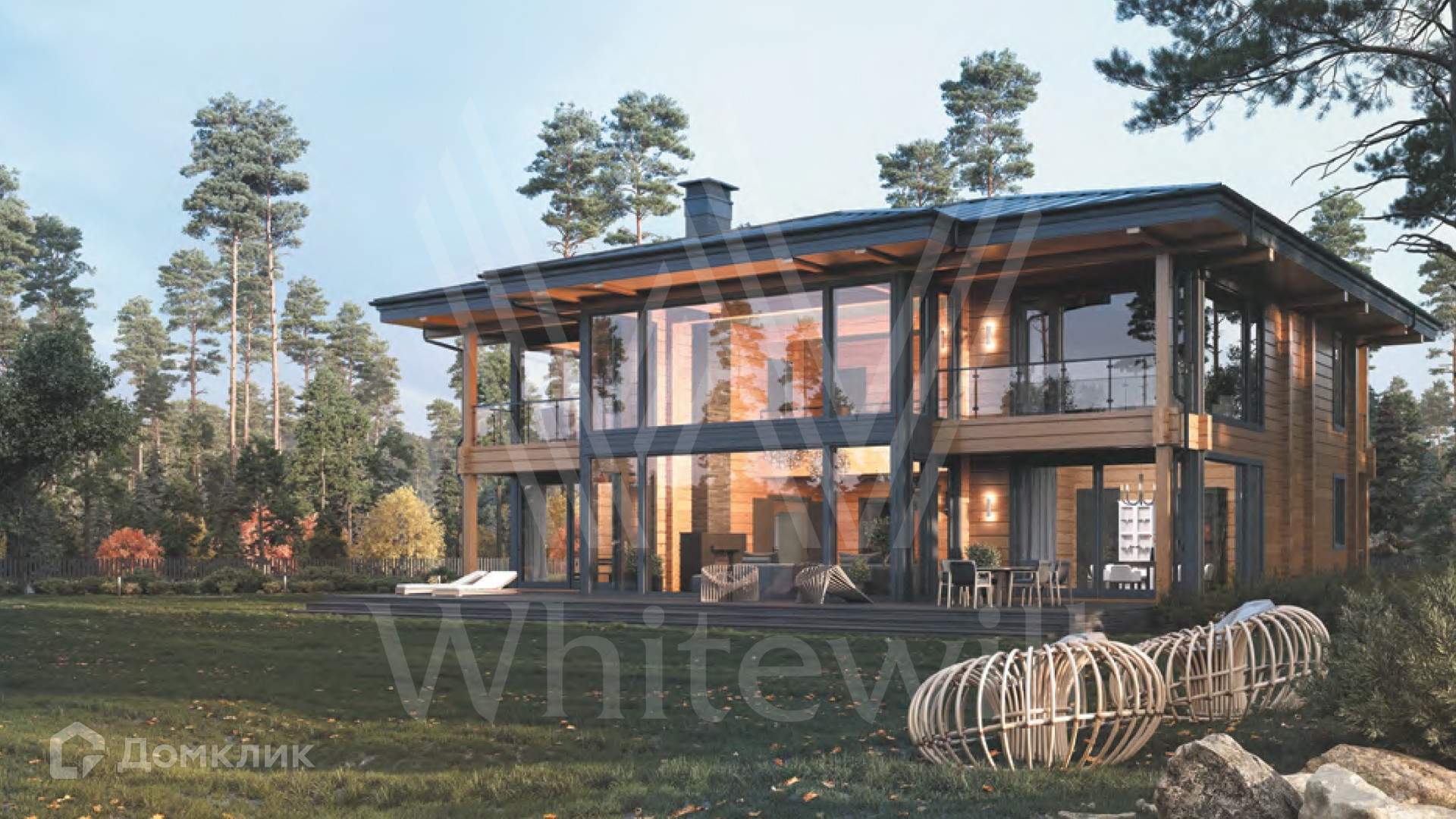 ID 12 211. Залесье. Загородный дом по проекту «Весна» площадью 550 м² расположен на участке 25,4 сотки в реликтовом лесу. Фасад здания с большими панорамными окнами выполнен из клееного бруса увеличенного размера и декорирован подсветкой. В отделке современного интерьера сохранена фактура дерева, создающая домашний уют. Резиденция включает 4 спальни, просторную гостиную с камином и вторым светом, кухню-столовую и террасу, на которой можно обустроить зону барбекю. На участке выполнен ландшафтный дизайн в стиле английского сада.