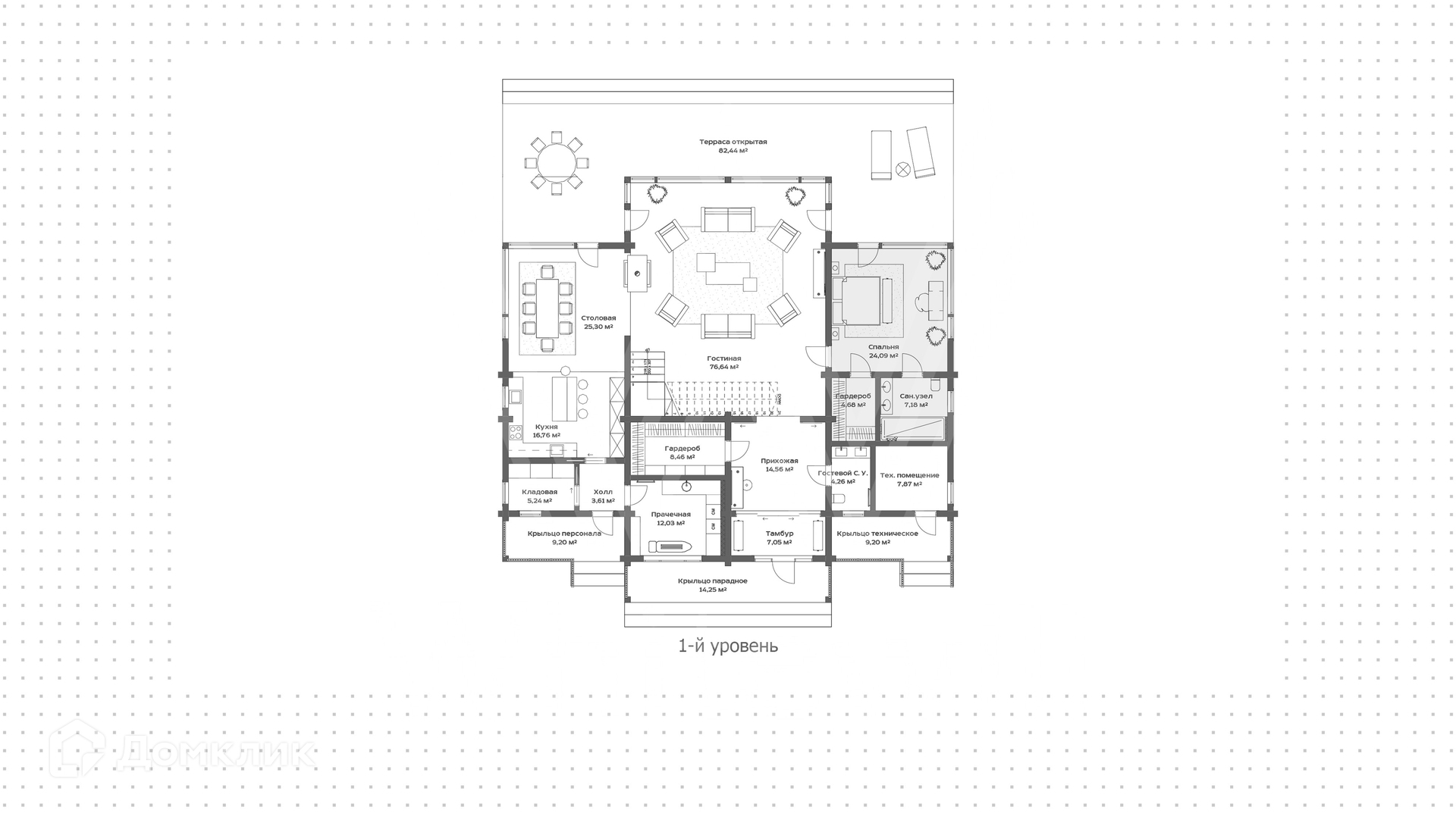 1-й уровень: тамбур, прихожая, гардеробная, гостевой санузел, гостиная, спальня с гардеробной и санузлом, кухня-столовая, прачечная, кладовая, техническое помещение, терраса.