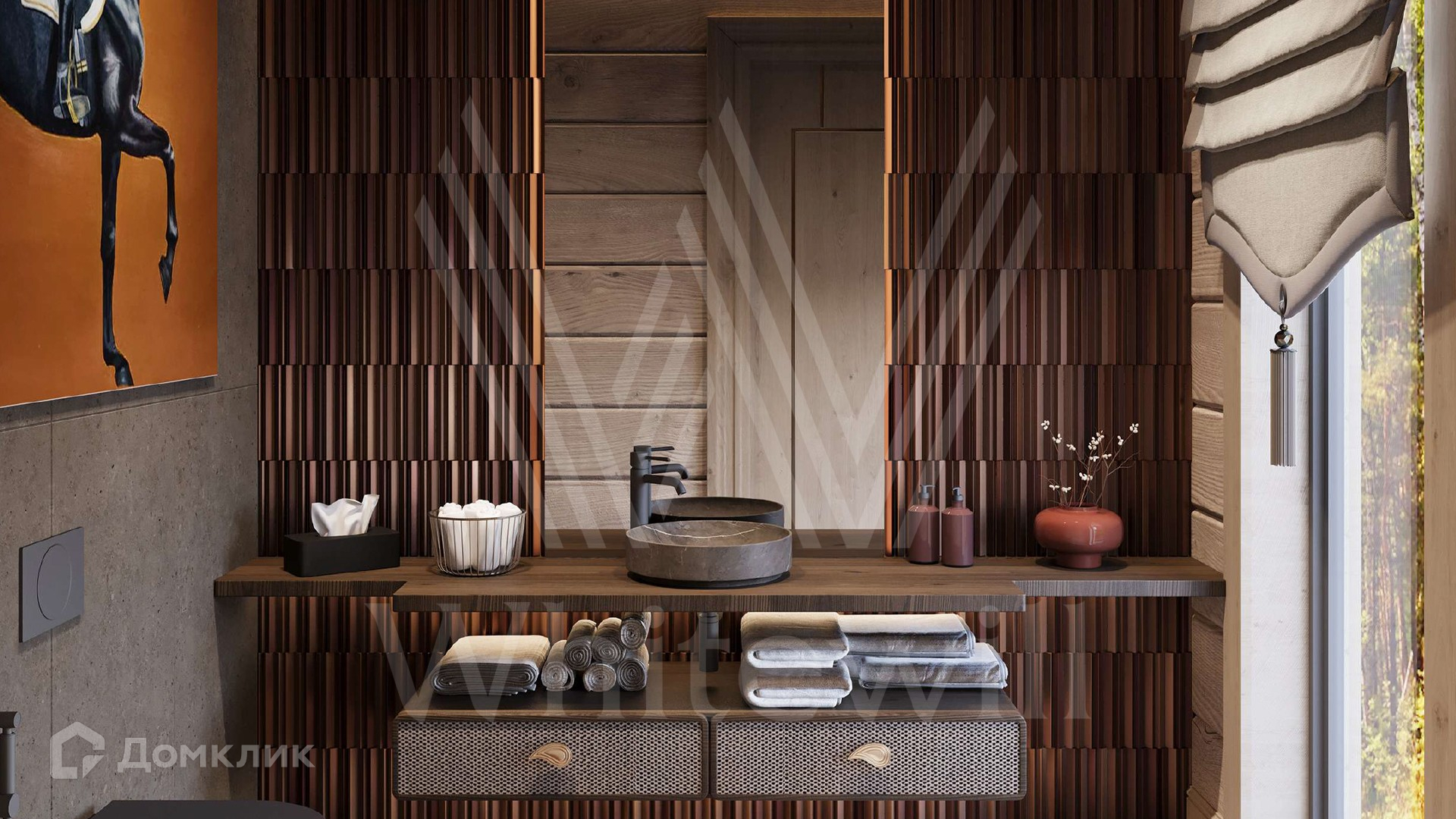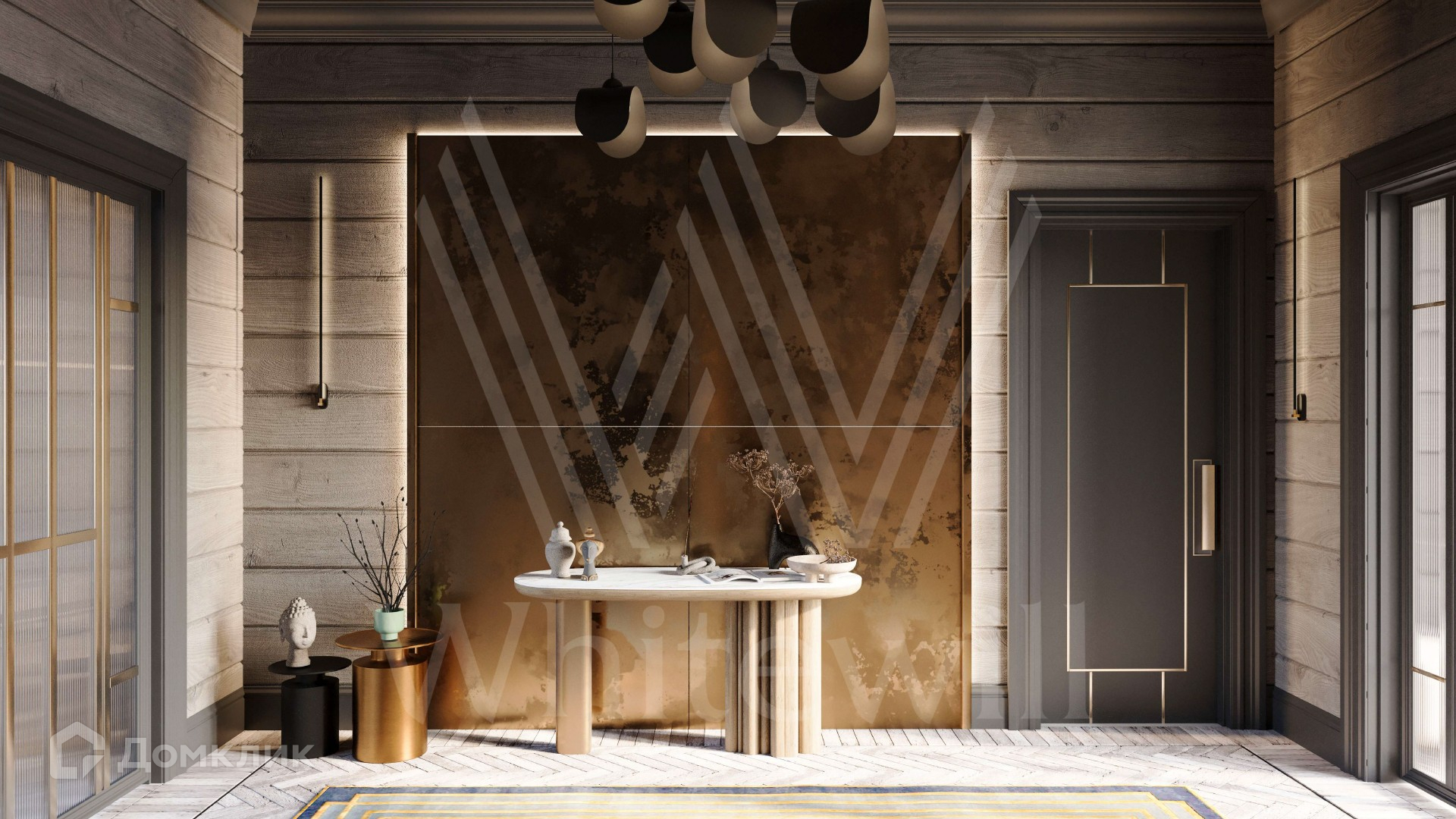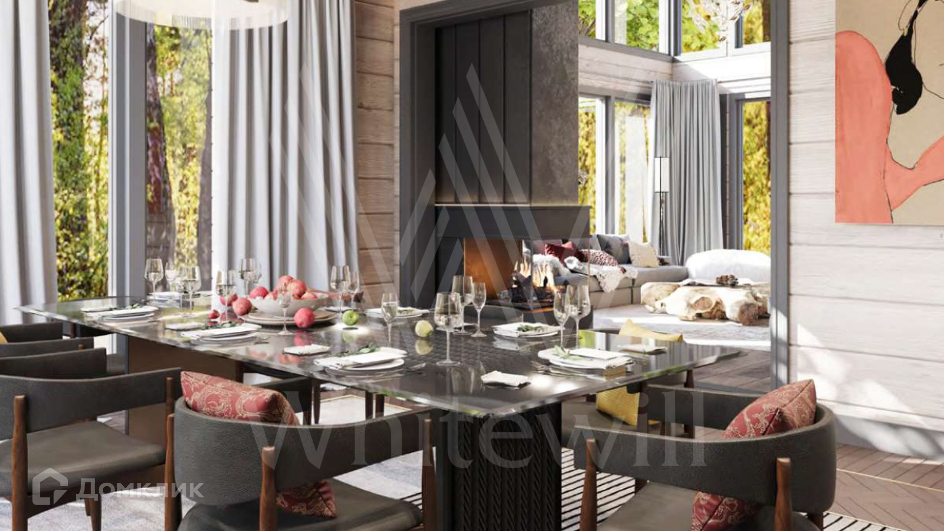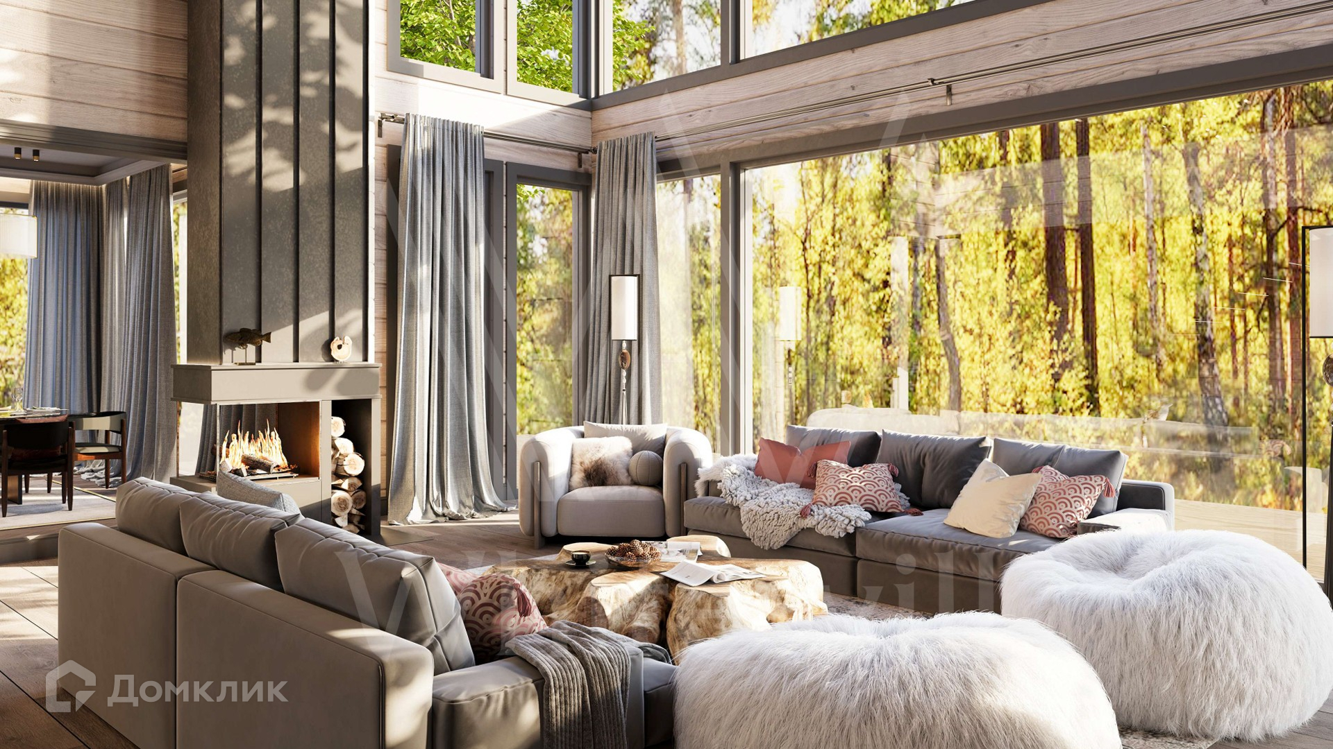 ID 12 216. Залесье. Загородный дом по проекту «Лето» площадью 550 м² расположен на участке 28,4 сотки в реликтовом лесу. Фасад здания с большими панорамными окнами выполнен из клееного бруса увеличенного размера и декорирован подсветкой. В отделке современного интерьера сохранена фактура дерева, создающая домашний уют. Резиденция включает 5 спален, просторную гостиную с камином и вторым светом, кухню-столовую и террасу, на которой можно обустроить зону барбекю. На участке выполнен ландшафтный дизайн в стиле английского сада.