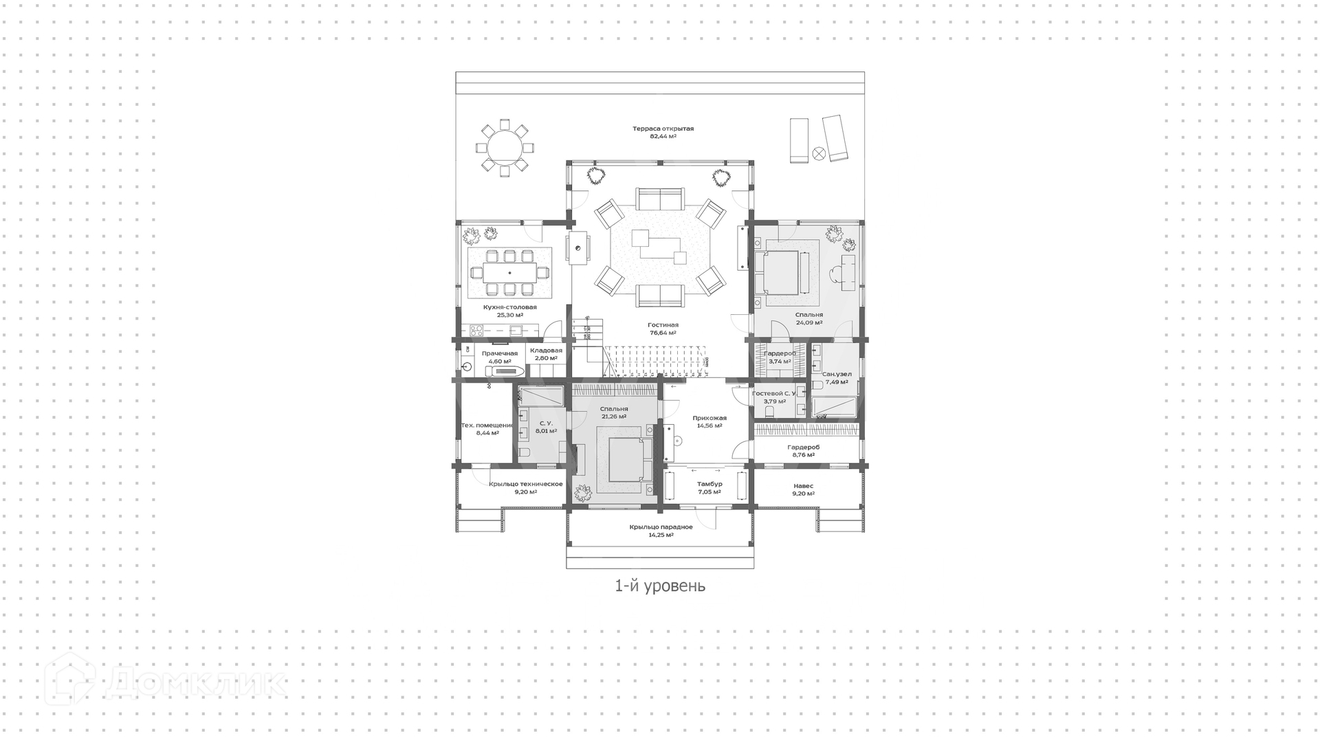 1-й уровень: тамбур, прихожая, гардеробная, гостевой санузел, спальня с санузлом, гостиная, спальня с гардеробной и санузлом, кухня-столовая, прачечная, кладовая, техническое помещение, терраса.