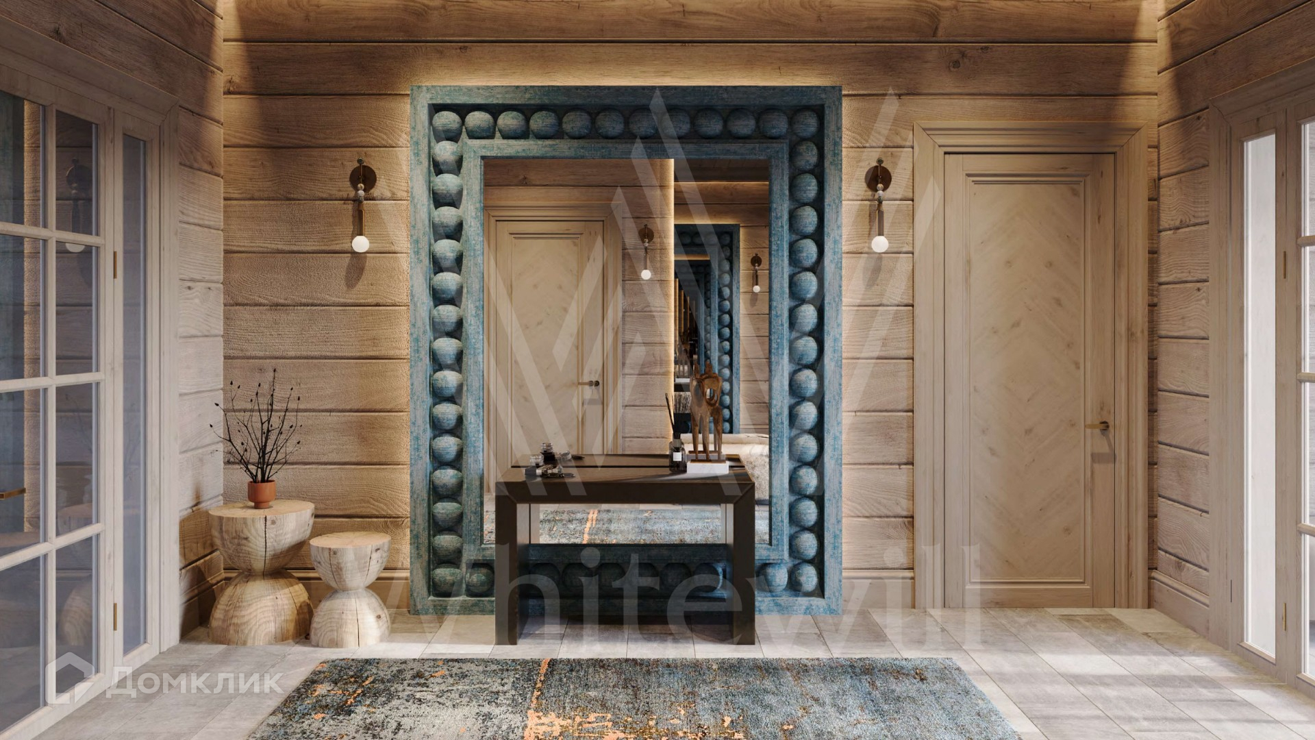 ID 12 213. Залесье. Загородный дом по проекту «Весна» площадью 550 м² расположен на участке 22,6 сотки в реликтовом лесу. Фасад здания с большими панорамными окнами выполнен из клееного бруса увеличенного размера и декорирован подсветкой. В отделке современного интерьера сохранена фактура дерева, создающая домашний уют. Резиденция включает 4 спальни, просторную гостиную с камином и вторым светом, кухню-столовую и террасу, на которой можно обустроить зону барбекю. На участке выполнен ландшафтный дизайн в стиле английского сада.