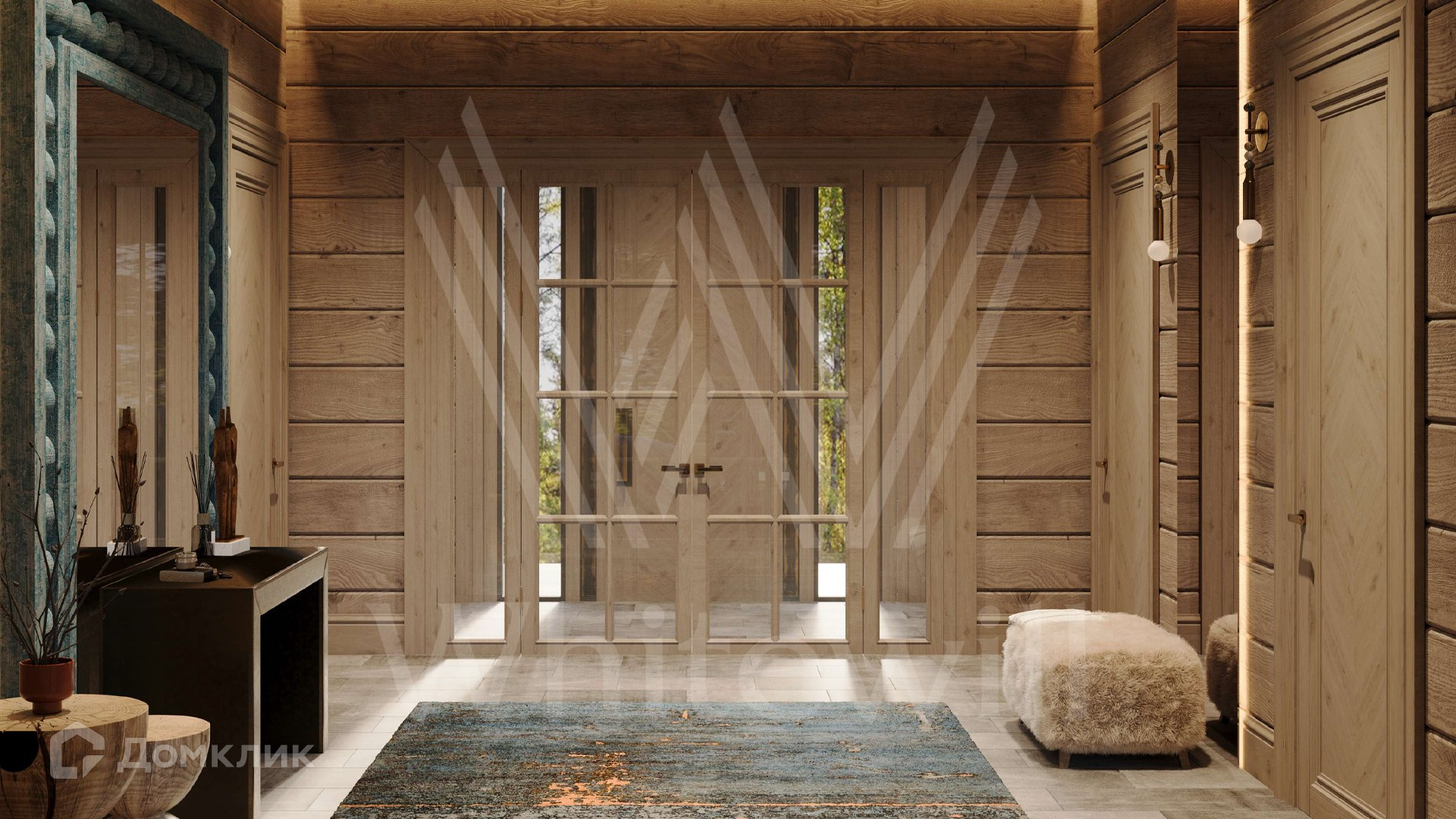 ID 12 212. Залесье. Загородный дом по проекту «Весна» площадью 550 м² расположен на участке 22,3 сотки в реликтовом лесу. Фасад здания с большими панорамными окнами выполнен из клееного бруса увеличенного размера и декорирован подсветкой. В отделке современного интерьера сохранена фактура дерева, создающая домашний уют. Резиденция включает 4 спальни, просторную гостиную с камином и вторым светом, кухню-столовую и террасу, на которой можно обустроить зону барбекю. На участке выполнен ландшафтный дизайн в стиле английского сада.