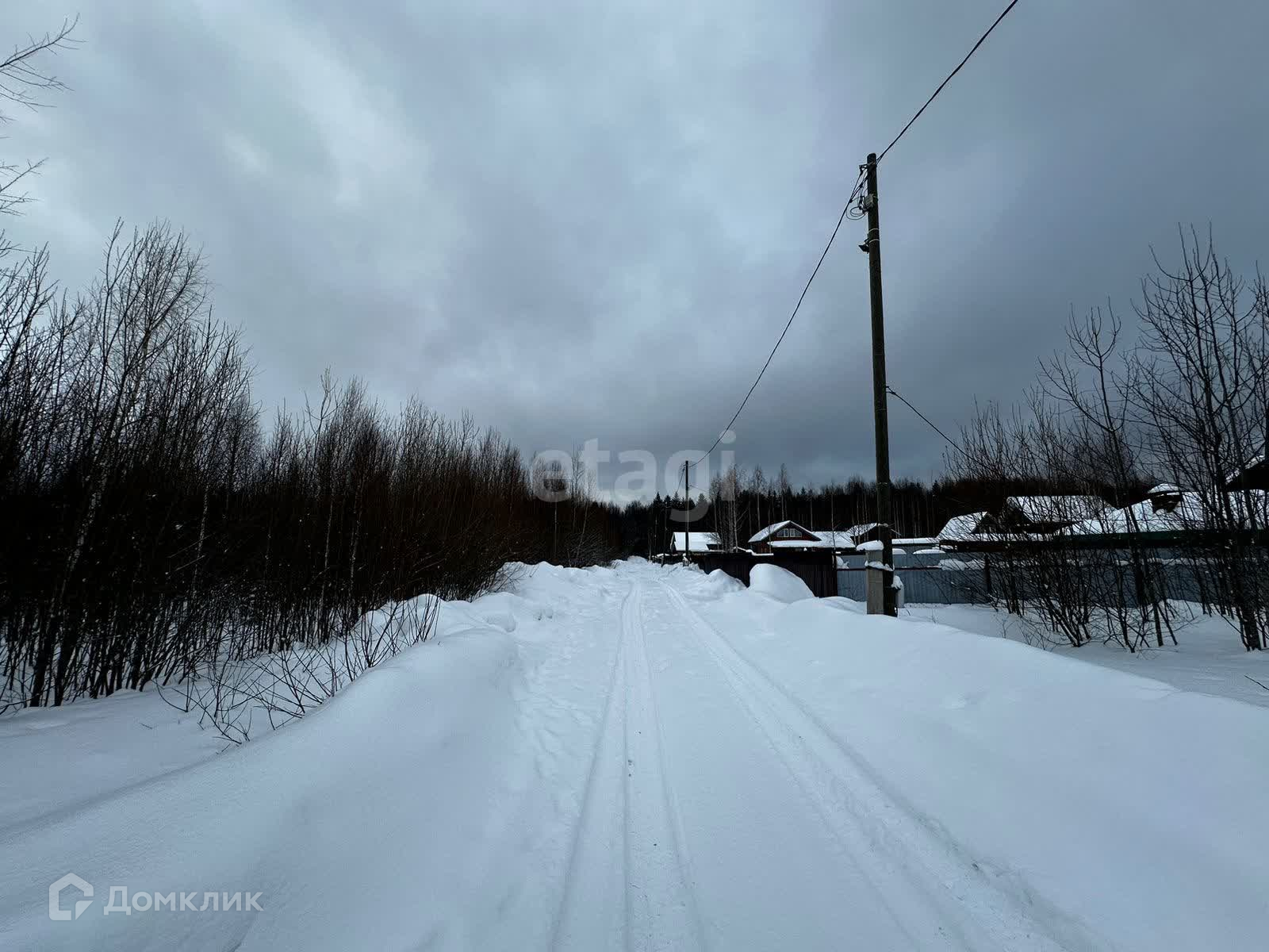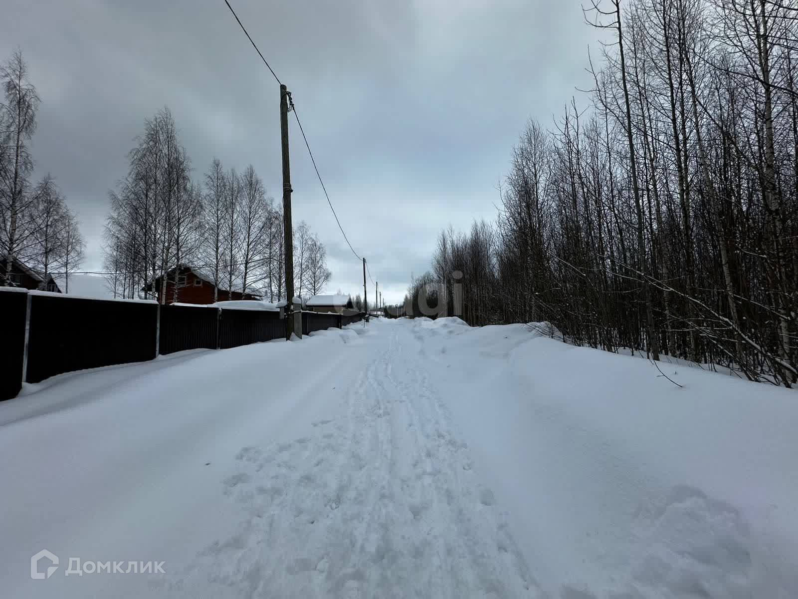 На углу участка стоит столб с проведенным электричеством. Газ проходит по границе поселка. Водоснабжение круглогодичное и реализовано с помощью двух скважин, труба с водой уже есть на участке. В поселке активно идет строительство.
