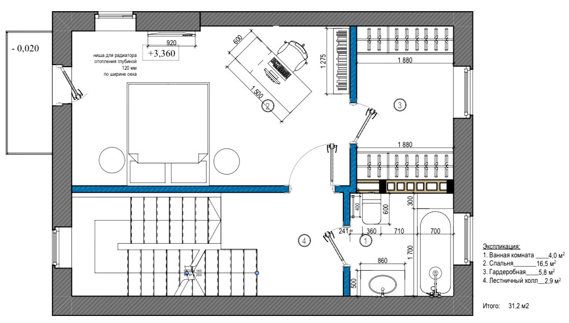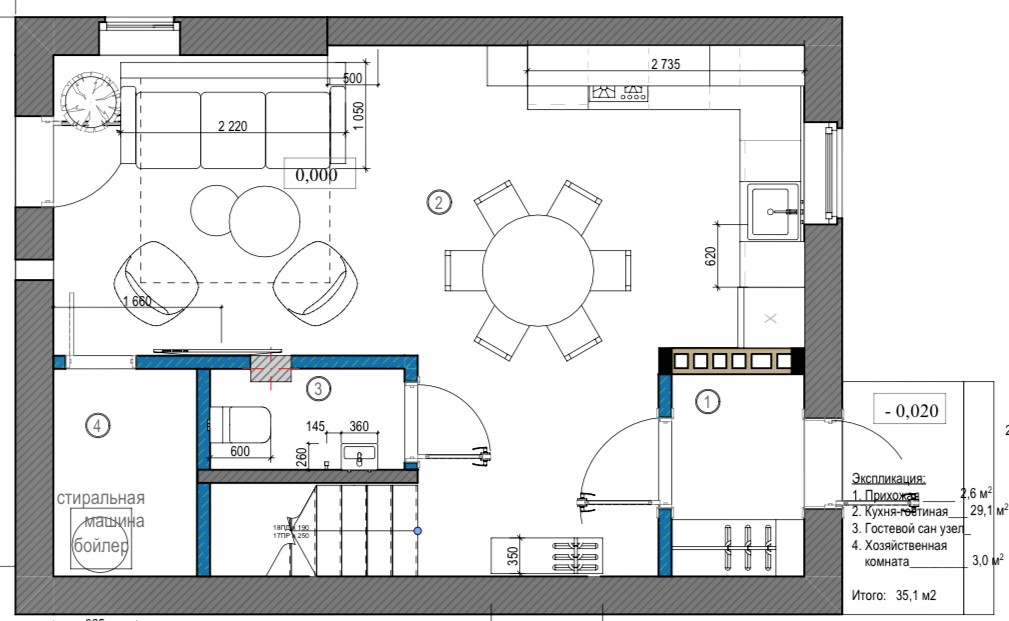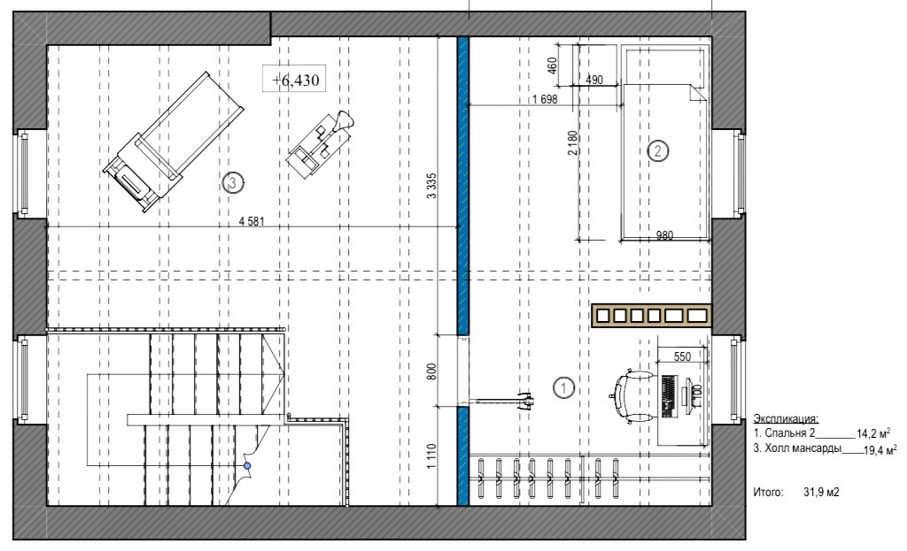 1 этаж: 35,1 кв.м - прихожая, кухня-гостиная с выходом на индивидуальный задний двор, гостевой санузел, хозяйственная комната; 2 этаж: 31,2 кв.м - спальня с выходом на балкон, гардеробная и ванная комната личного пользования; 3 этаж: 31,9 кв.м - мансардное помещение свободного назначения.