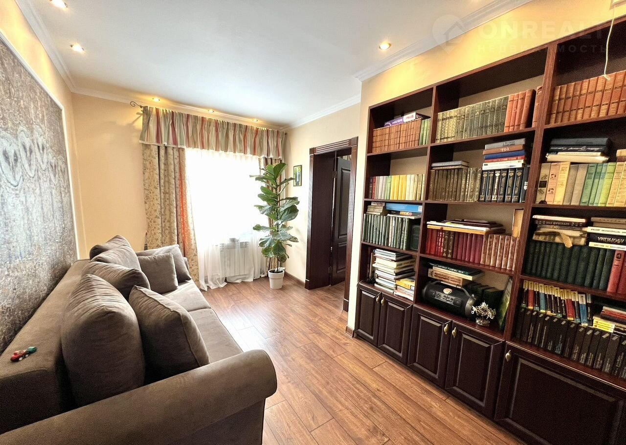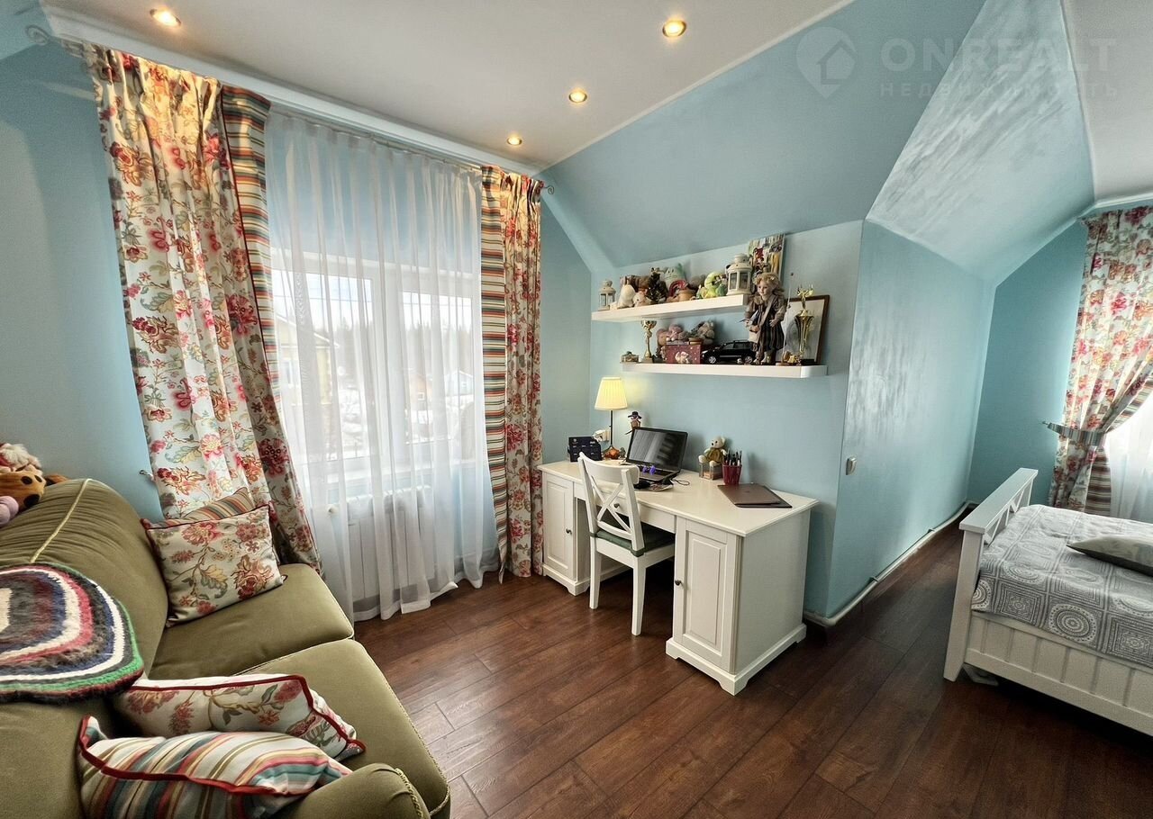 На втором этаже три отдельные спальни, библиотека, санузел.