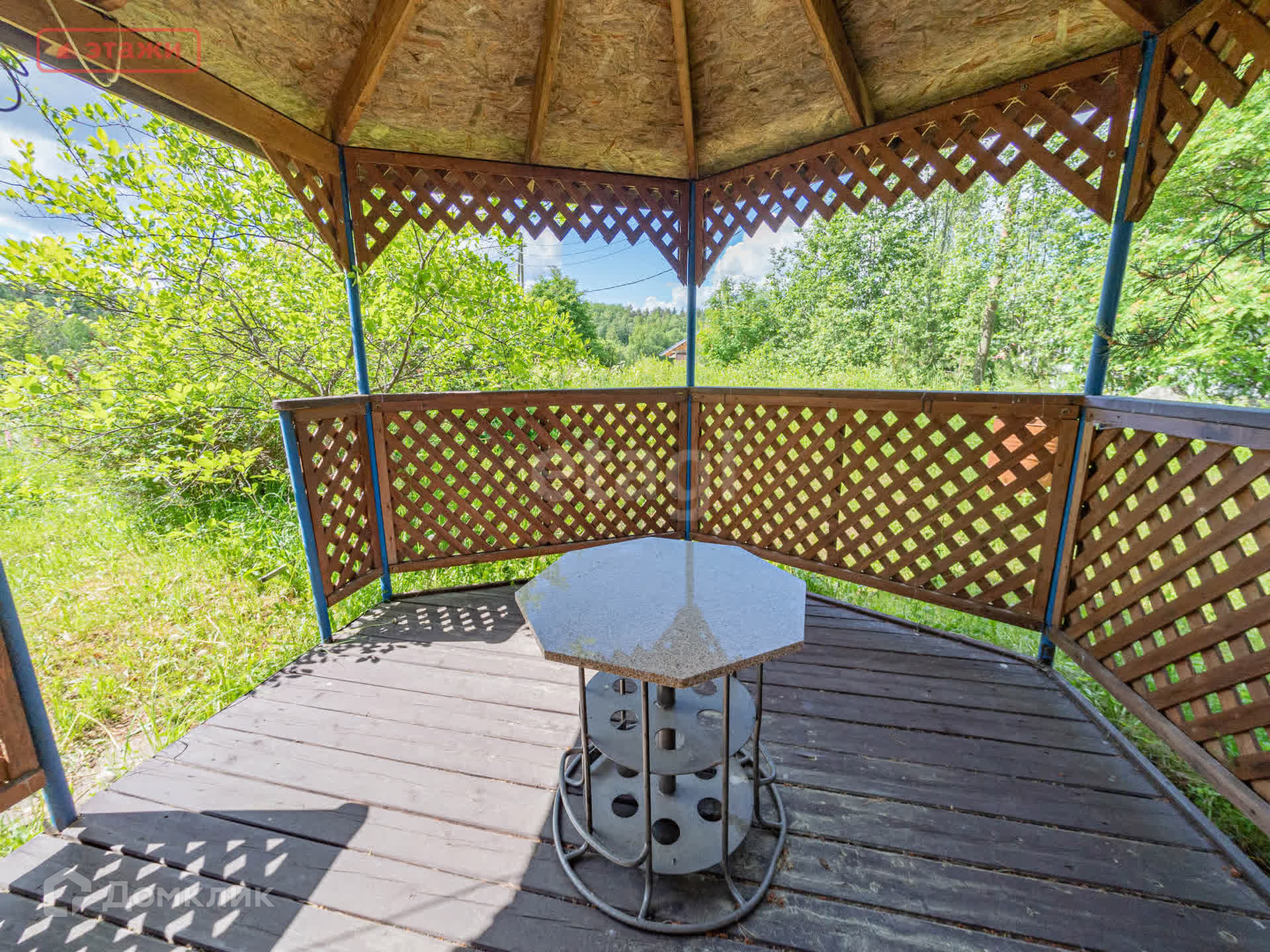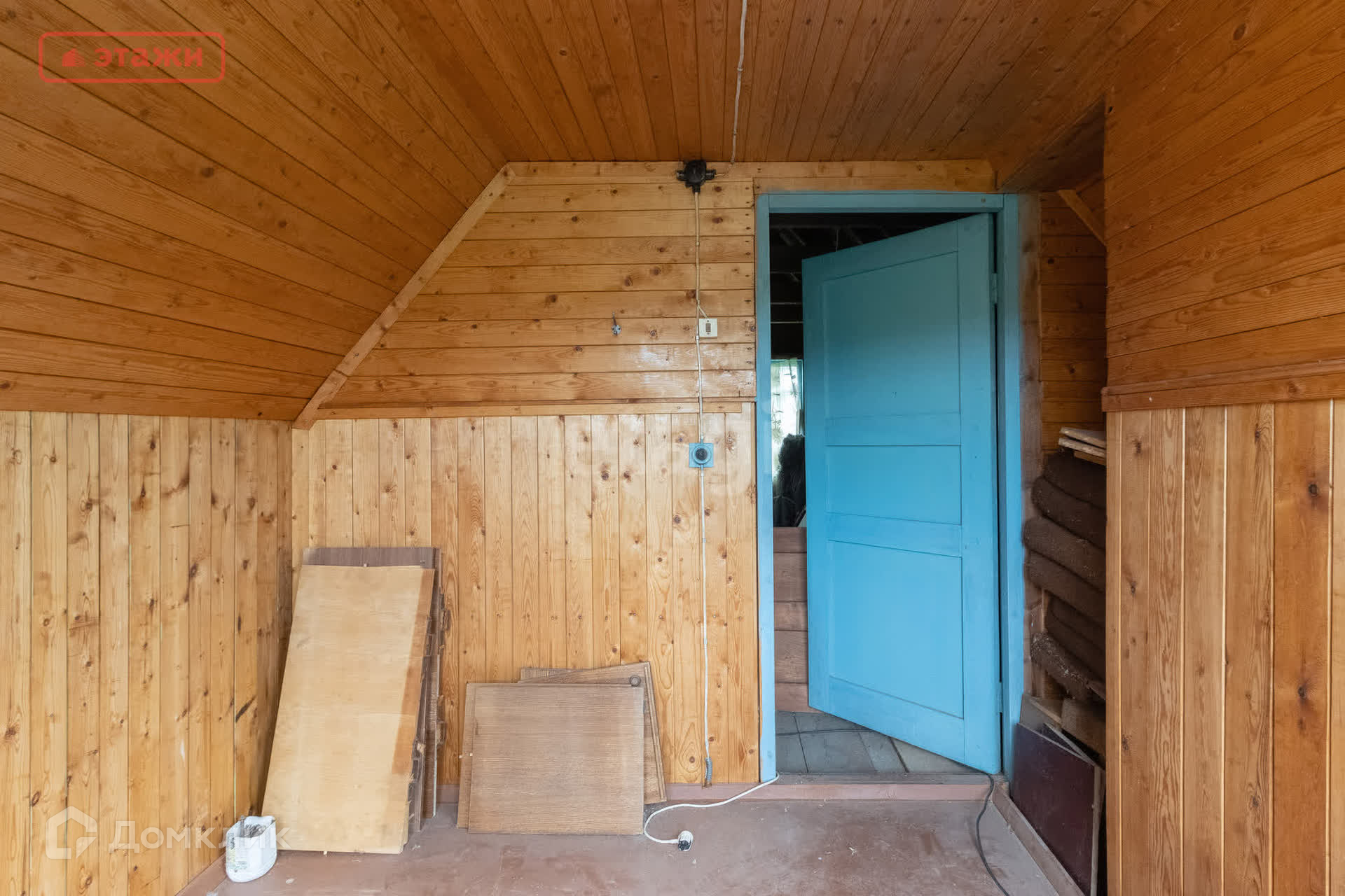 Дом каркасный, засыпной в два этажа : на первом кухня и комната, на втором - одна комната. В помещениях легко дышится - нет ни одного листа OSB. Летом прохладно. Быстро набирает тепло от печки в межсезонье. Веранда окнами на юг. Биотуалет.