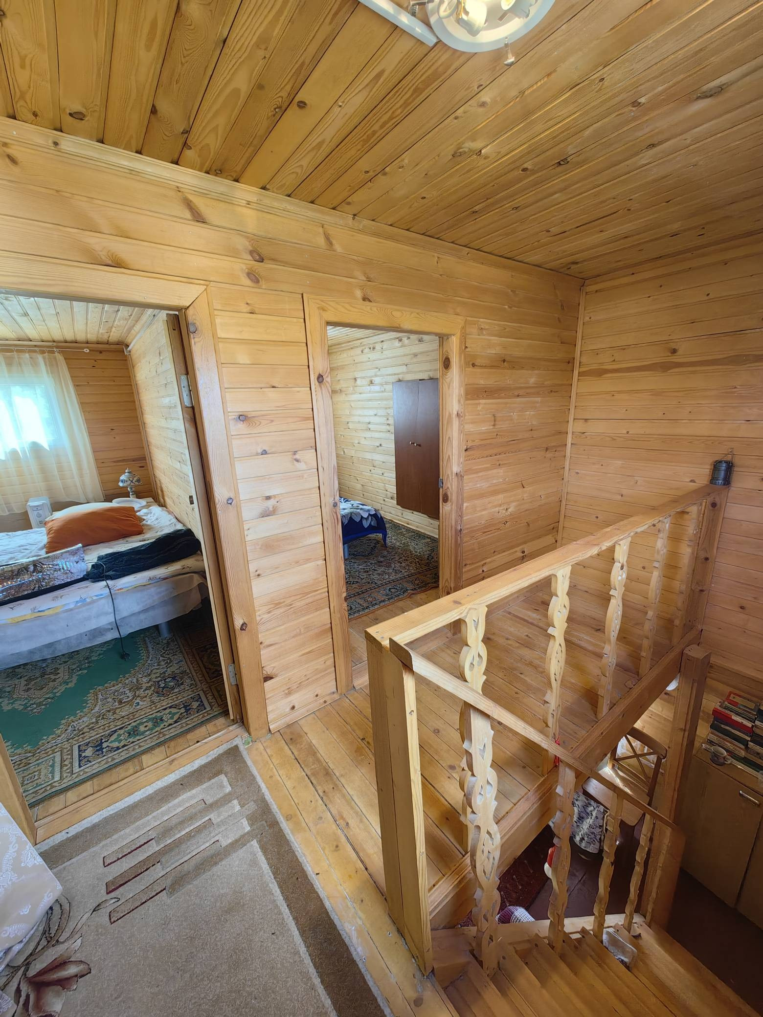 На первом этаже гостиная , душевая , помещение под баню,на втором  этаже 2 комнаты.