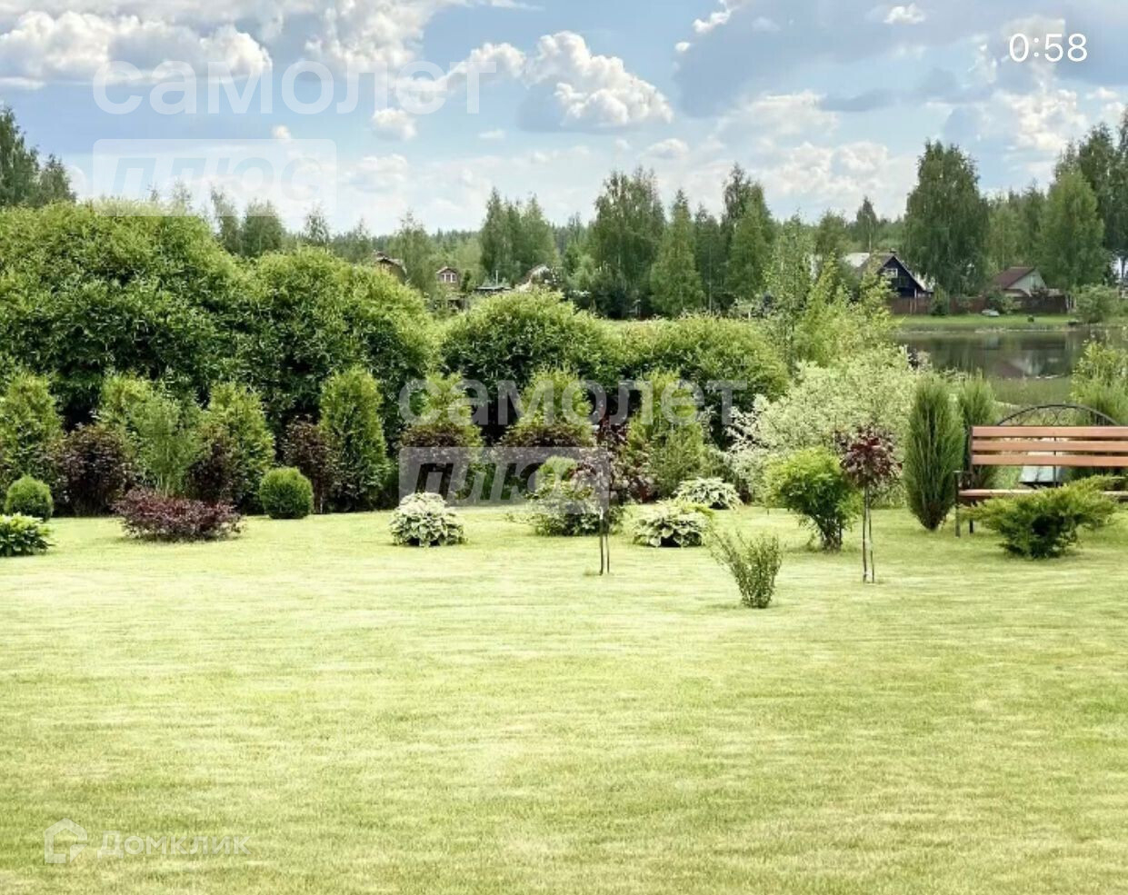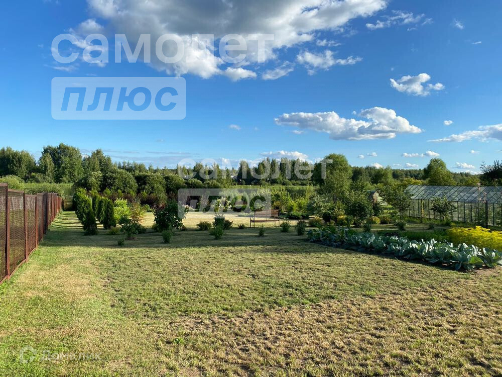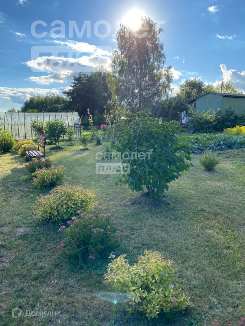 Участок засеян газоном, есть плодовые деревья (яблоня, вишня) и кустарники (белая, красная и черная смородина), а перед домом декоративные насаждения (пихты).