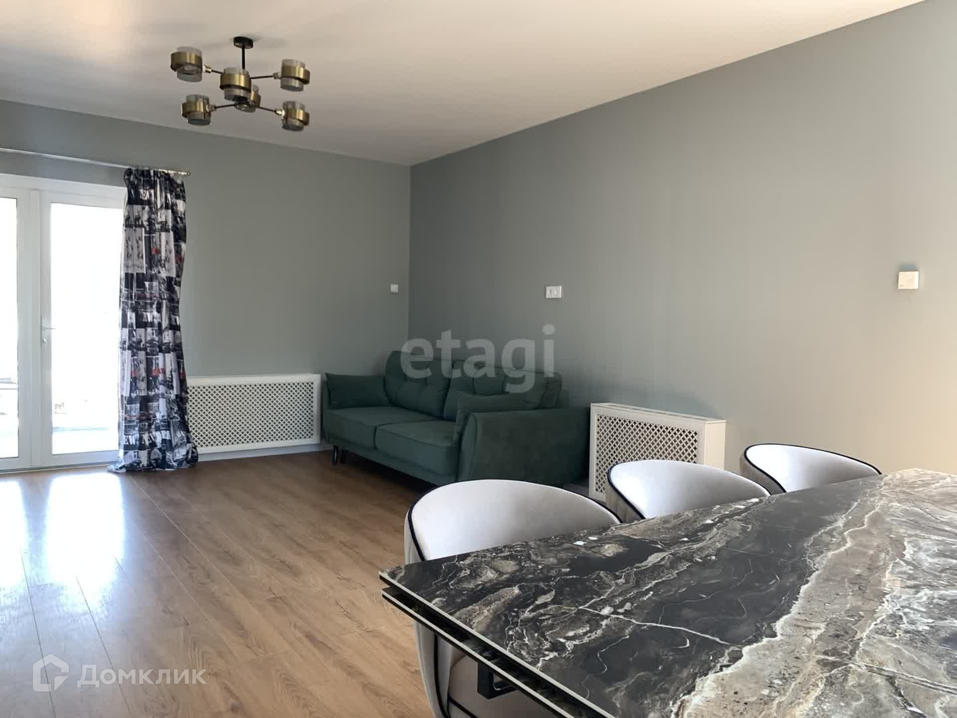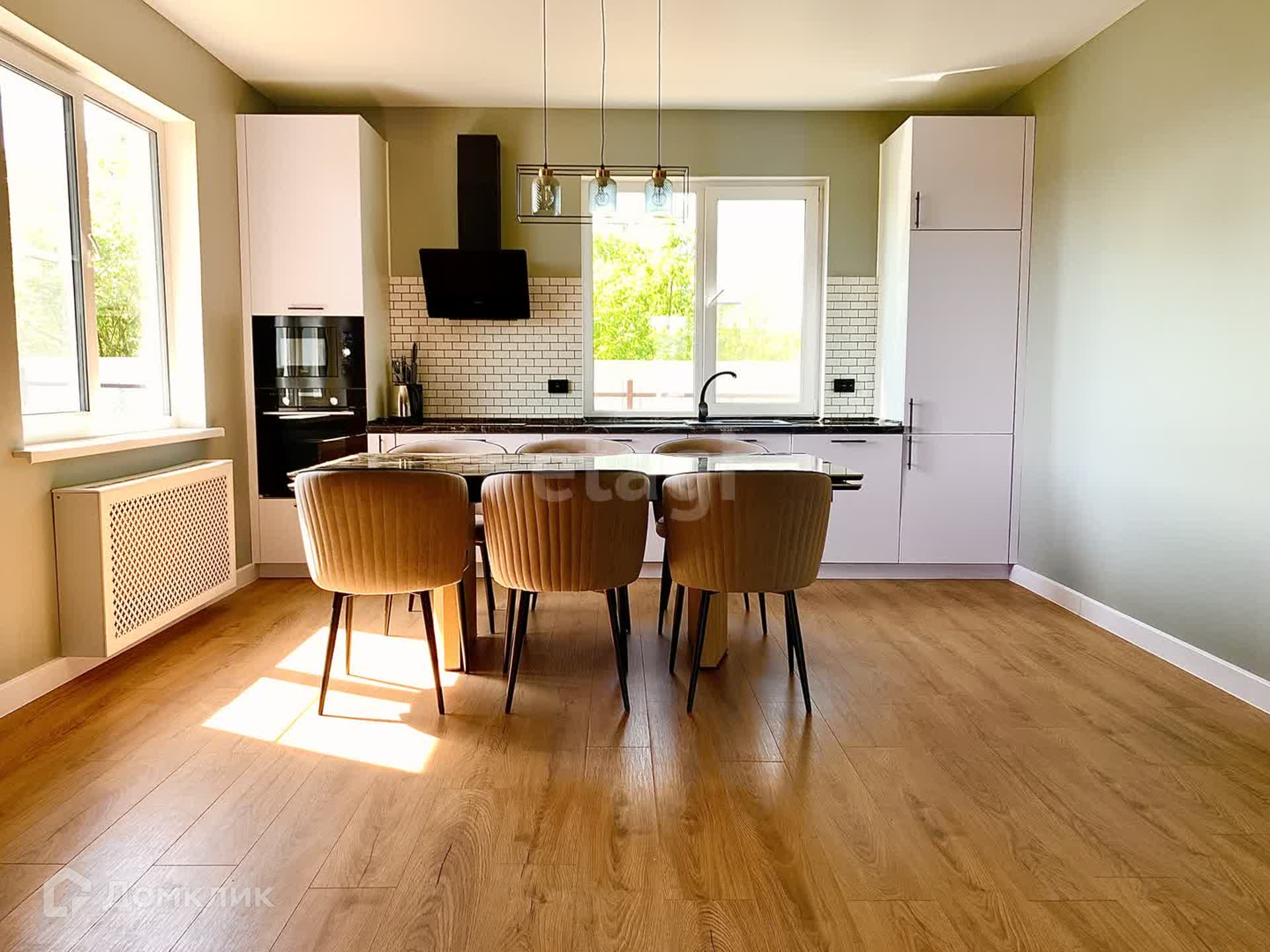Большая кухня-гостиная с духовым шкафом, встроенным холодильником, СВЧ и большим телевизором, обеденная зона. Четыре изолированные комнаты, два сан узла (на 1 и 2 этажах), стиральная машина с функцией сушки, телевизор на втором этаже.