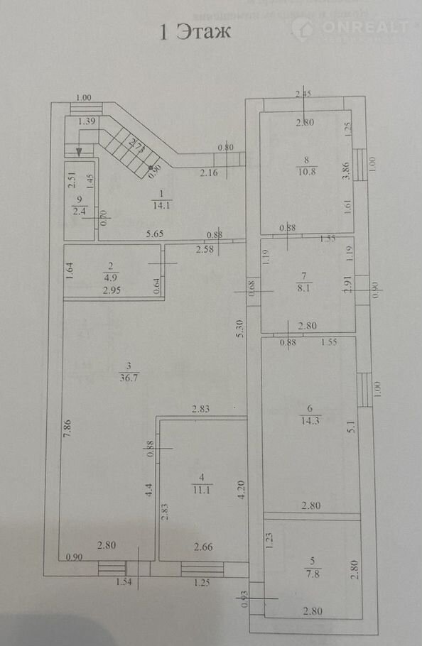 1 этаж: гостиная с кухонной зоной 36,7 кв.м, три изолированные комнаты (10,8+14,3+11,1), прихожая, санузел, котельная;