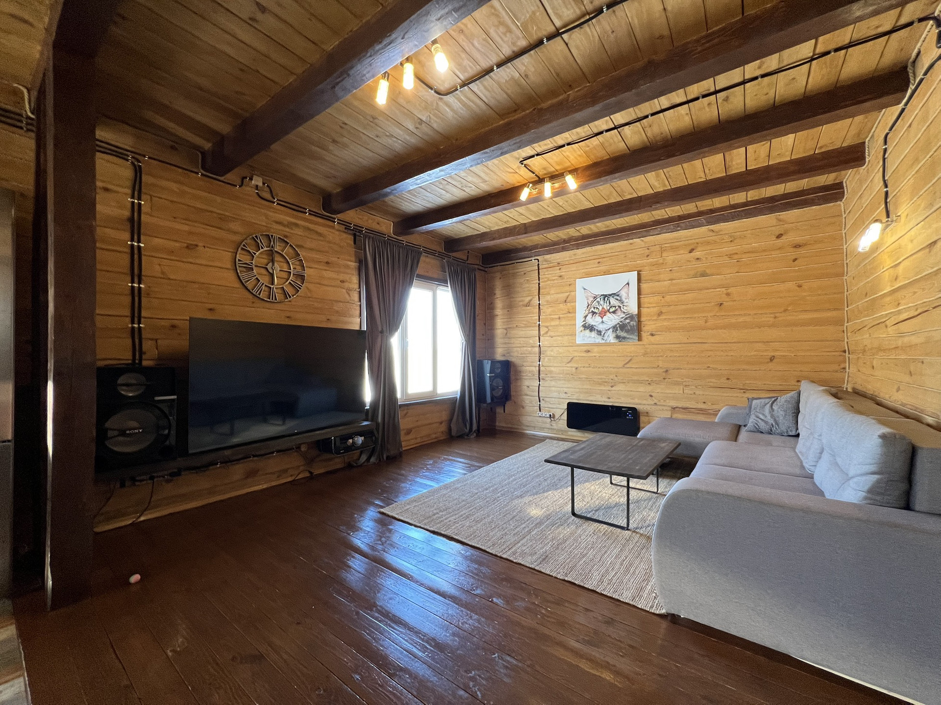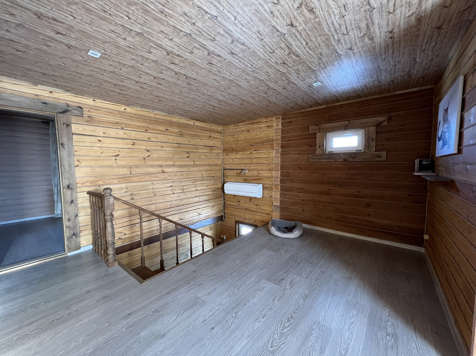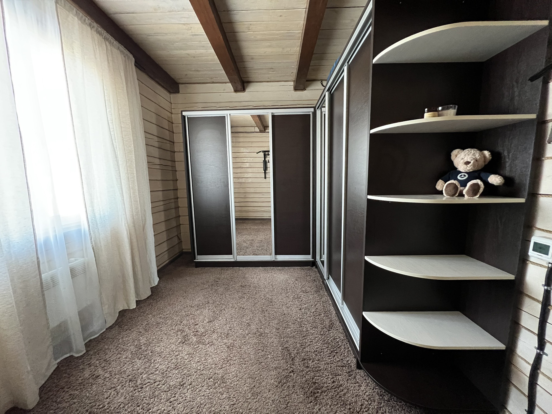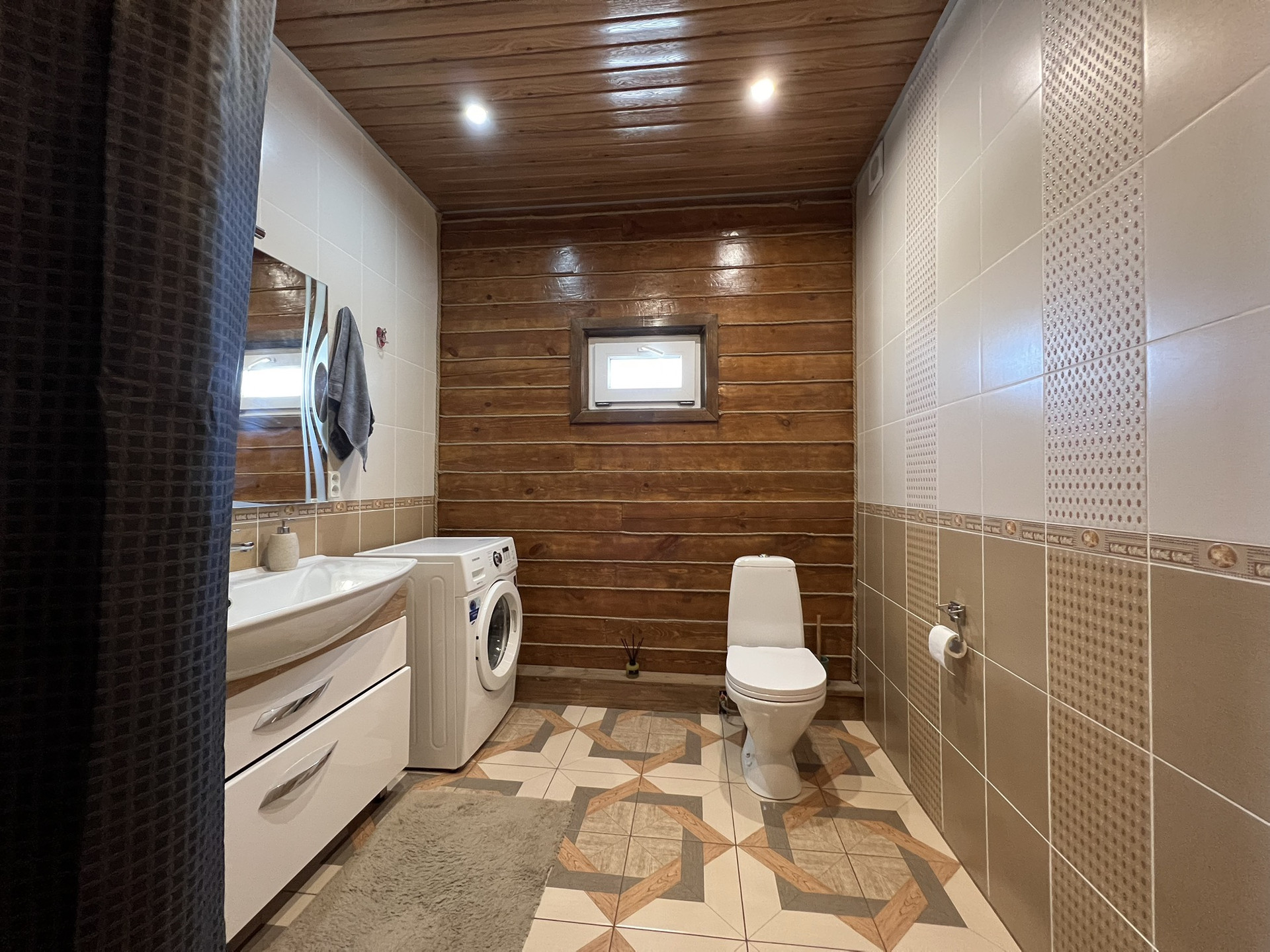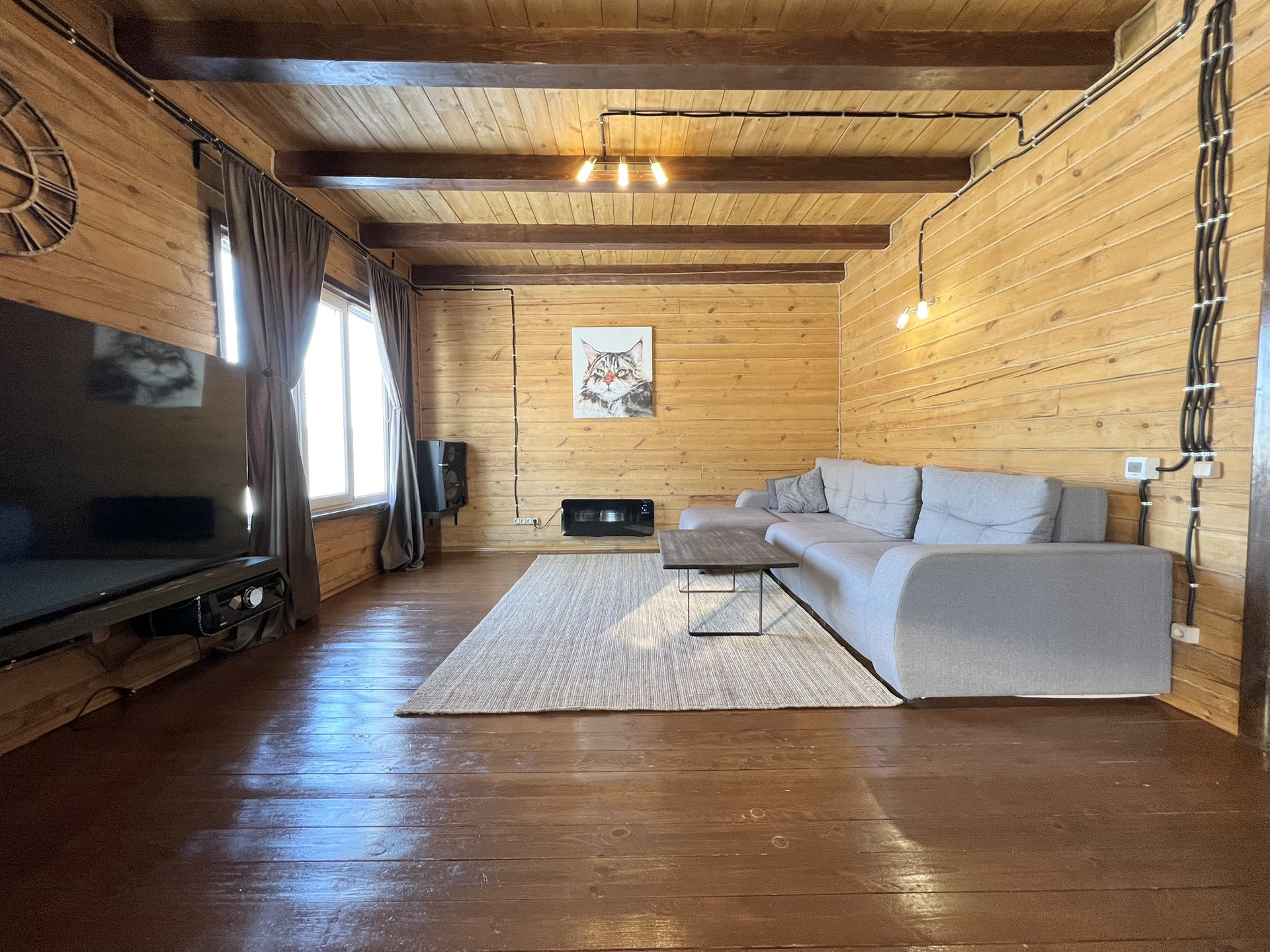 Два полноценных этажа с изолированными двумя комнатами на втором, на первом гостиная объединённая с кухней, гардеробная, санузел, котельная. Три санузла, на первом этаже, втором и в бане. На первом этаже тёплый пол с датчиками терморегуляторами. Между первым и вторым этажом установлен кондиционер.