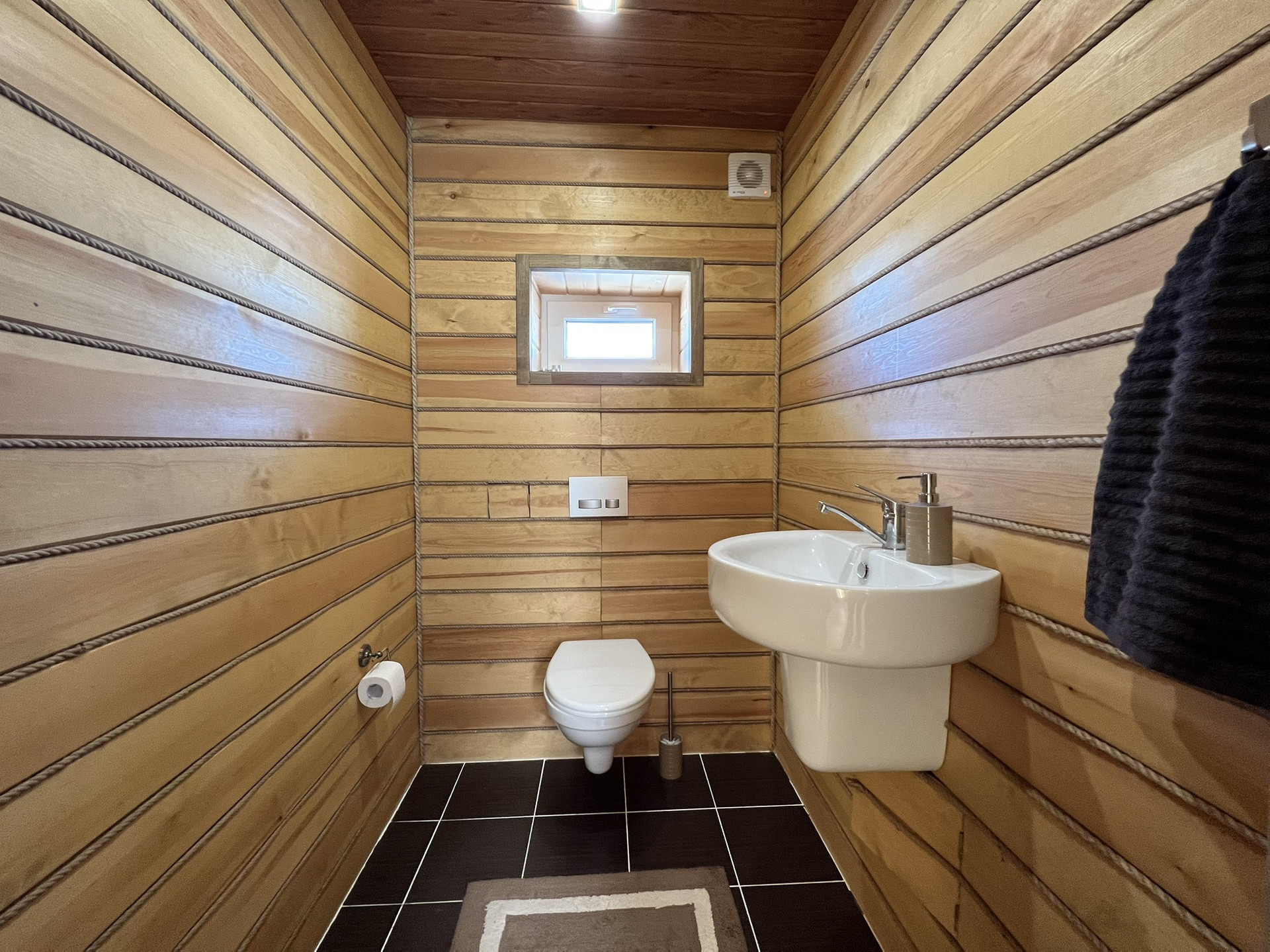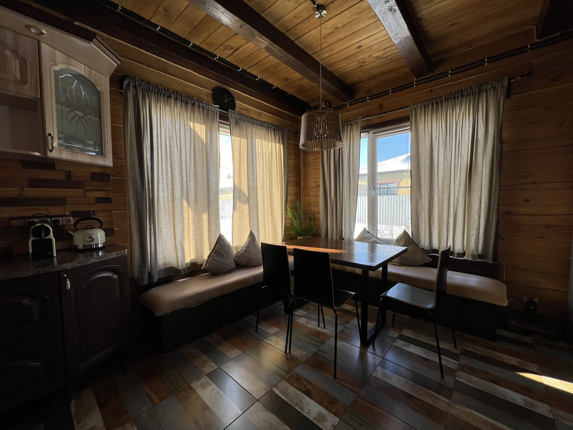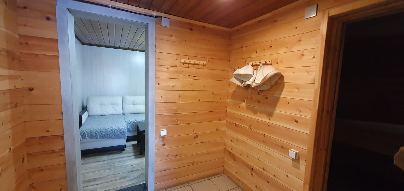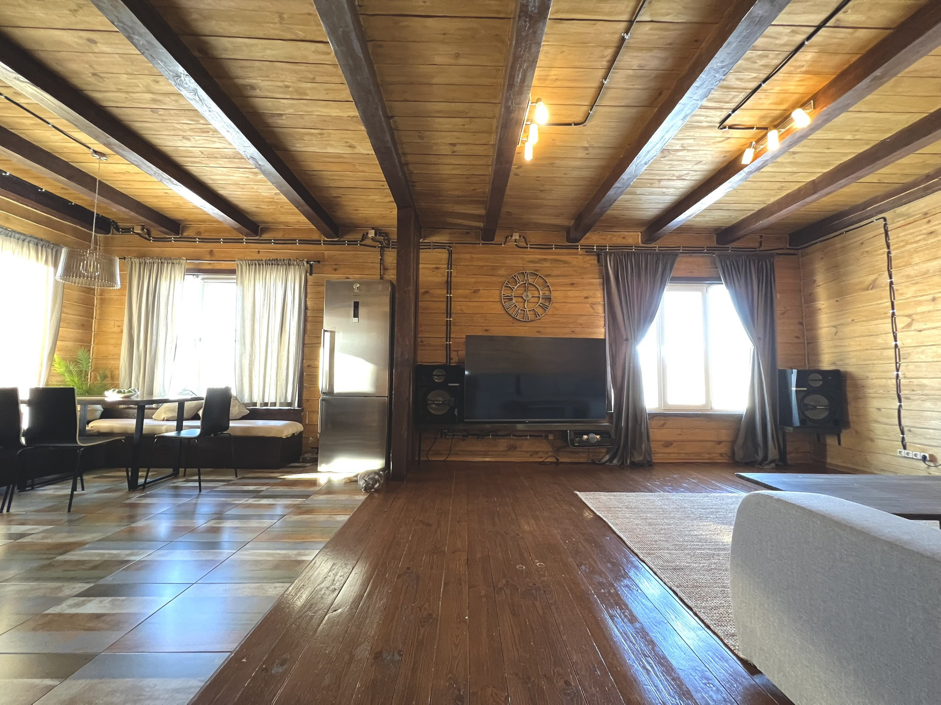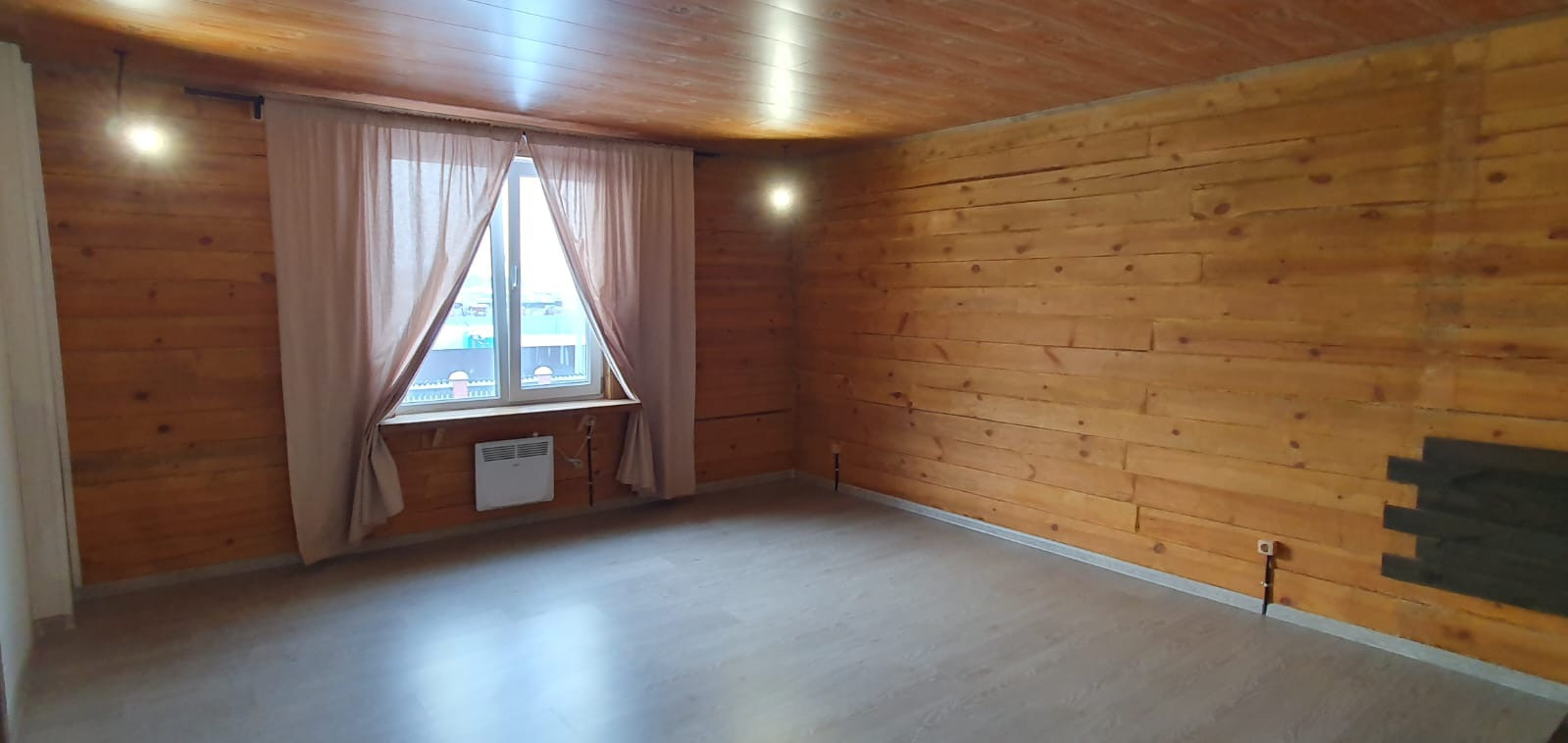 Два полноценных этажа с изолированными двумя комнатами на втором, на первом гостиная объединённая с кухней, гардеробная, санузел, котельная. Три санузла, на первом этаже, втором и в бане. На первом этаже тёплый пол с датчиками терморегуляторами. Между первым и вторым этажом установлен кондиционер.