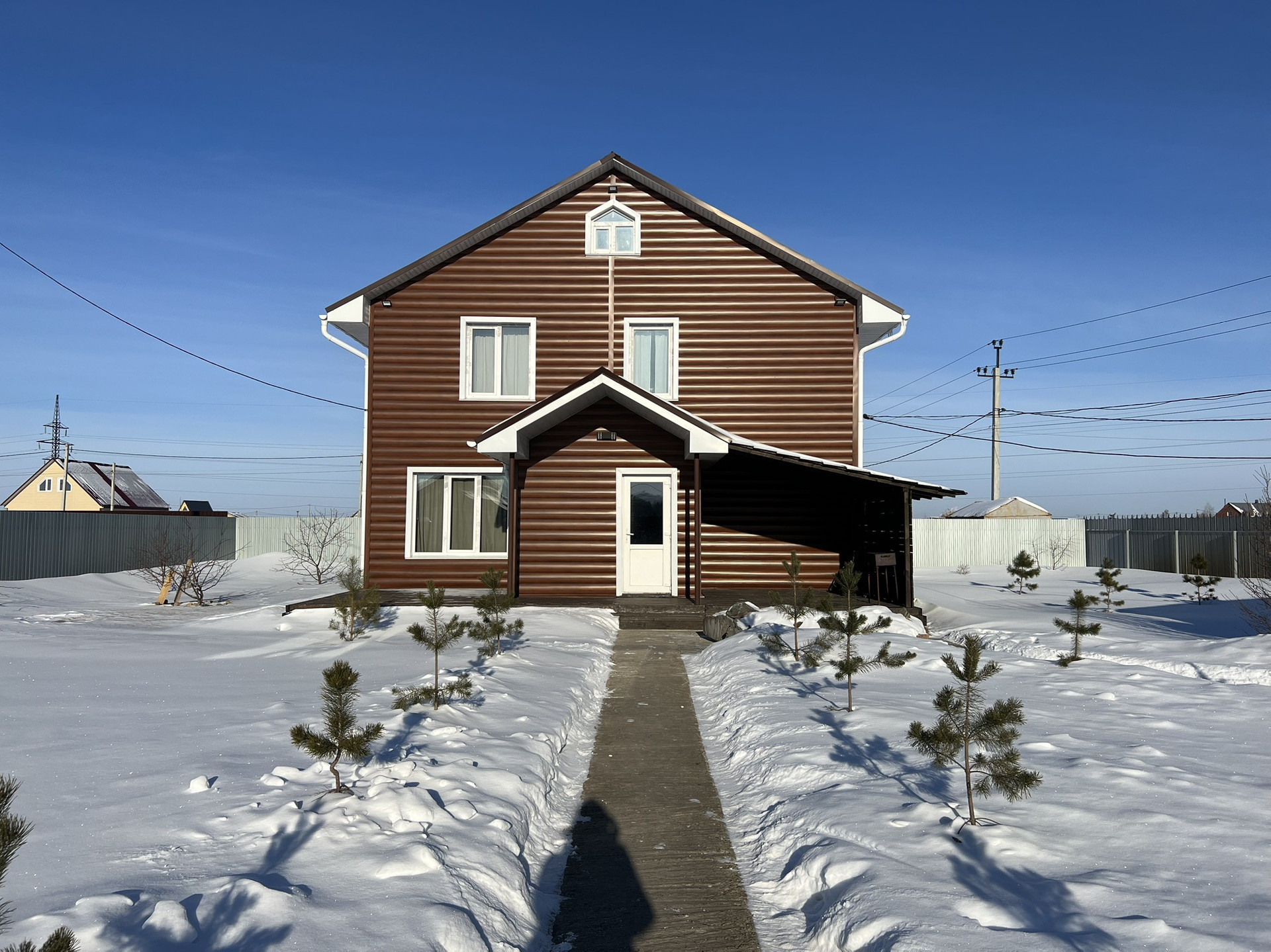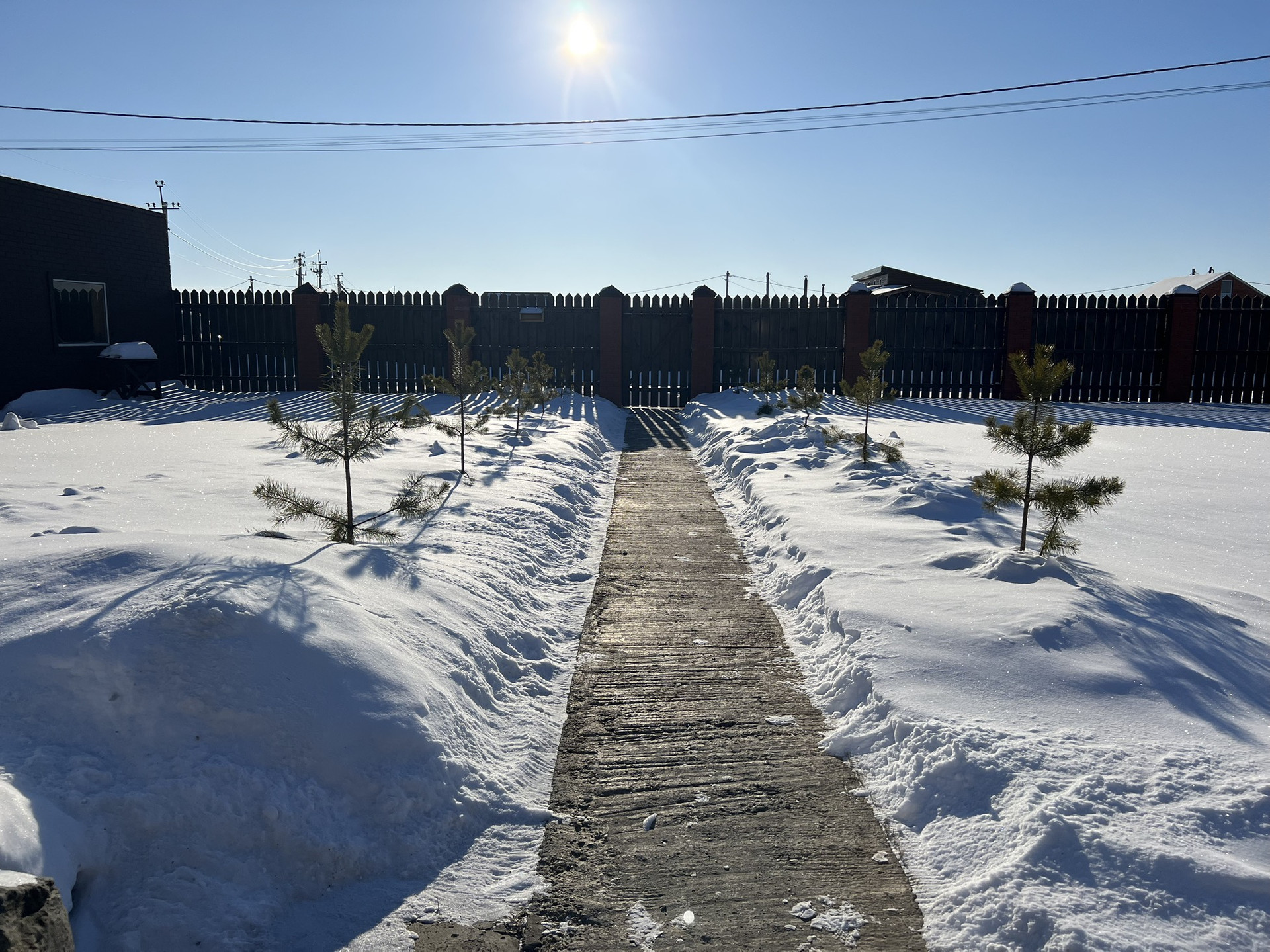 Автоматическая система уличного освещения. Территория засажена газоном, за домом растёт малина, 4 яблони.