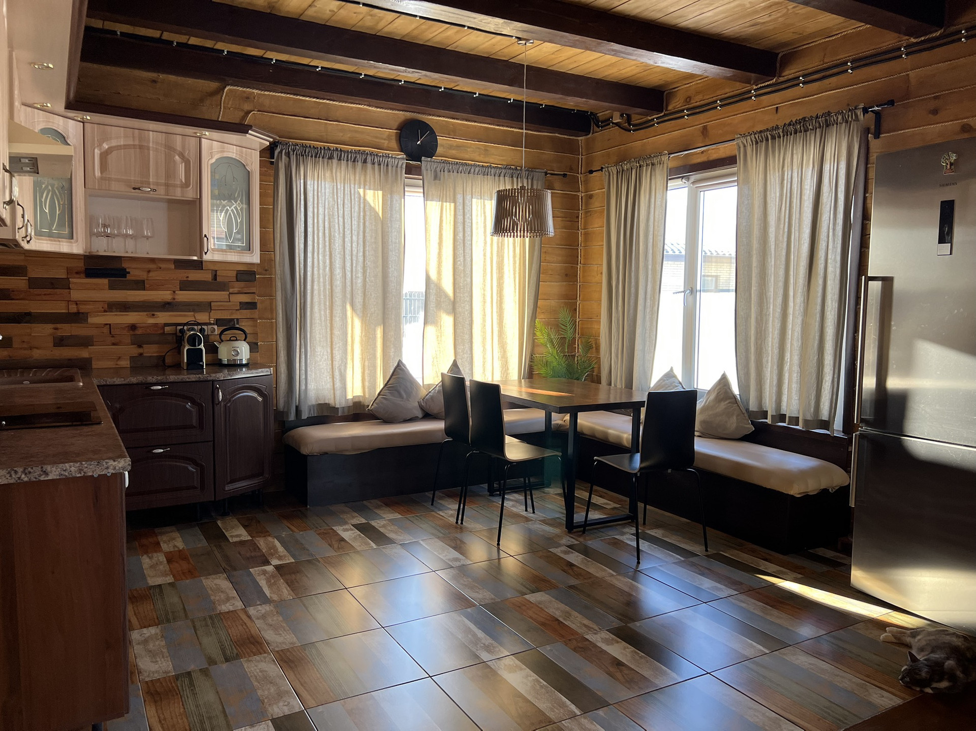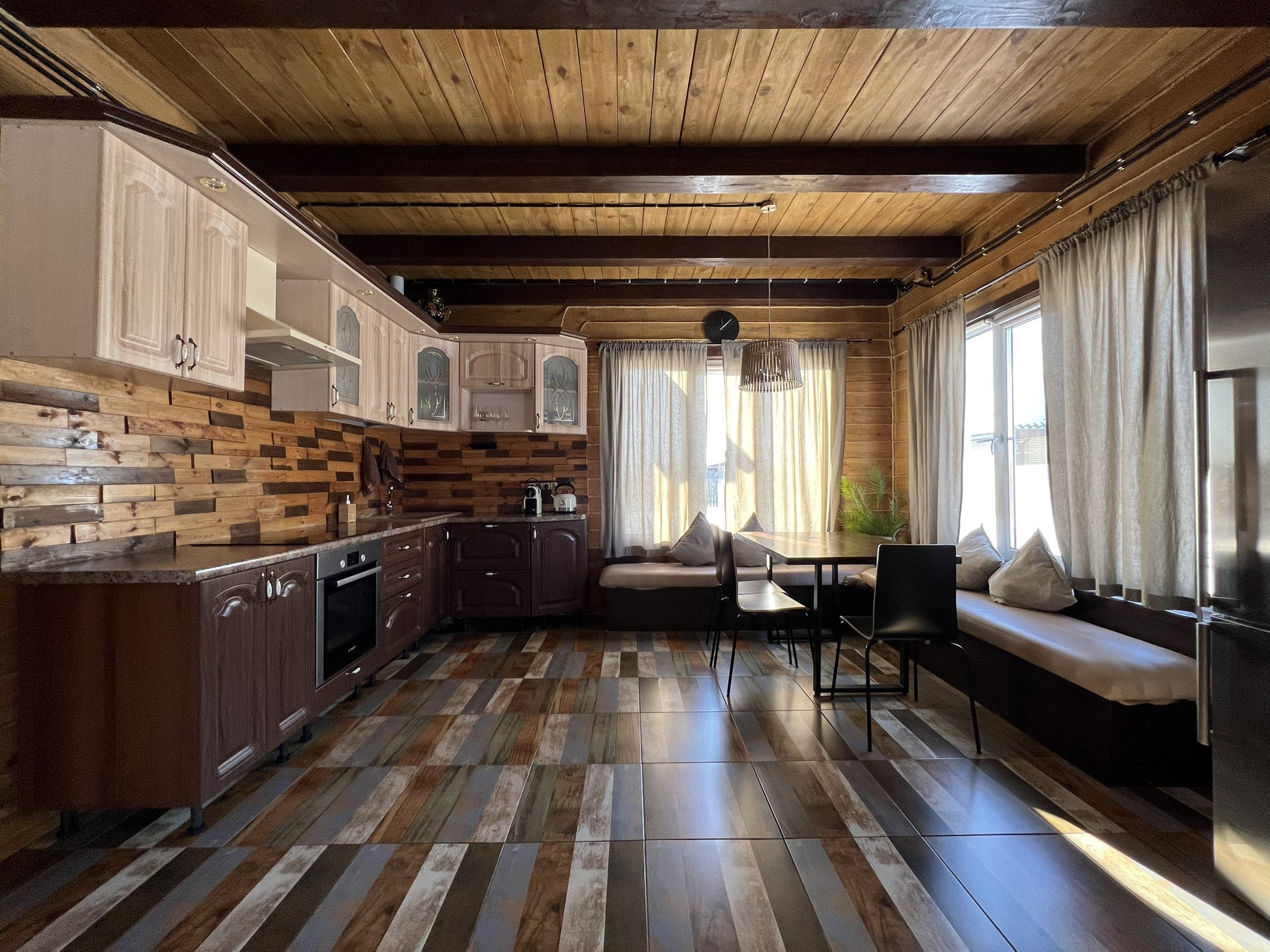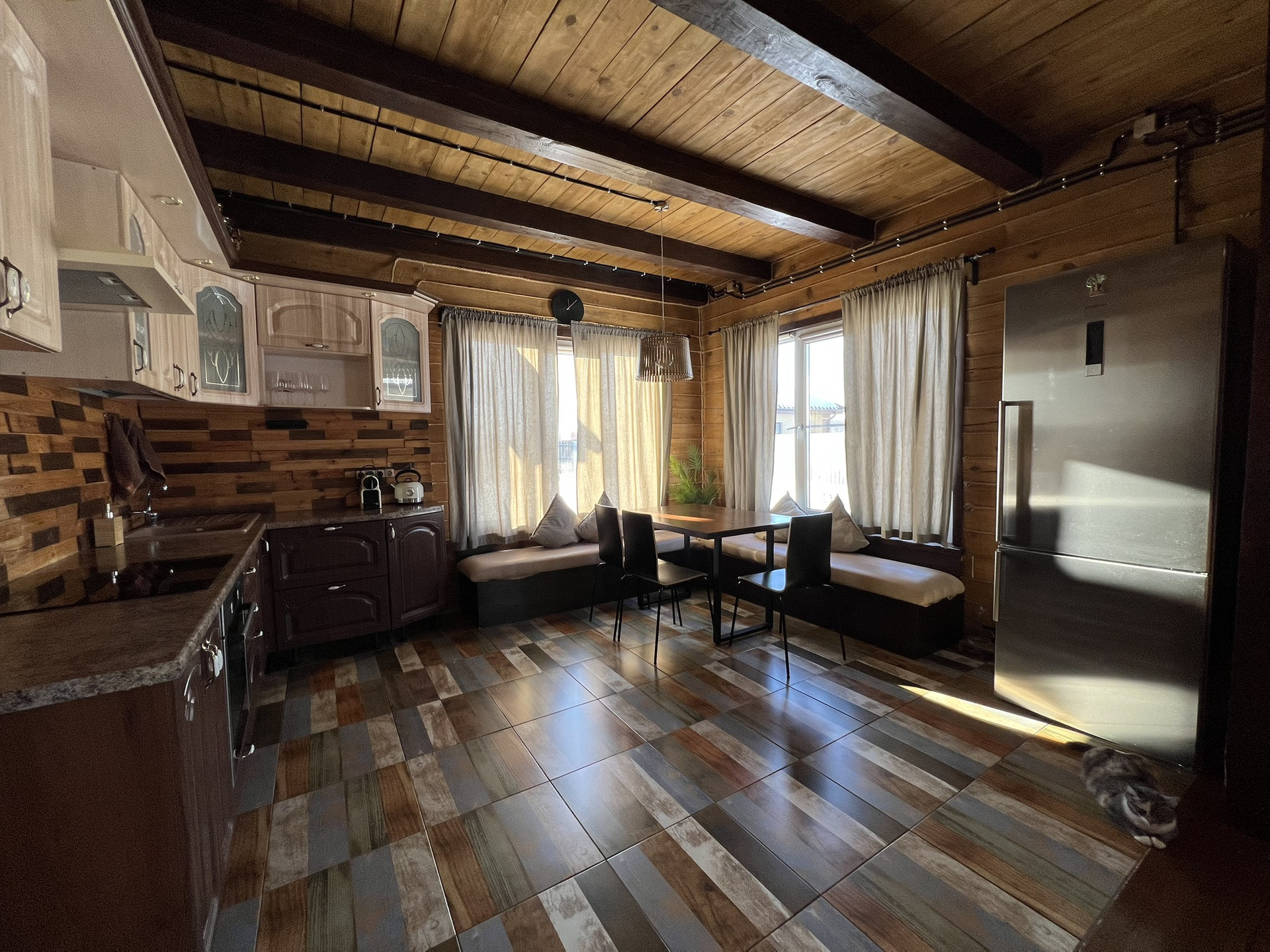 Дом построен из качественных, экологически чистых материалов, брус толщиной 150 мм+утеплитель, мет.сайдинг имитация под бревно.