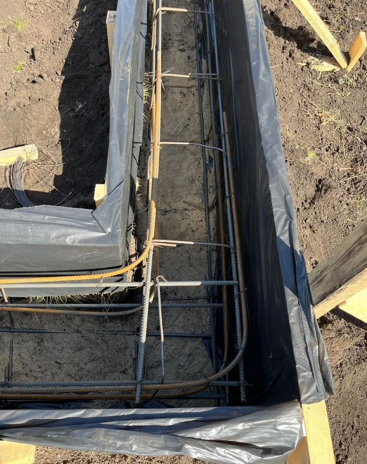 Ленточный фундамент. Пол монолитная плита (утепление пеноплексом) , стяжка, канализация (септик), водопровод(скважина), электричество.