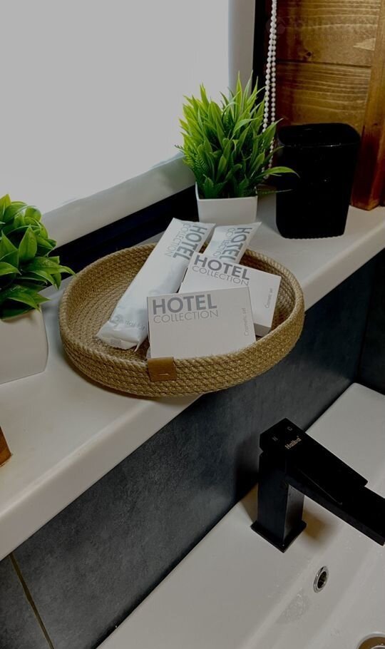 Постельное белье, полотенца, моющие и душевые принадлежности, фен.