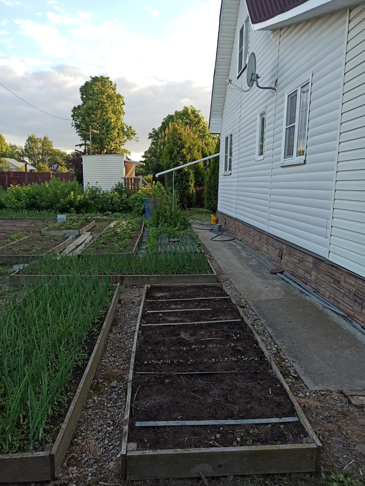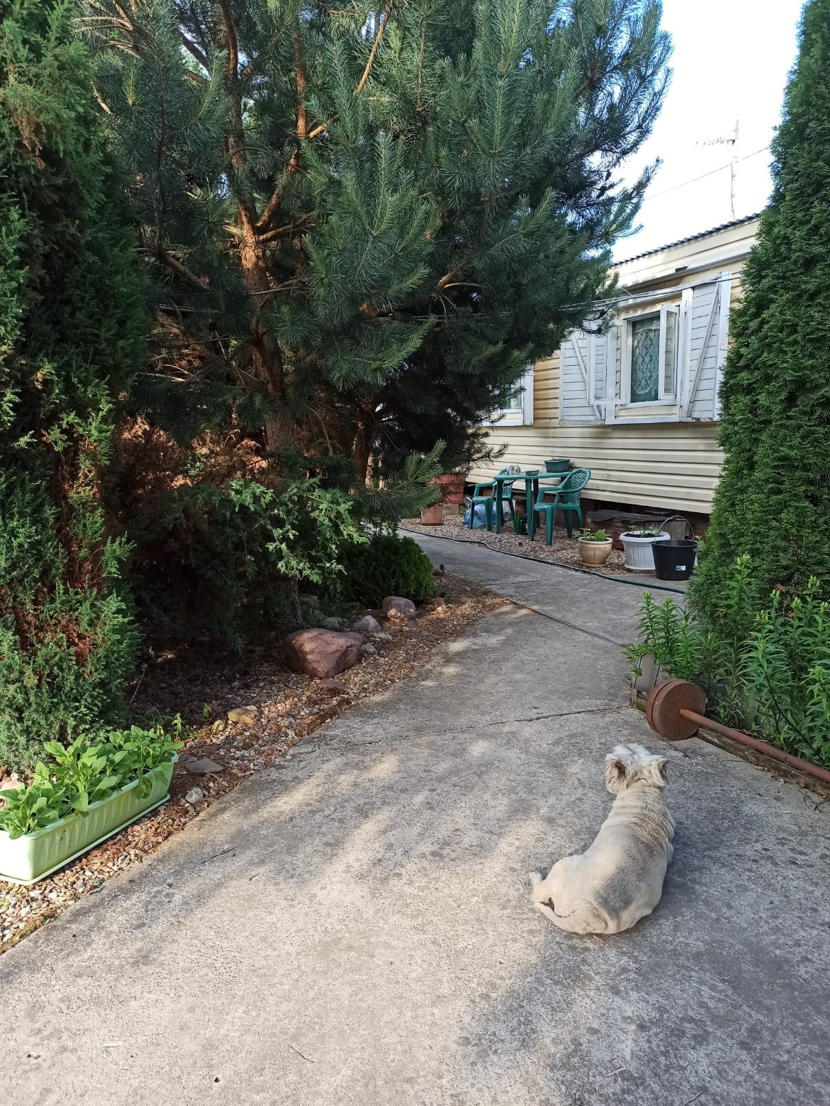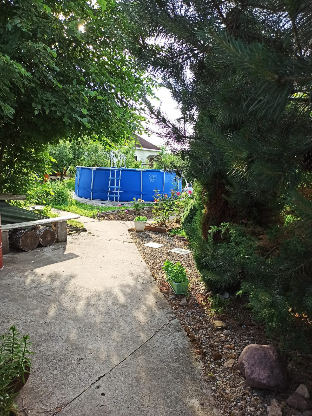 На участке : беседка, бытовка ( оборудована под летнюю кухню), сарай с навесом, много деревьев, кустарников, ельников и т.д.