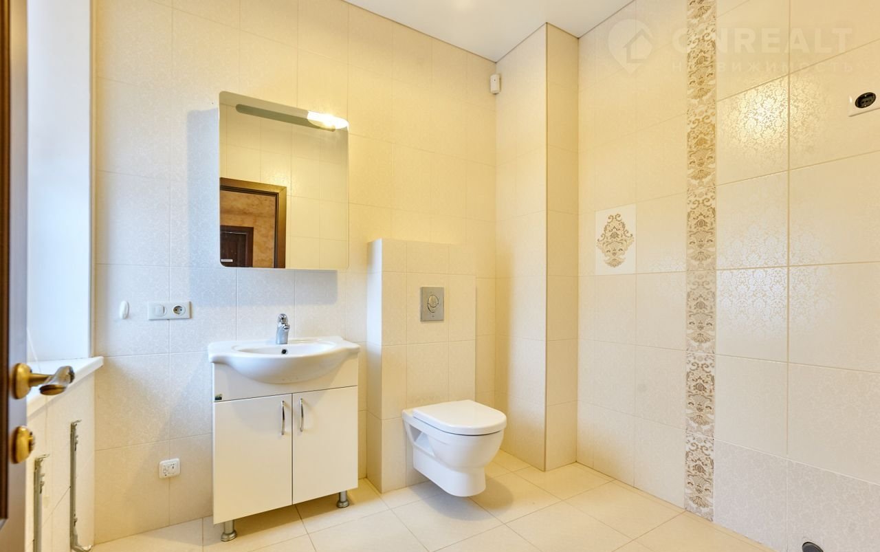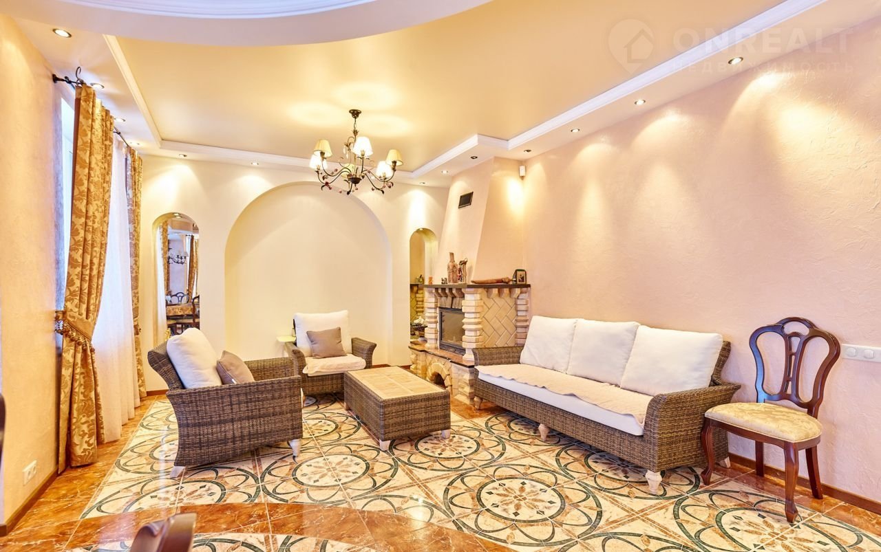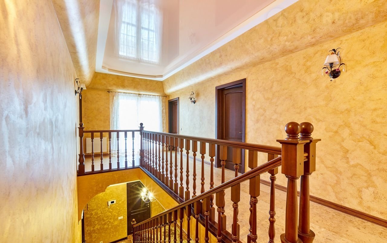 На первом этаже дома просторная прихожая с гардеробом и красивой лестницей из натурального дерева, ведущей на второй этаж, санузел с душевой. Просторная кухня- столовая, шикарная гостиная с великолепным дровяным камином.