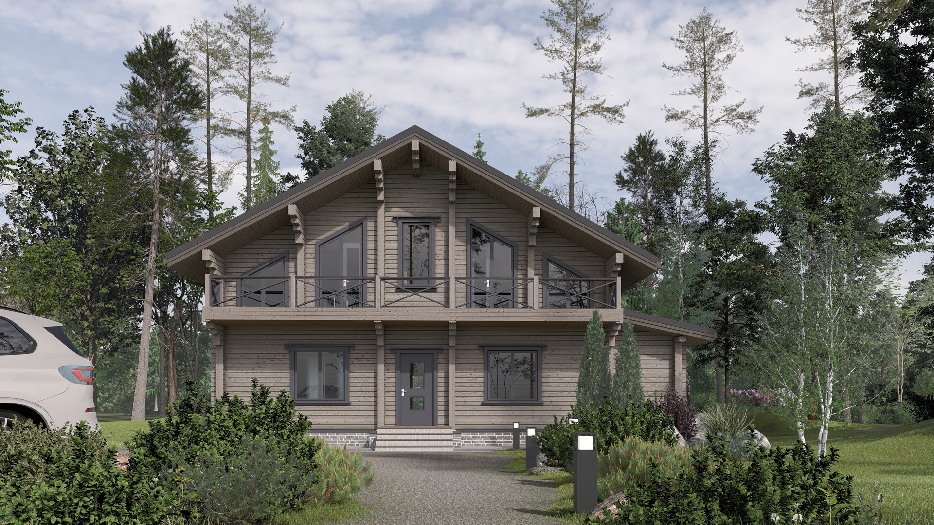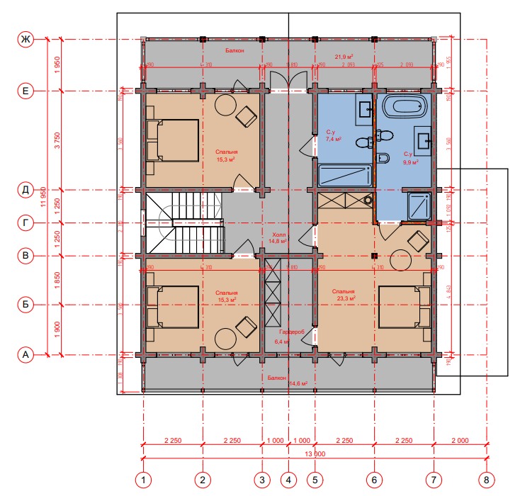 - На втором этаже дома расположены: ванная комната, большая мастер-спальня с выходом на балкон, собственным санузлом, гардеробной комнатой с балконом и две просторные спальни квадратной формы - всё что нужно для максимального комфорта.