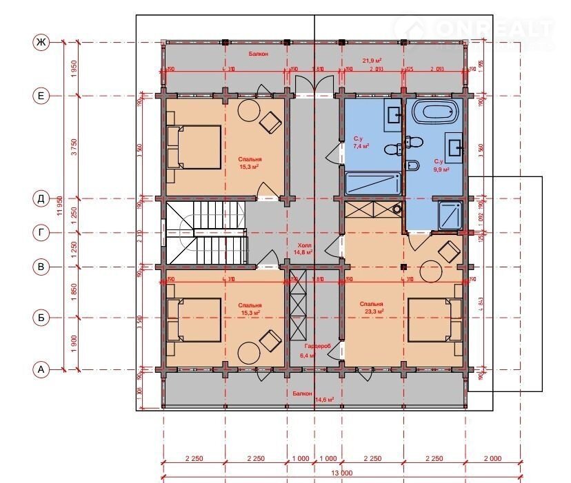 - На втором этаже дома расположены: большая мастер-спальня с выходом на балкон, собственным санузлом и гардеробной комнатой, две просторные спальни квадратной формы с выходом на балконы и общим санузлом