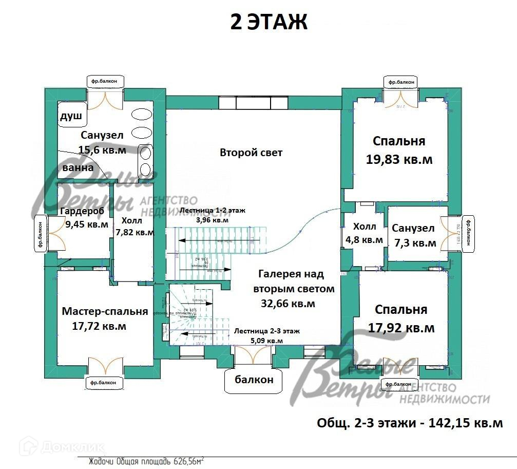 2-ой этаж: мастер-блок: спальня 17,7 кв.м со своим санузлом 15,6 кв.м, гардеробом 9,5 кв.м и холлом 7,8 кв.м, лестница 1-2 этаж 4 кв.м, галерея над вторым светом 32,6 кв.м, спальня 19,8 кв.м, спальня 17,9 кв.м, санузел 7,3 кв.м, холл 4,8 кв.м, лестница 2-3 этаж 5 кв.м..