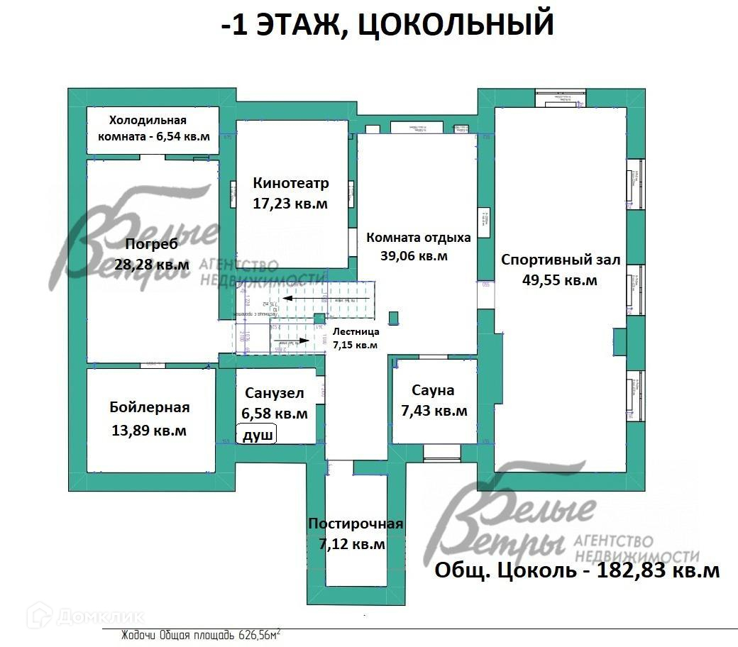 Цокольный этаж: спортивный зал 49,5 кв.м, кинотеатр 17,2 кв.м, сауна 7,4 кв.м, комната отдыха 39 кв.м, постирочная 7,1 кв.м, санузел 6,6 кв.м, погреб 28,3 кв.м, котельная 13,9 кв.м, холодильная комната 6,5 кв.м, лестница 7,2 кв.м..