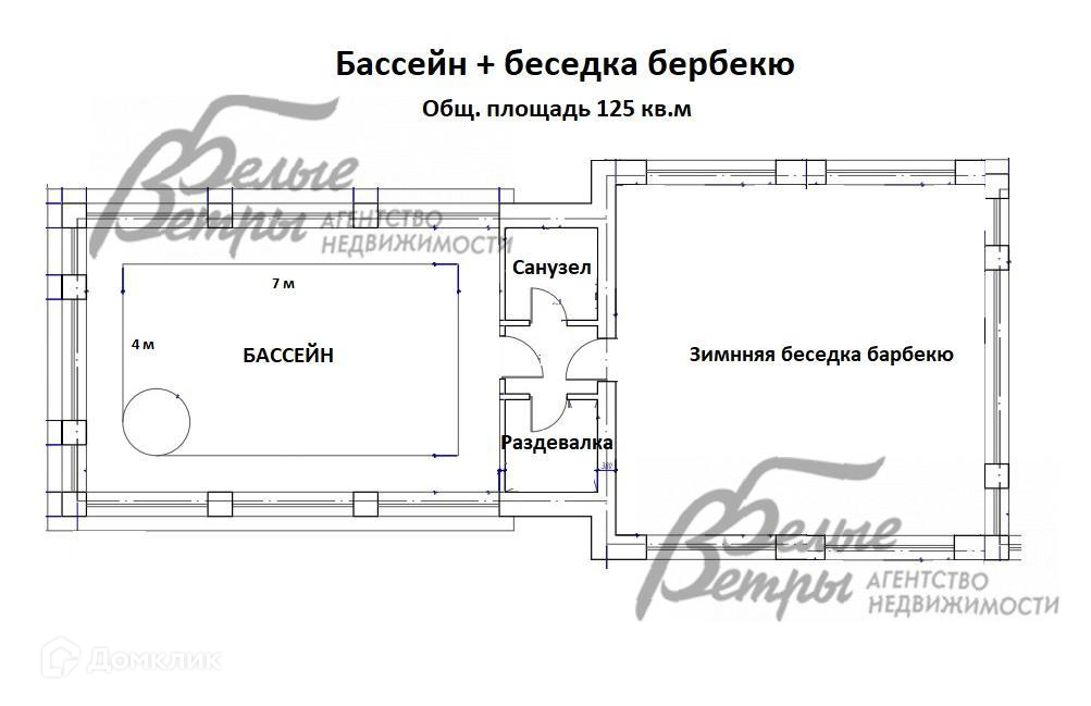 - Бассейн 125 кв.м с теплой беседкой-барбекю, с санузлом и раздевалкой. Чаша бассейна 7х4 м. Также, просторная зимняя беседка-барбекю.
