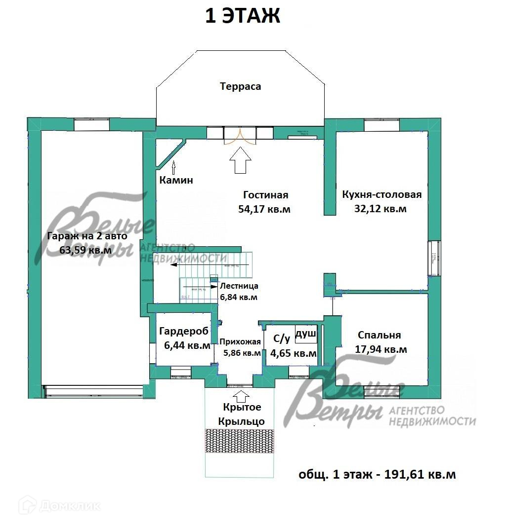 1-ый этаж: прихожая 5,9 кв.м, гардероб 6,4 кв.м, санузел 4,6 кв.м, кухня-столовая 32 кв.м, гостиная 54 кв.м, спальня 17,9 кв.м, гараж 63,6 кв.м, лестница 6,8 кв.м..