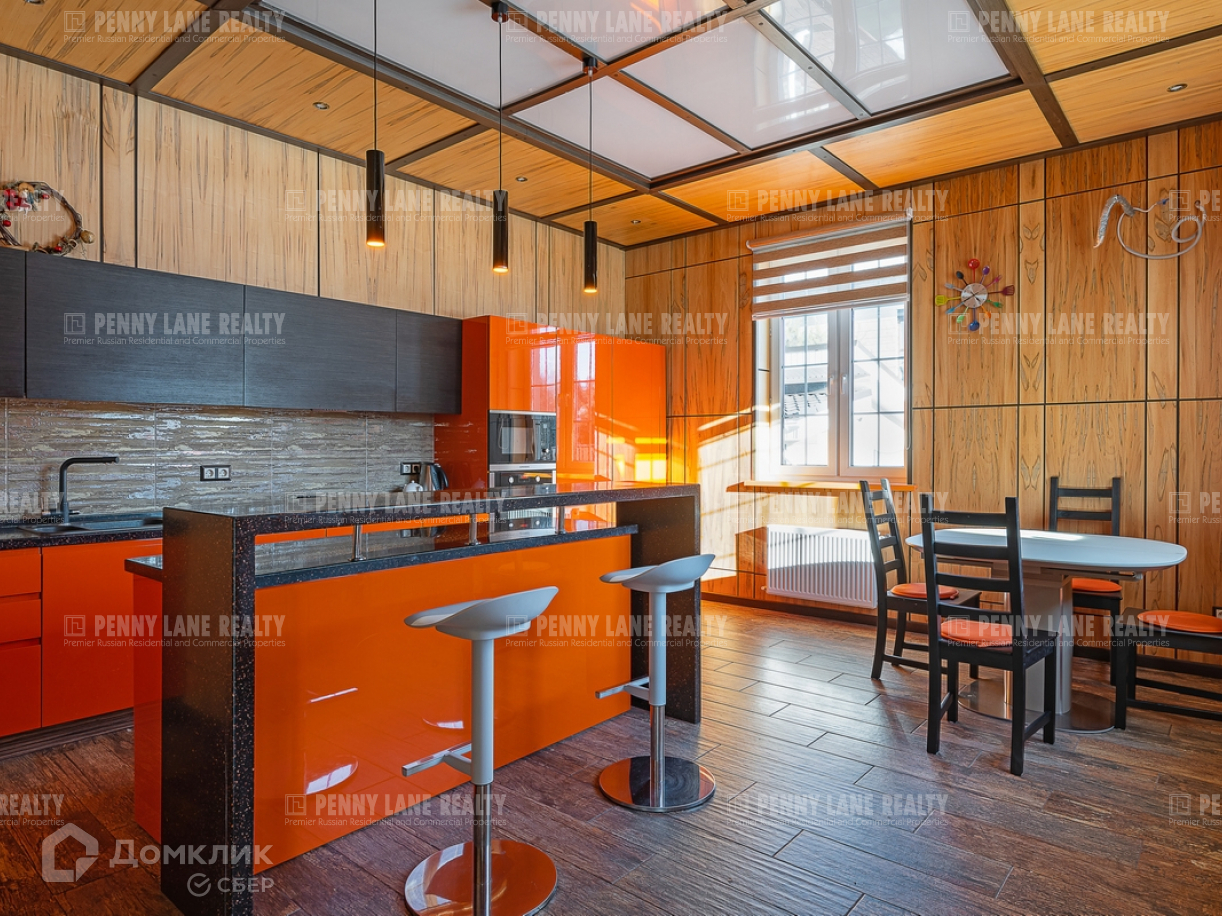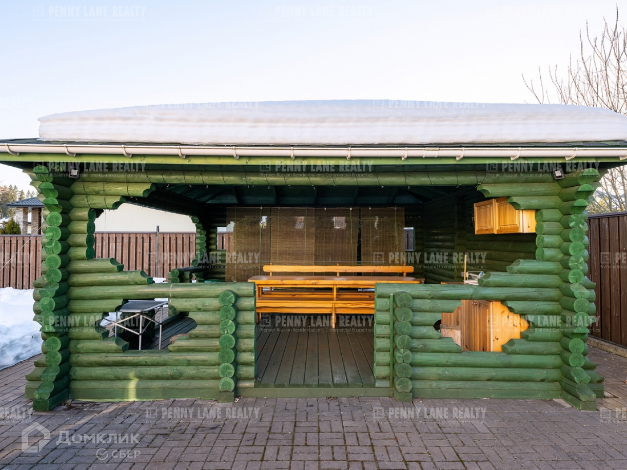 Участок правильной прямоугольной формы, с плодовыми деревьями и газоном. На территории крытая парковка на три автомобиля, хозяйственный домик, просторная летняя кухня со столом на 10-12 человек, мангал, тандыр.
