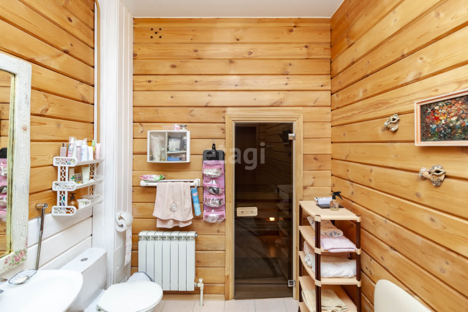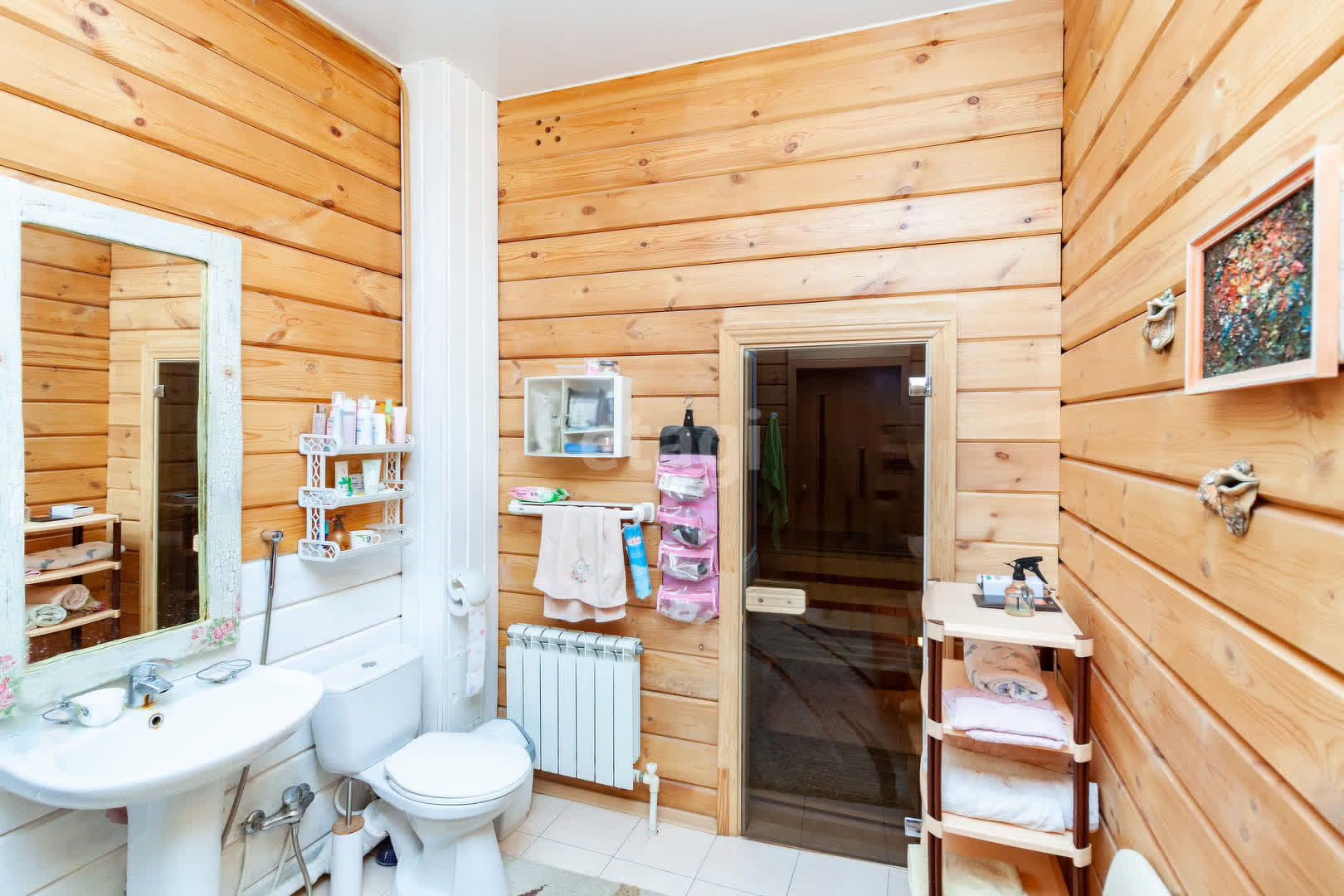 Так же на 1 этаже расположен просторный санузел с душевой, из которого есть вход в  сауну, где очень удобно погреться, расслабиться не выходя из дома.