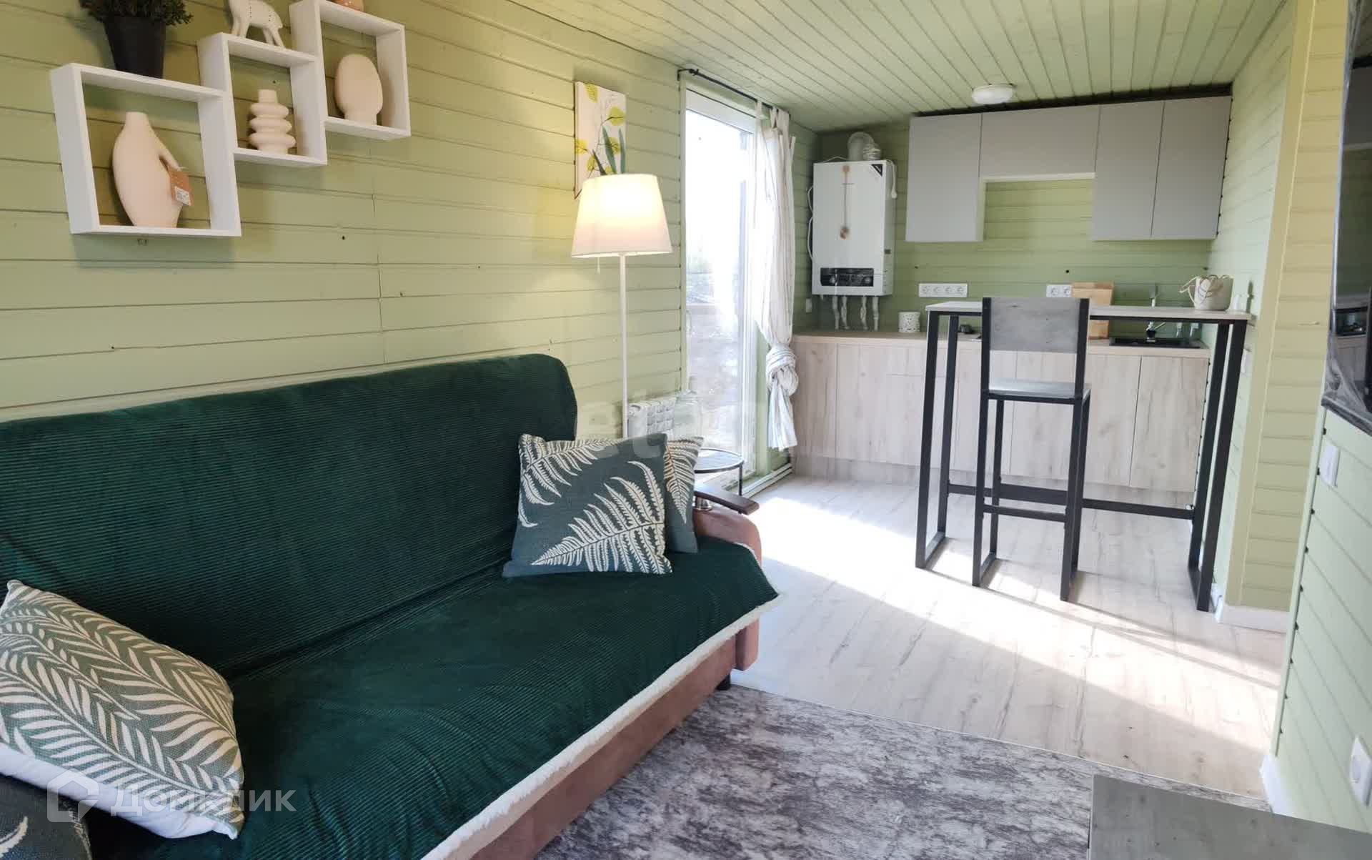 Общая площадь 40 кв.м., вместе с террасой, 10 соток земли. Одна комната плюс кухня-гостиная, санузел совмещенный в плитке, на полу - ламинат, двухконтурный котел.