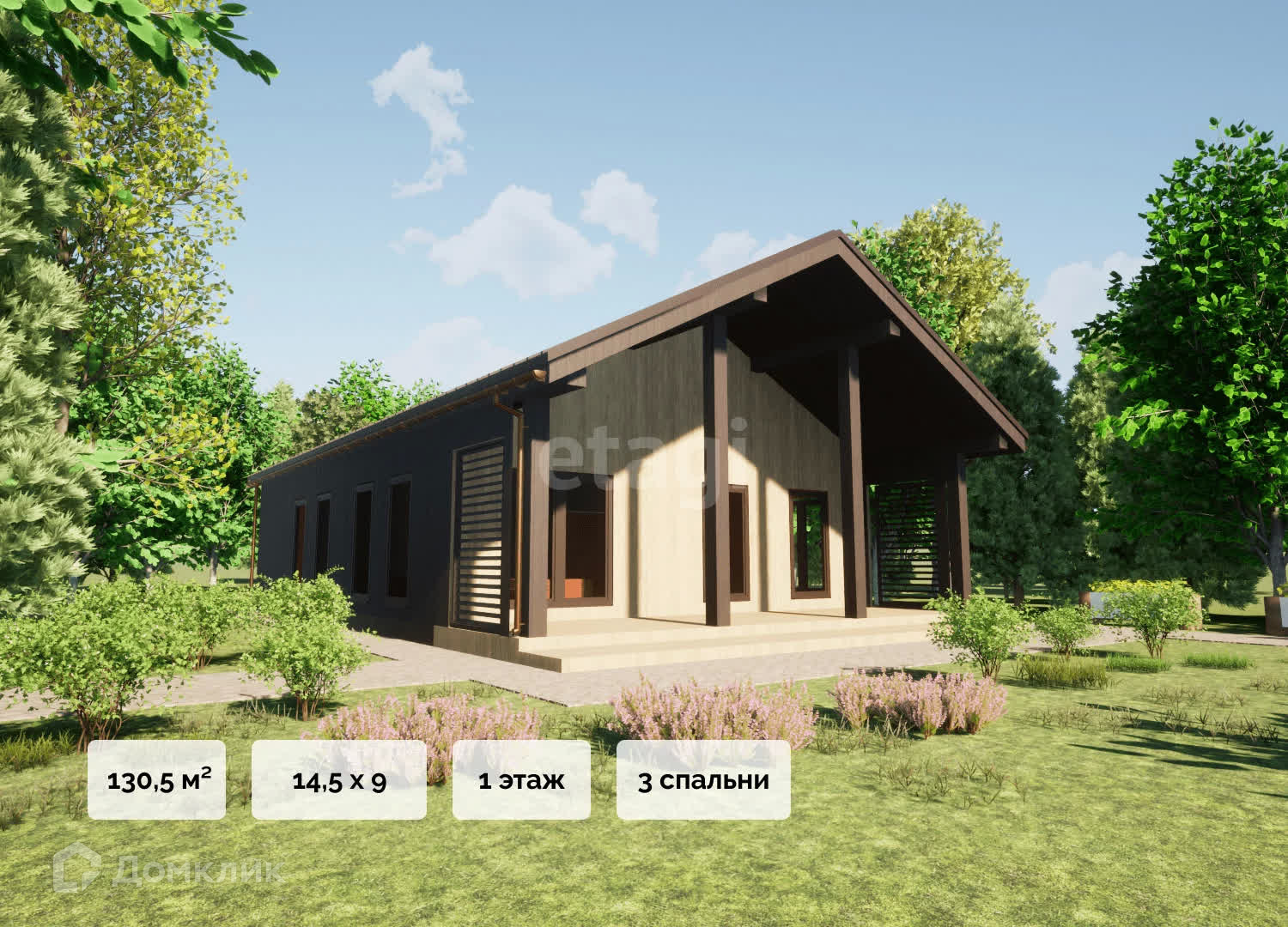 Предлагается дом площадью 130,5 кв.м. Дом выполняется по каркасной технологии и предназначен для круглогодичного проживания. Комнаты в доме: спален - 3, кухня-гостиная - 1, С/У совмещённый - 1, гардероб - 1. Терраса с навесом.
