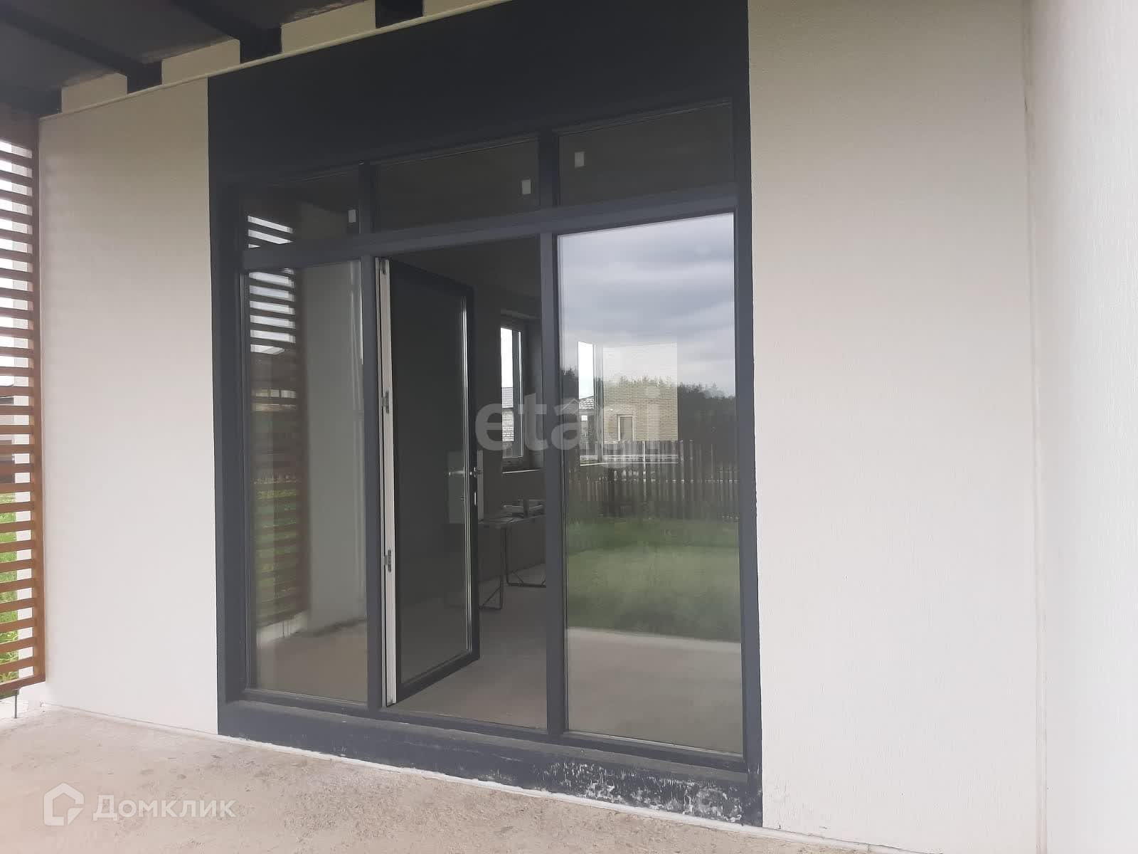 большая гостиная с панорамным остеклением и выходом на террасу