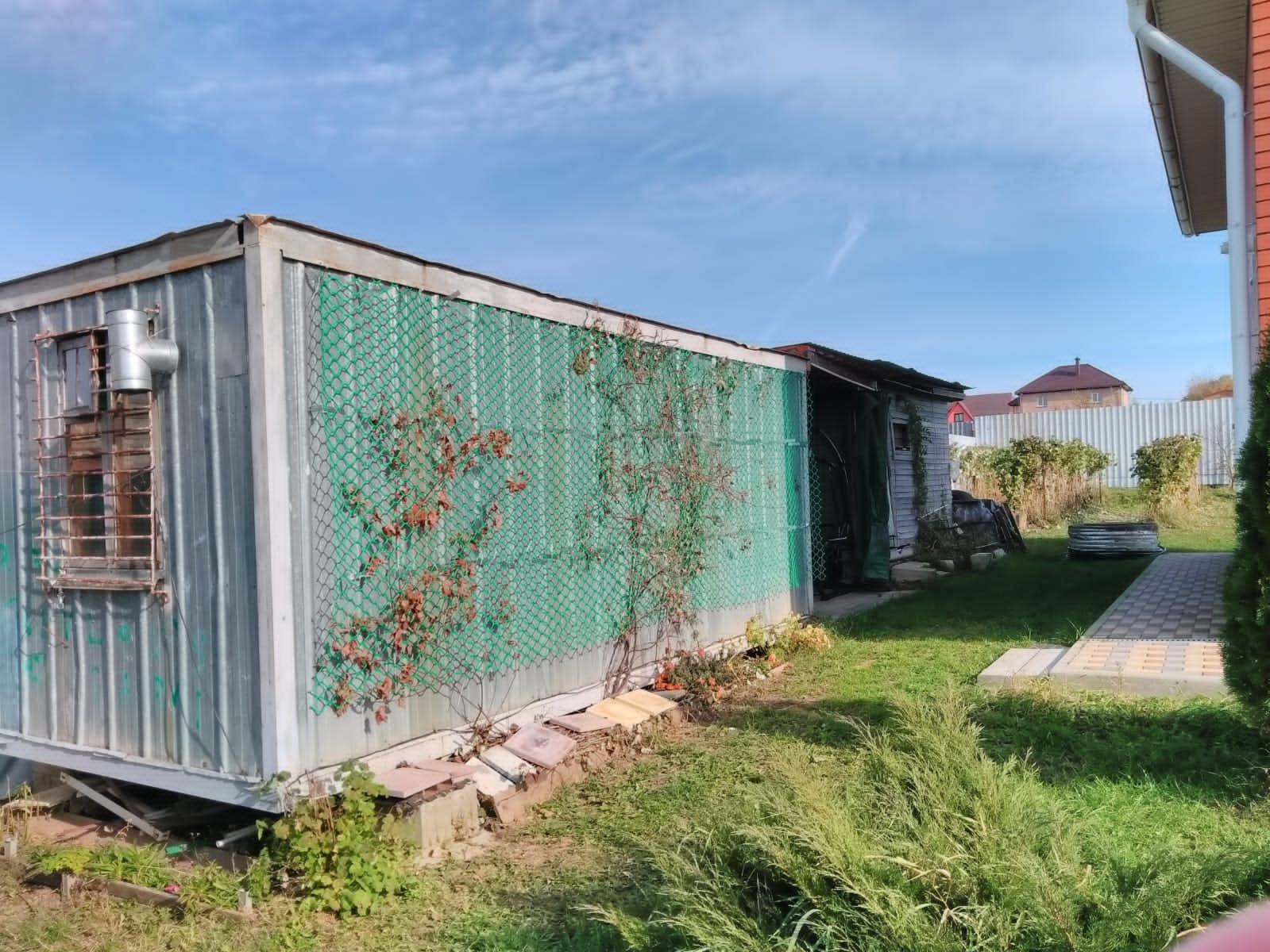 Есть посадки плодово-ягодных и декоративных культур. Есть хозблок для инструментов.