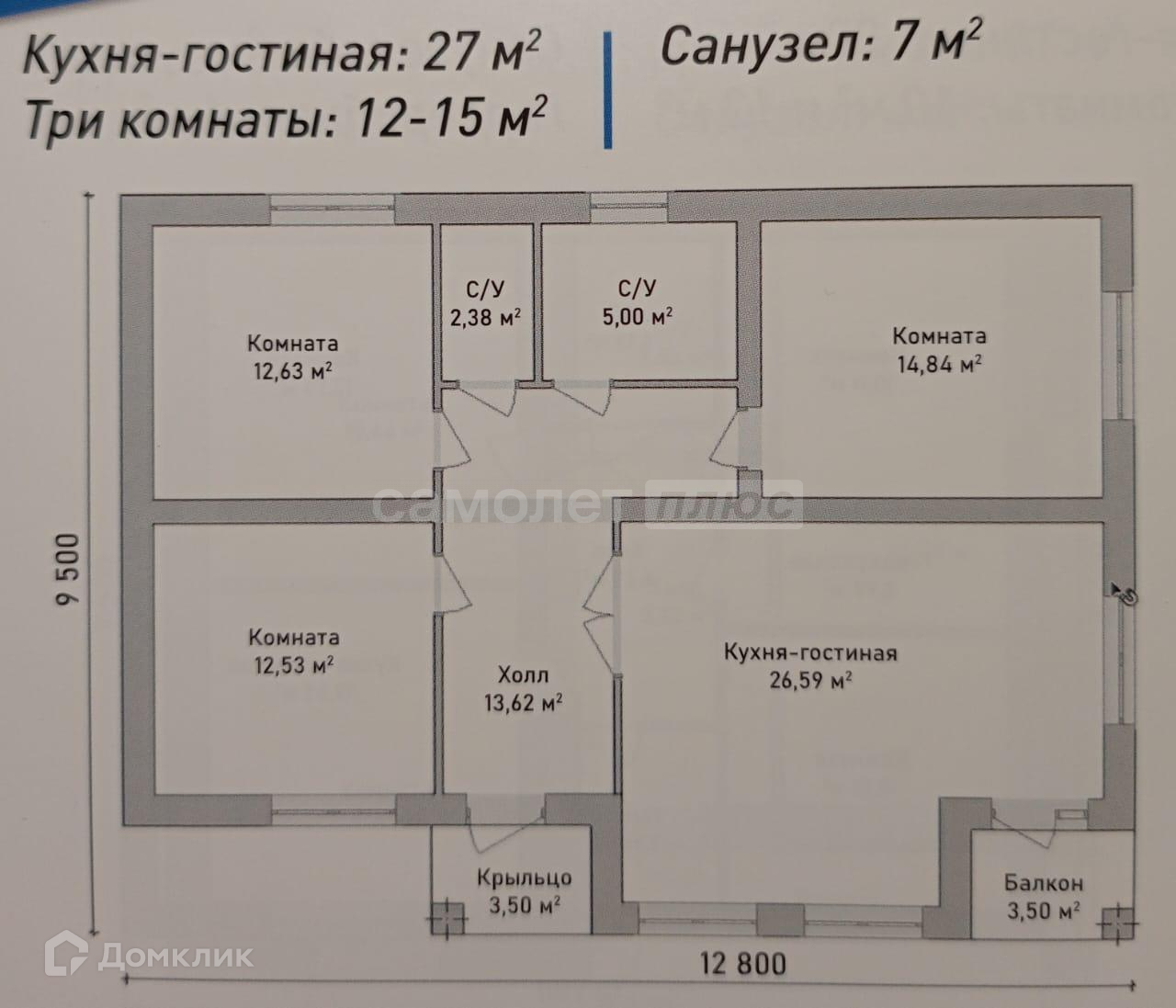 105 кв.м., кухня-гостиная 26,5 кв.м., три комнаты 12-15 кв.м., два санузла 2 и 5 кв.м., крыльцо и балкон 3,5 кв..м.
