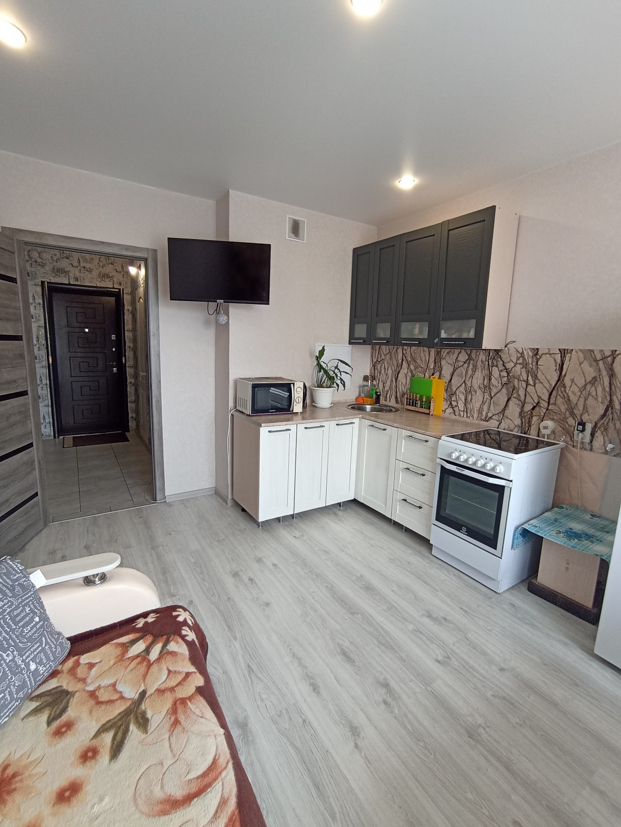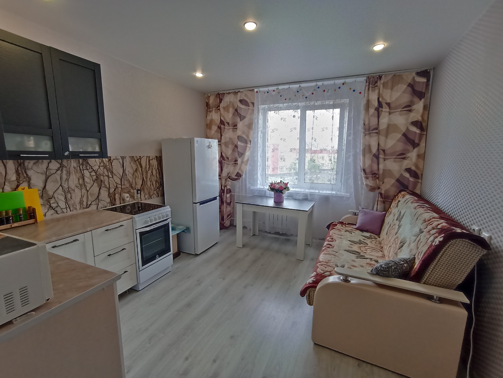Квартира в хорошем состоянии : окна ПВХ,на полу а комнате и кухне качественный ламинат, в коридоре плитка, натяжные потолки.