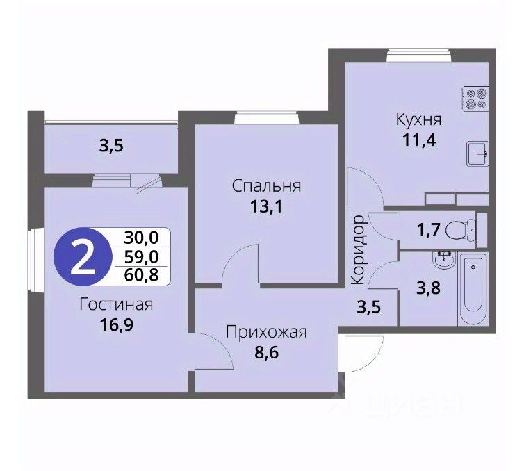 Общая площадь 59.4 м2