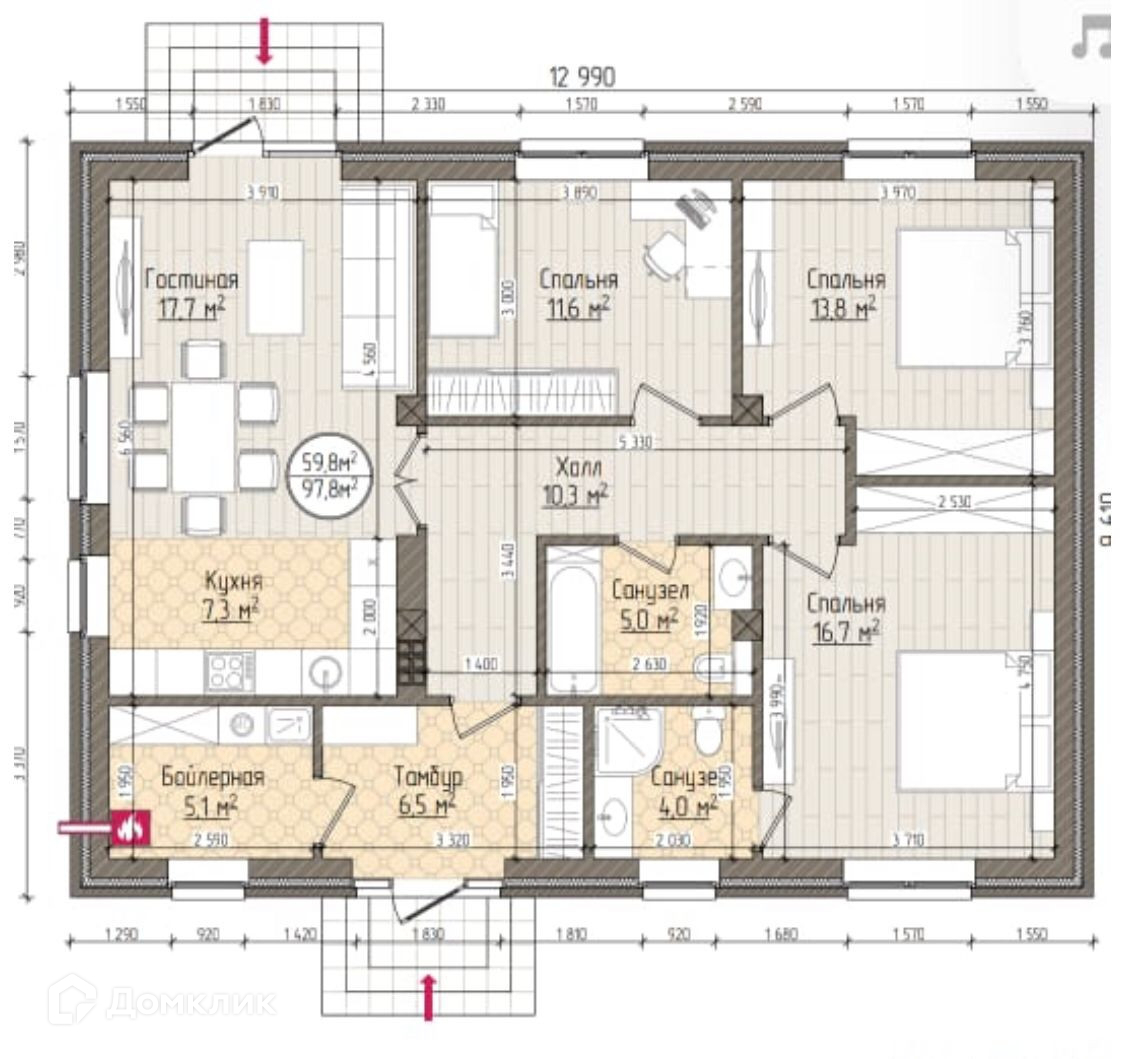 Как заходим, по левую руку располагается бойлерная с возможностью установки сан узла (гостевого), в тамбуре есть две ниши под гардероб, далее по холлу попадаем в просторную и светлую кухню-гостиную общей площадью 25 кв.м, с возможностью выхода на террасу. Вы только представьте, как теплыми летними вечерами будете уютно проводить там время в кругу близких и родных. Выходим из кухни, и идем прямо по холлу, с левой стороны 2 спальни - 11,6 кв.м и 13,8 кв.м также с предусмотренными нишами под гардероб, с правой стороны спальня 16,7 кв.м со своим сан узлом 4 кв.м, и отдельный сан узел 5 кв.м.