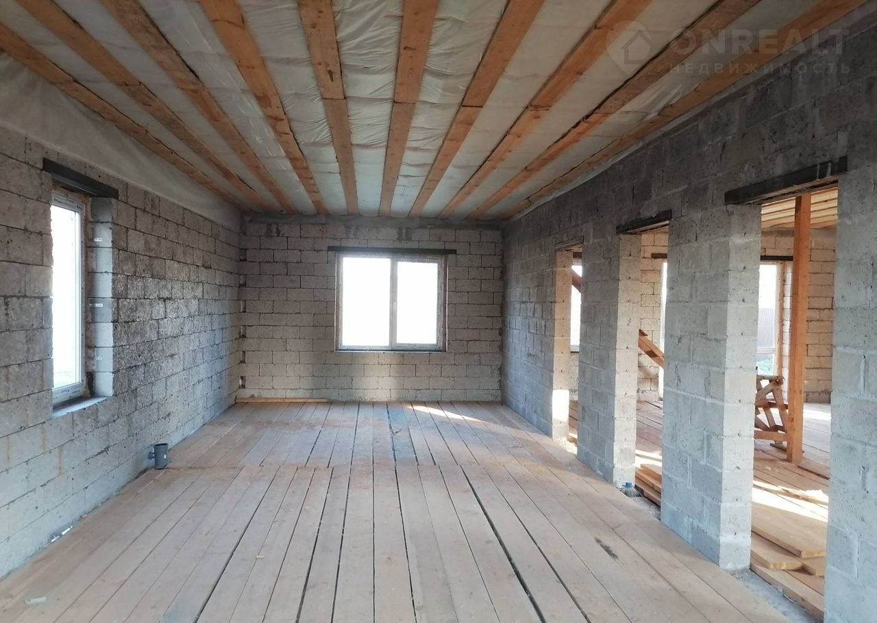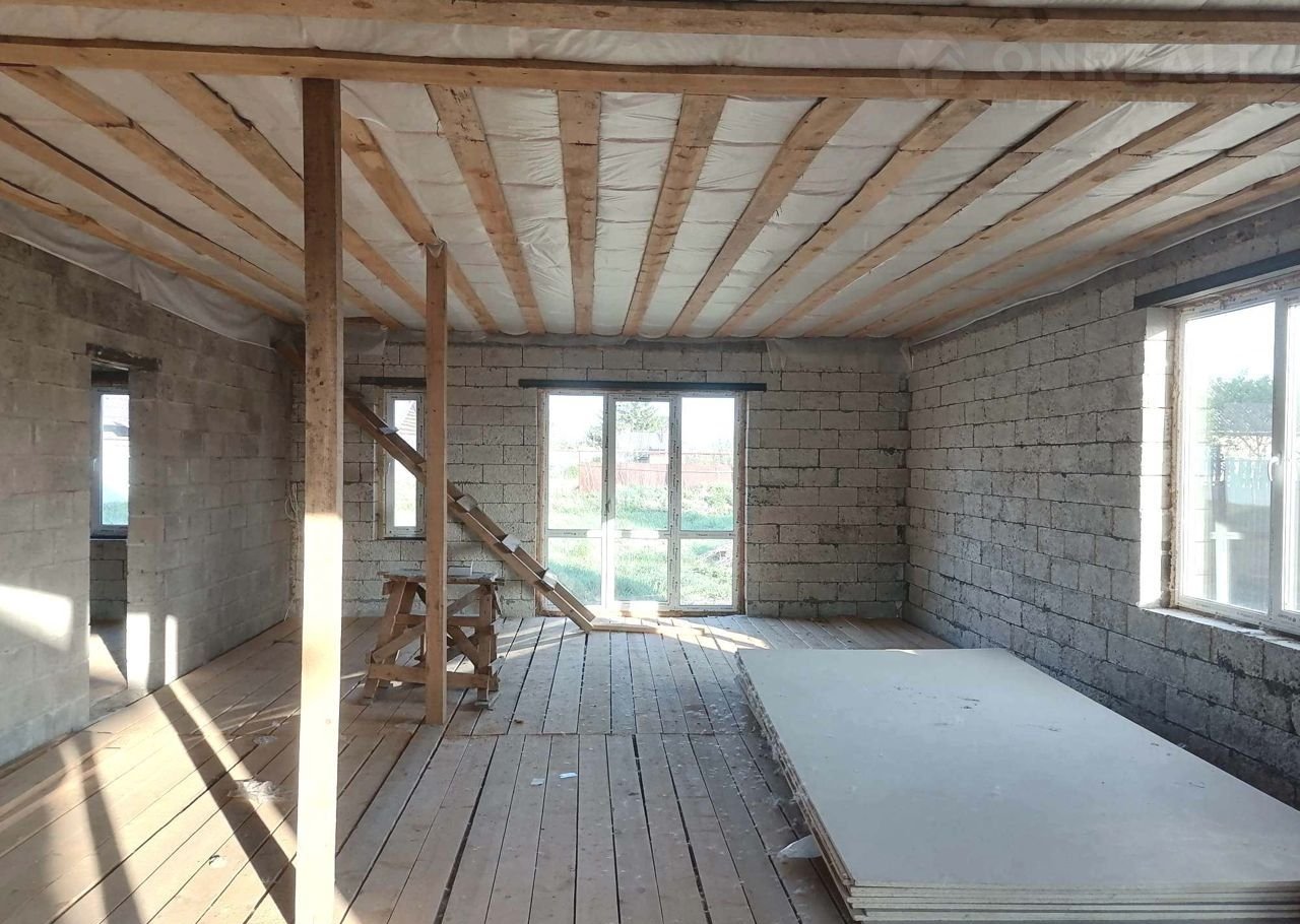 Планировка дома свободная, гостиная с панорамным окном и выходом на террасу, три комнаты, санузел, бойлерная. В дом заведено электричество, канализация, газ проходит по границе участка. Готовый колодец и шамбо.