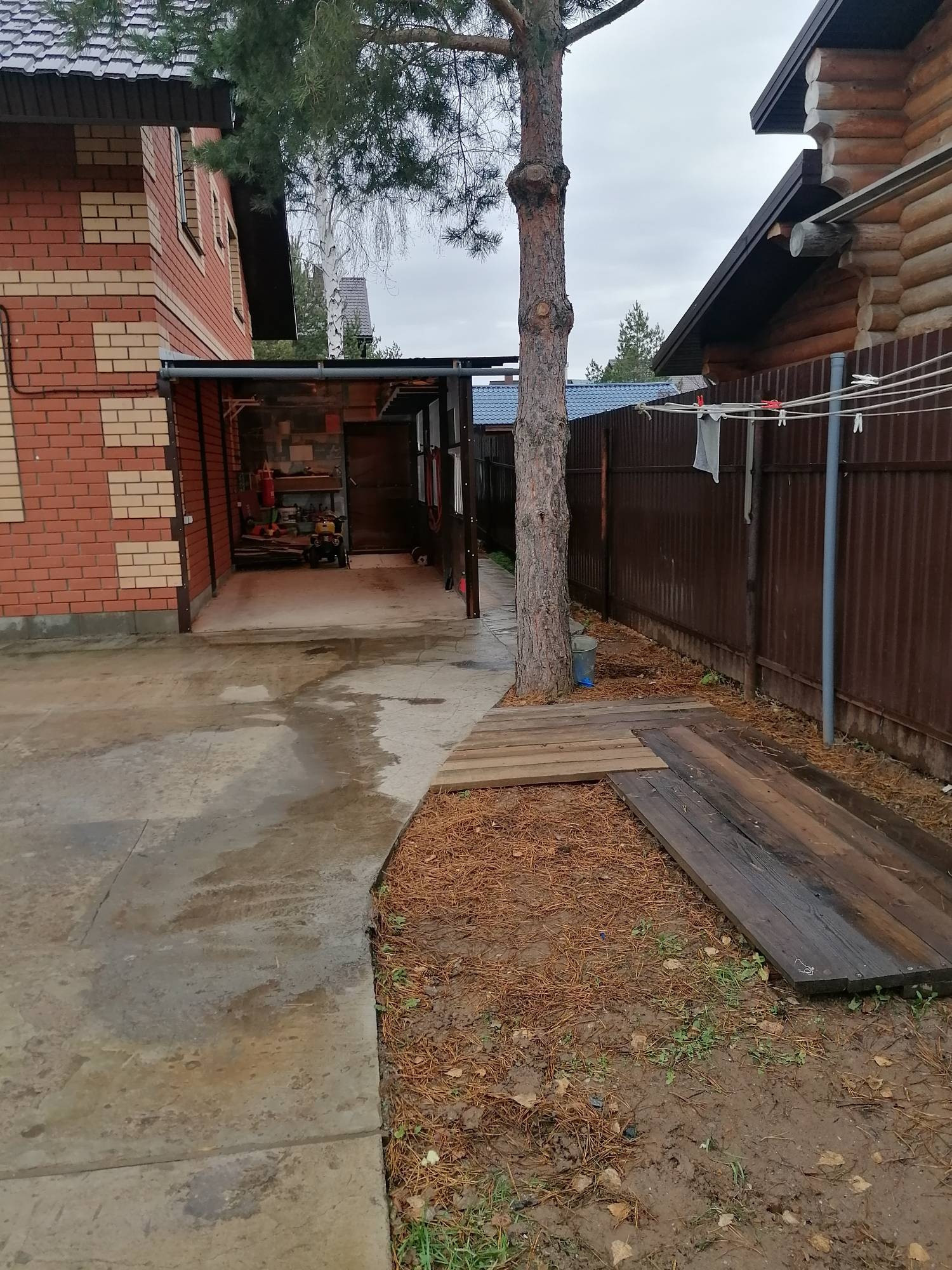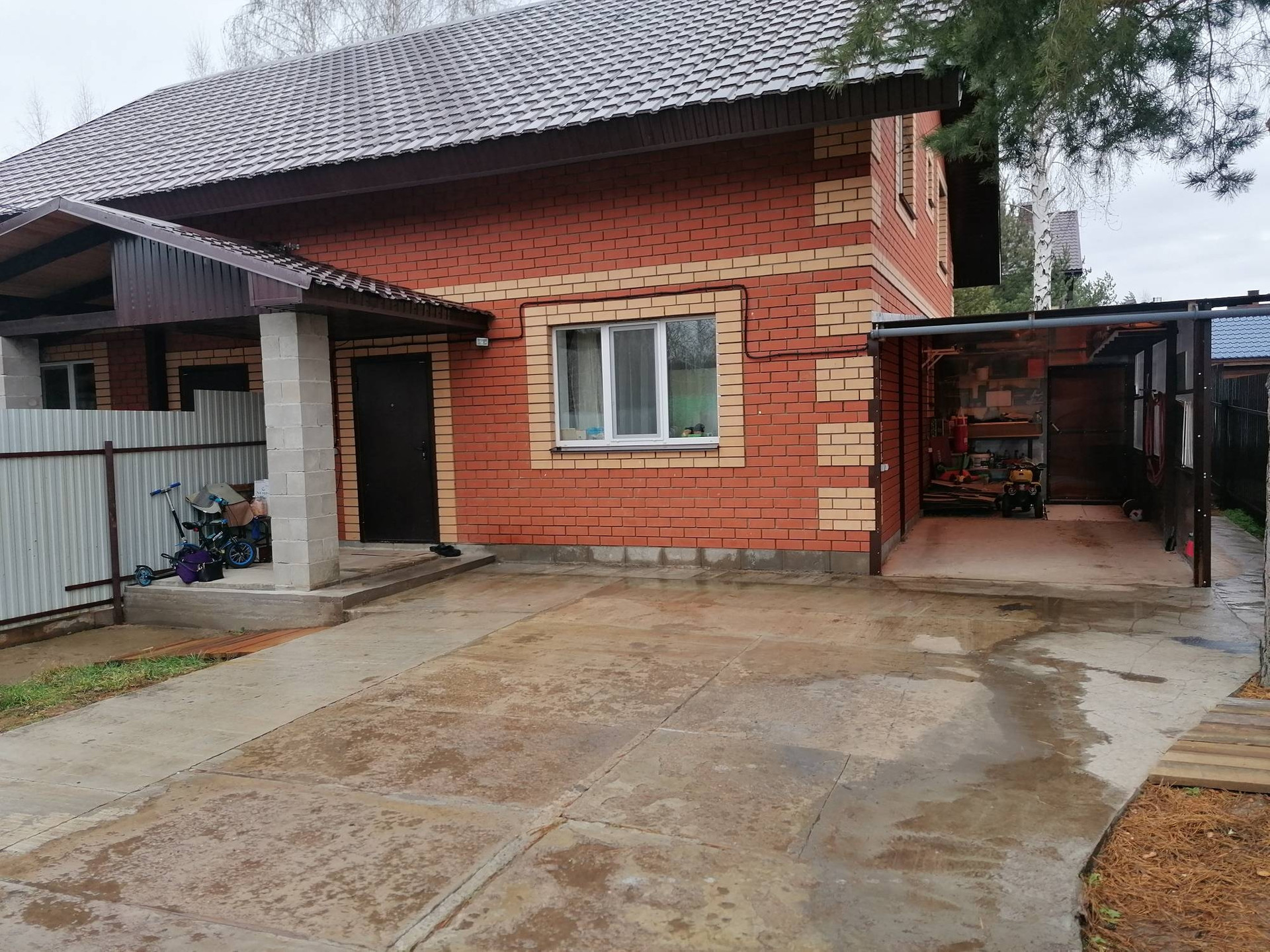 Дом огороде забором, во дворе сделан навес по машину. Входную группу во дворе залили бетоном.
