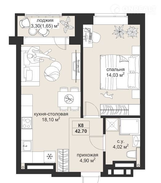 Общая площадь 42.7 м2