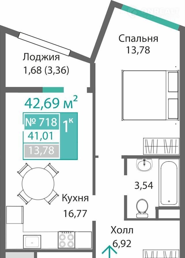 Пaрамeтры: Kомнaт: 1, Этаж 7, Общая площaдь 42.69 кв. м, Жилая плoщадь 13.78 кв. м,