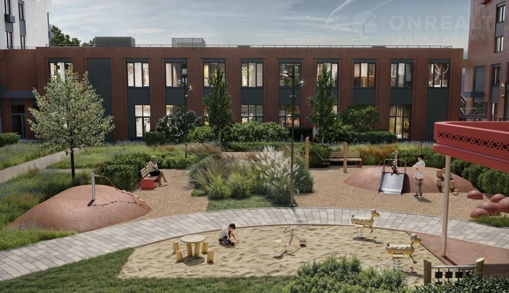 Газон, где приятно заниматься босиком, легкий навес «переездного» соседский центр. Площадка с тренажером и зона для мини-футбола.