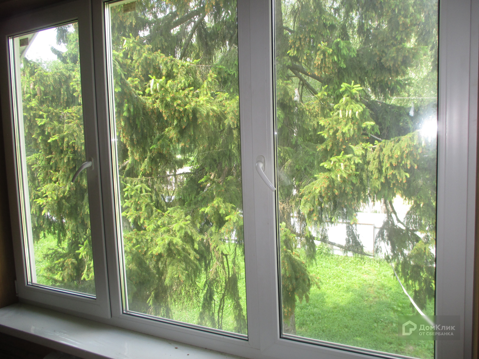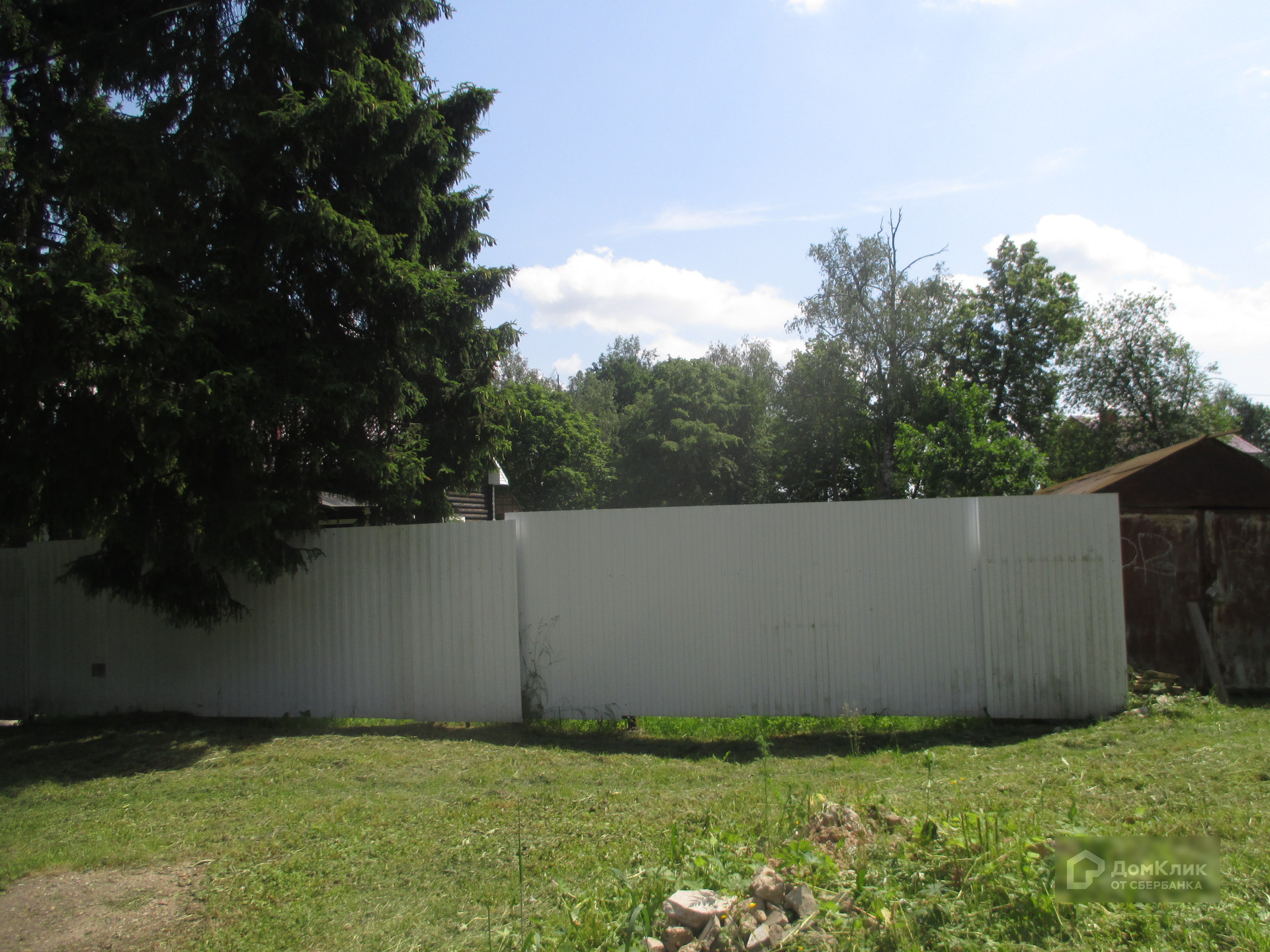 Земельный участок 15 соток, практически квадратный, сухой. На участке две большие ели. Участок огорожен забором из металлопрофиля.