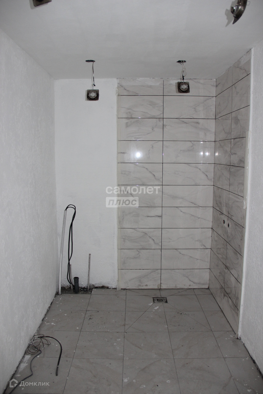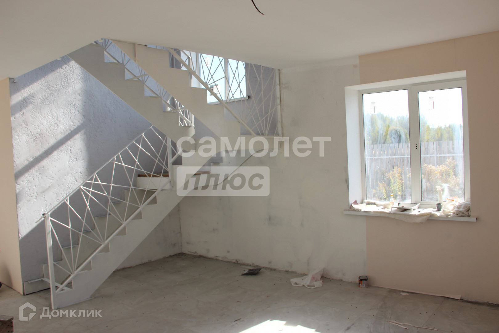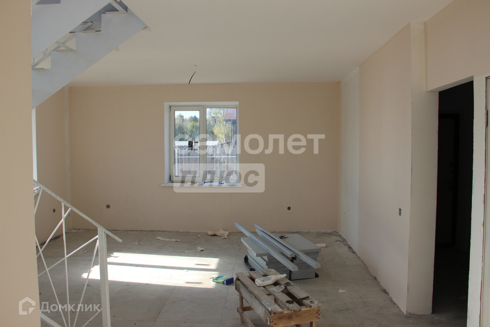 на первом этаже - выровнены полы и уложена плитка, оштукатурены стены.