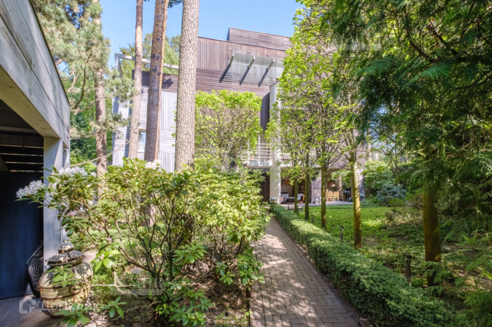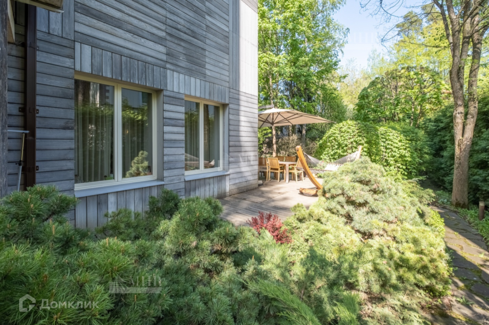 На участке сохранены корабельные сосны, ели, высажены многоствольные клены, дубы, береза, ирга, несколько видов лип, образующих аллею. Высажены многолетние кустарники и растения. Расположены детская площадка, навес на 2 м/м, к дому примыкает блок для персонала (3-комнатная квартира с санузлом, кухней и постирочной). По периметру забора высажены туи, благодаря чему обеспечивается дополнительная приватность от соседей.