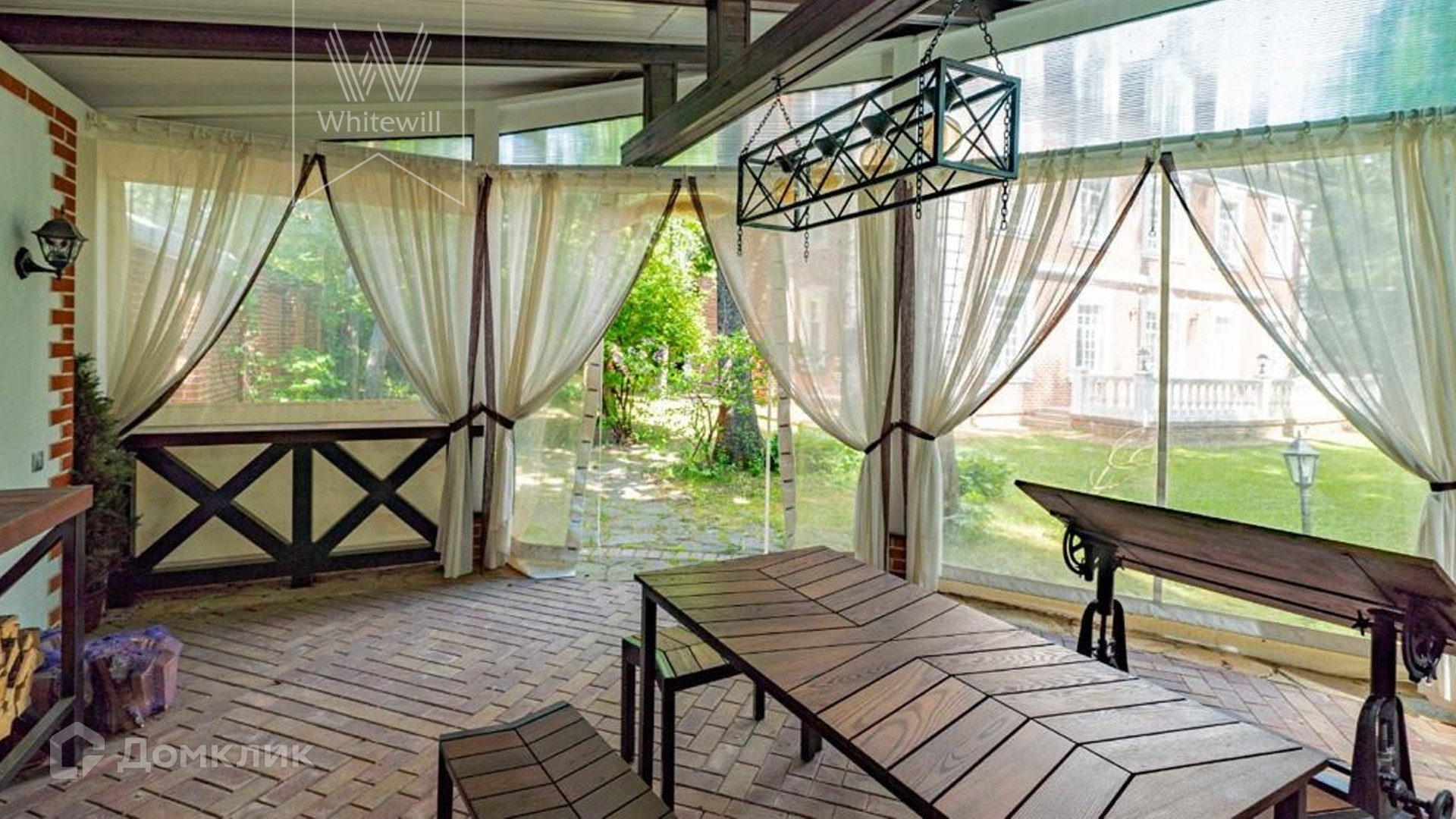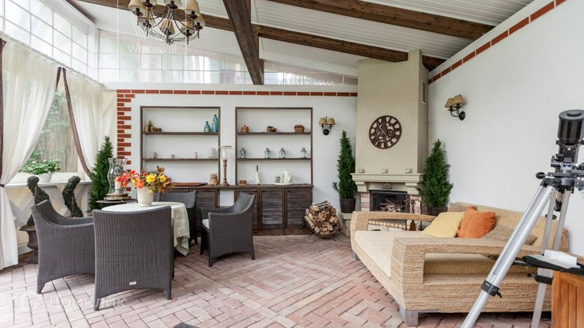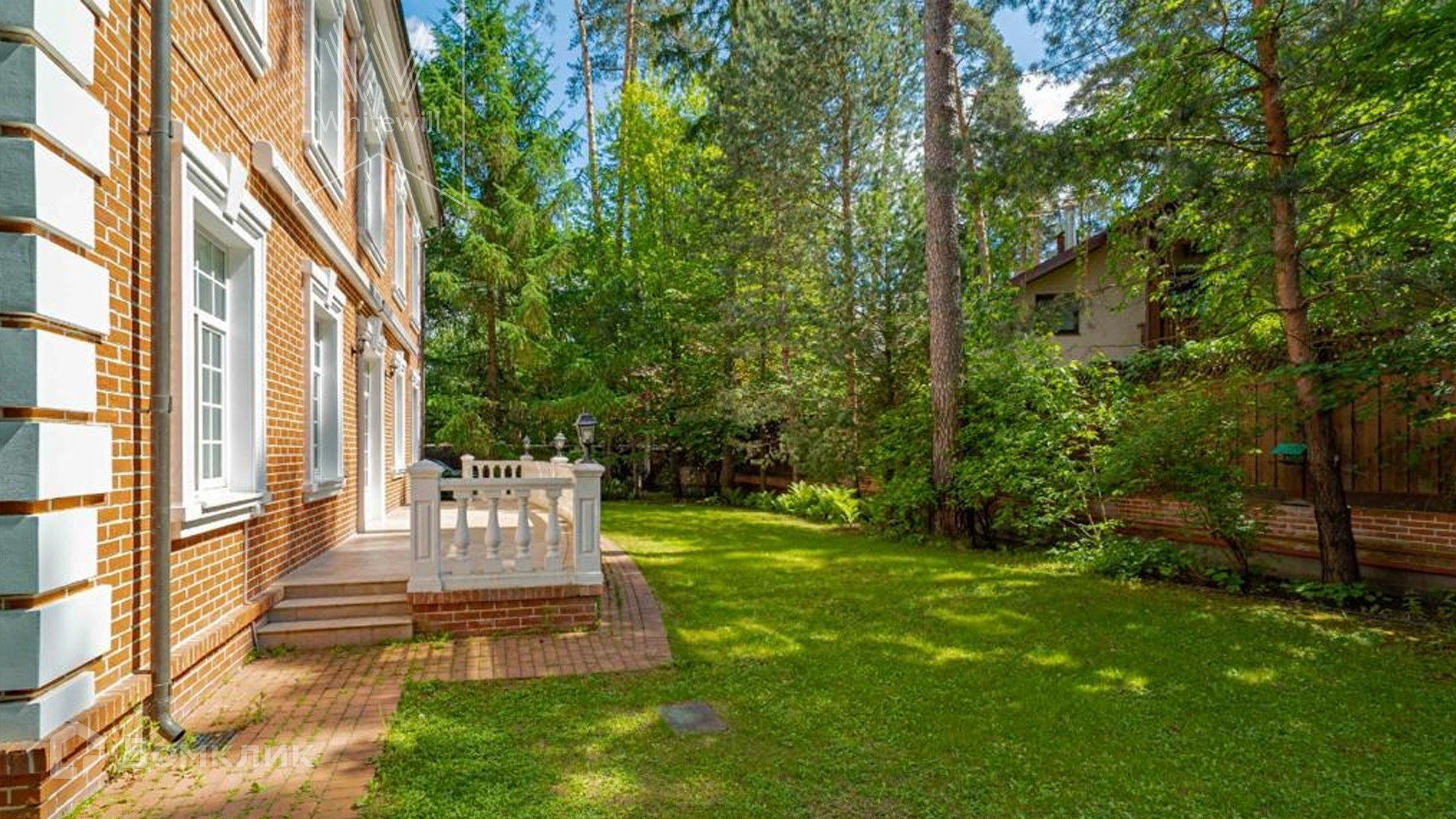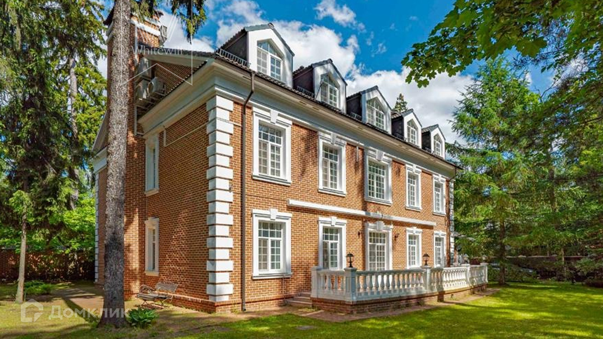 ID 9 740. Жуковка-3. Семейный загородный особняк площадью 500 м² в английском стиле расположен на ухоженном лесном участке 15 соток. Фасад дома облицован красным кирпичом и украшен белыми рустами и балюстрадой. На первом этаже — просторная гостиная с камином, столовая и оборудованная кухня. В доме спланировано 4 спальни, на мансардном этаже кабинет и библиотека с домашним кинотеатром. Интерьер выдержан в едином английском стиле с антикварной мебелью. На участке около главного дома построили летнюю беседку с камином, помещения для охраны и кладовая для инвентаря. 3 машины можно оставить на территории под навесом.