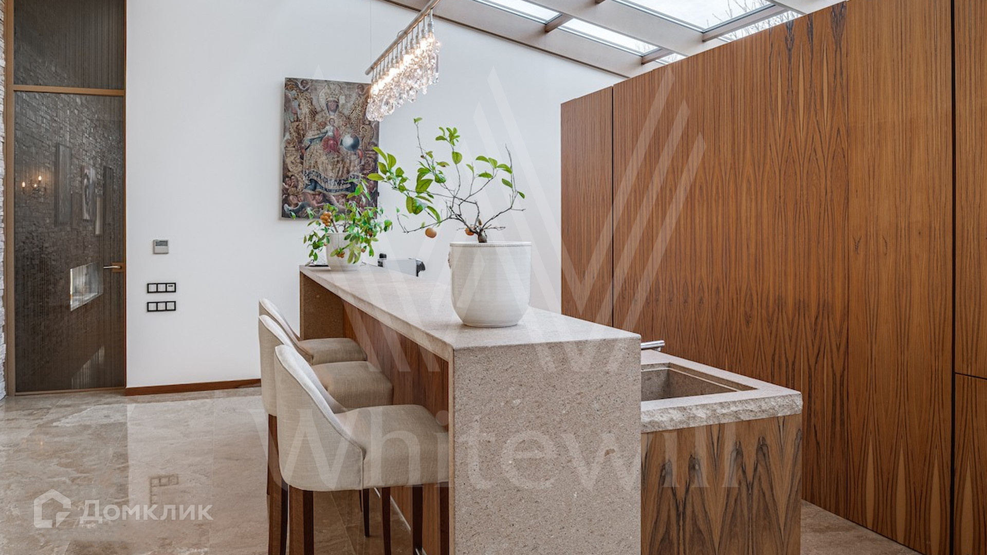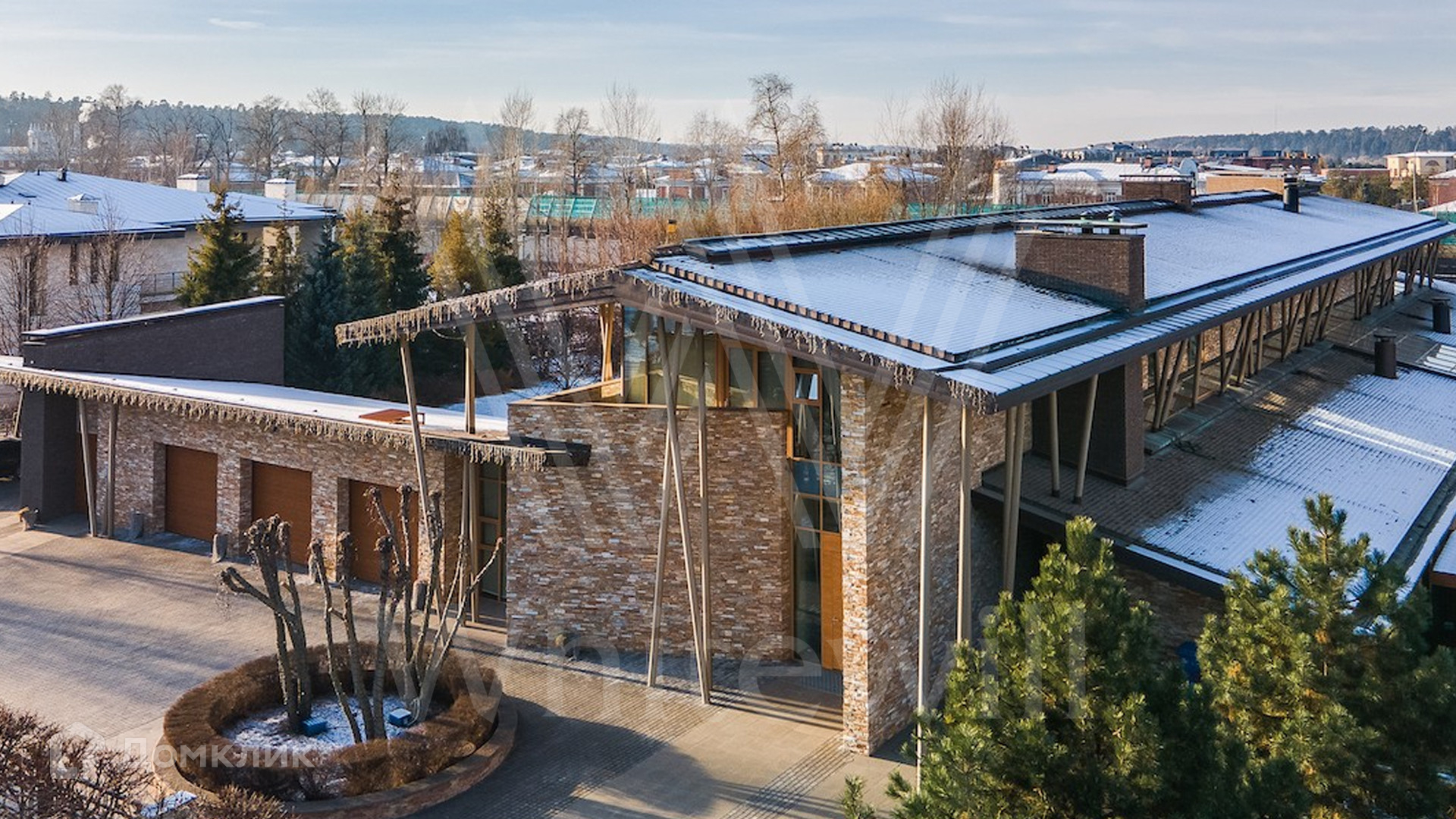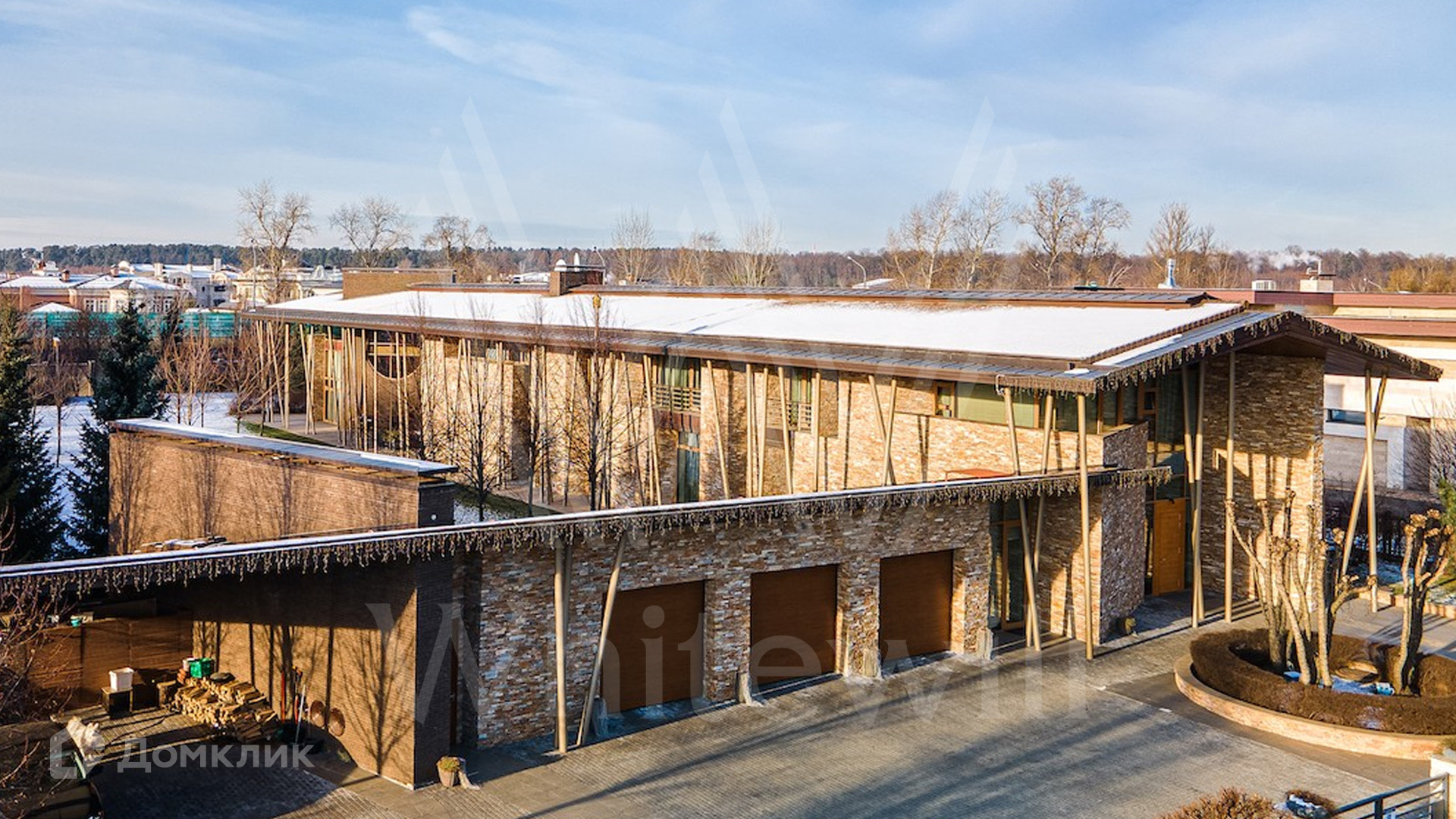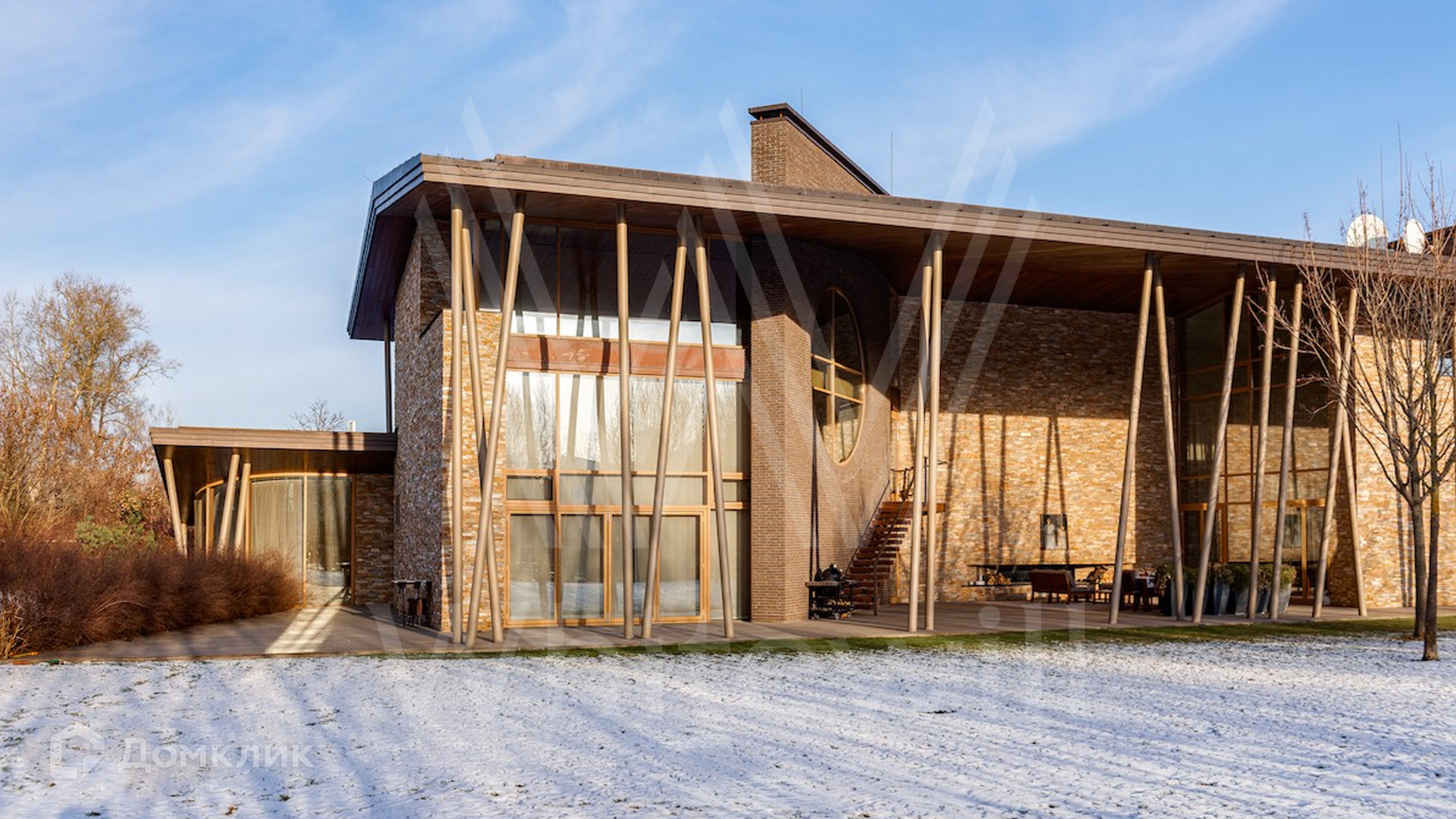 ID 9 405. Жуковка 21. Представительная загородная резиденция площадью 1 360 м² построена на полевом участке 50 соток. Необычный фасад дома облицован коричневым и бежевым клинкером, кровлю и землю соединяют тонкие стальные колонны. Интерьер резиденции выполнен в современном стиле — в отделке использовали натуральное дерево ценных пород, камень, дизайнерскую мебель, сантехнику и бытовую технику премиальных брендов. В доме спланированы просторные гостевые комнаты, гостиные, 5 спален с санузлами и гардеробными, тренажерный зал и сауна. Для персонала отведен отдельный блок с кухней. Из гостиной первого этажа можно выйти в зону патио и на участок. Для 3 машин предусмотрен гараж, две гостевые машины можно оставить под навесом.